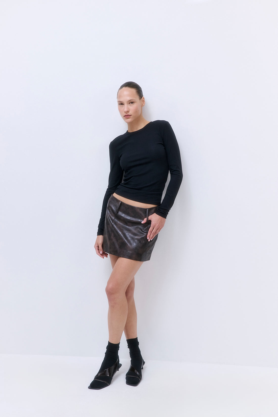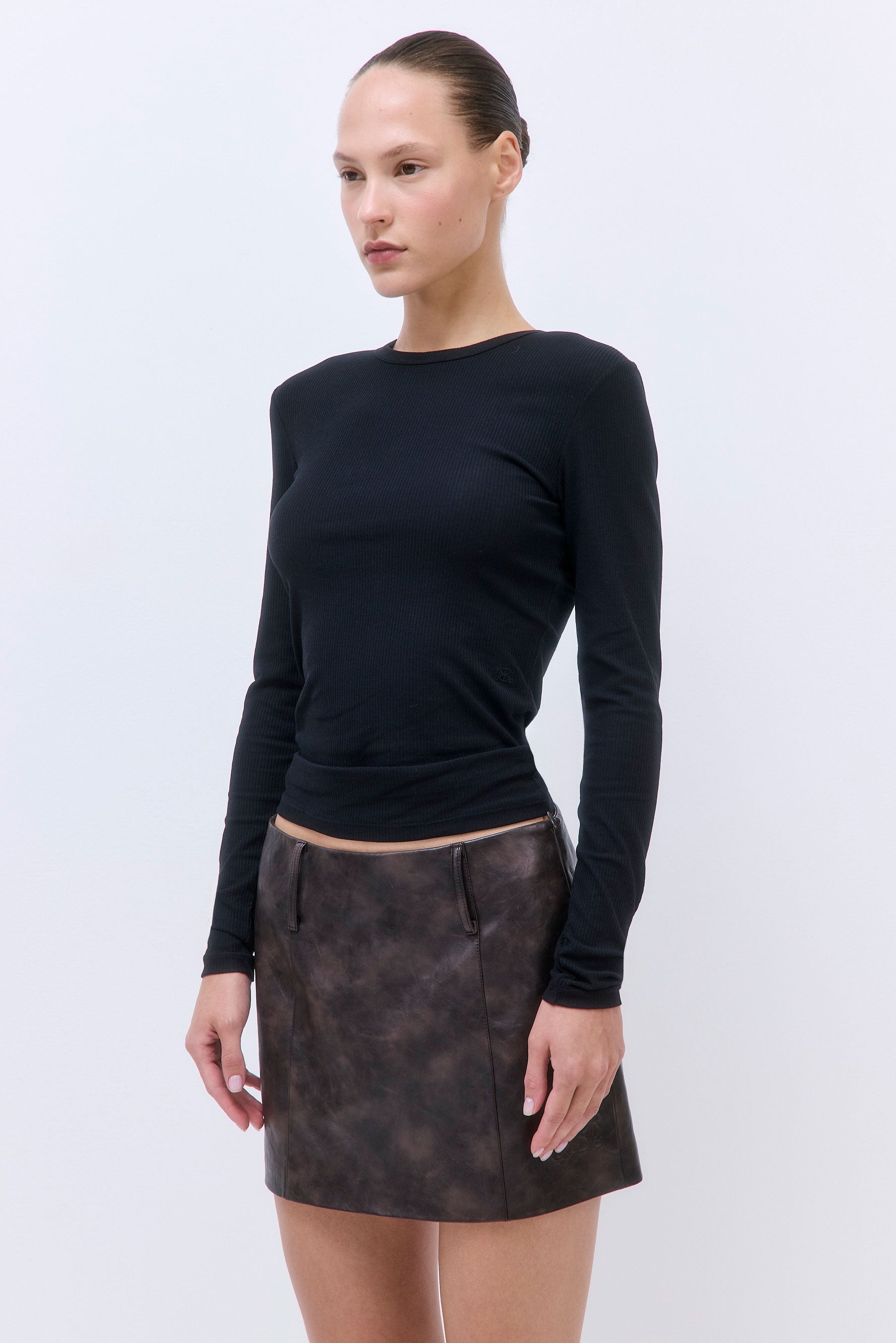 Our Classic Ribbed Fitted Long Sleeve T Shirt is a modern essential. Form-fitting without being too tight. Crew neck. Long sleeves. Tonal embroidered logo at the front side. Style it with our sleek Mid Rise Poplin Pants and elevate the look with our chic Oval Sunglasses for an upscale vibe.