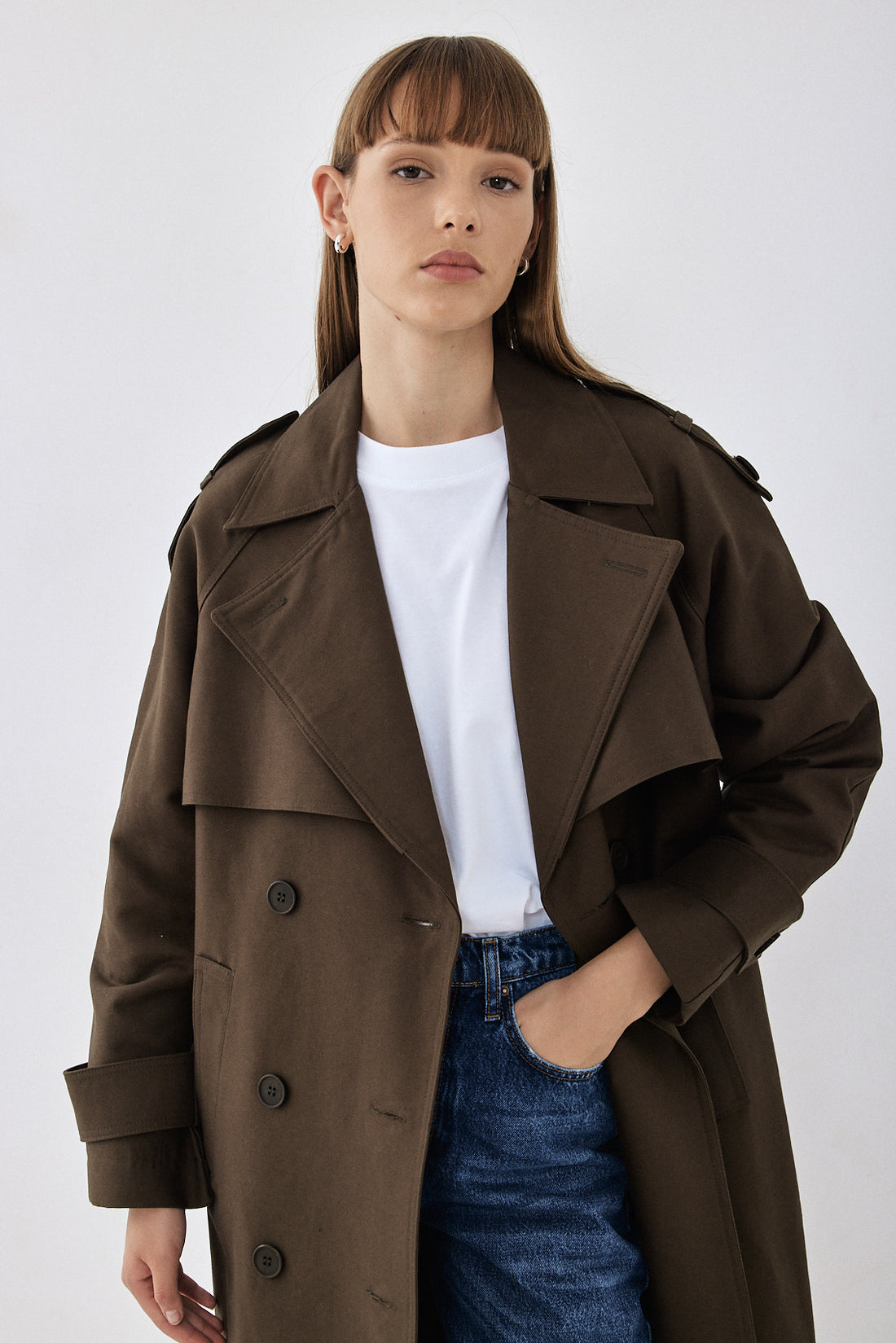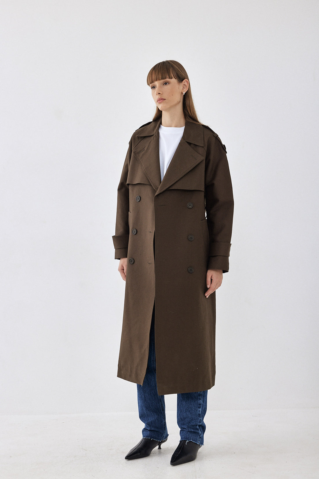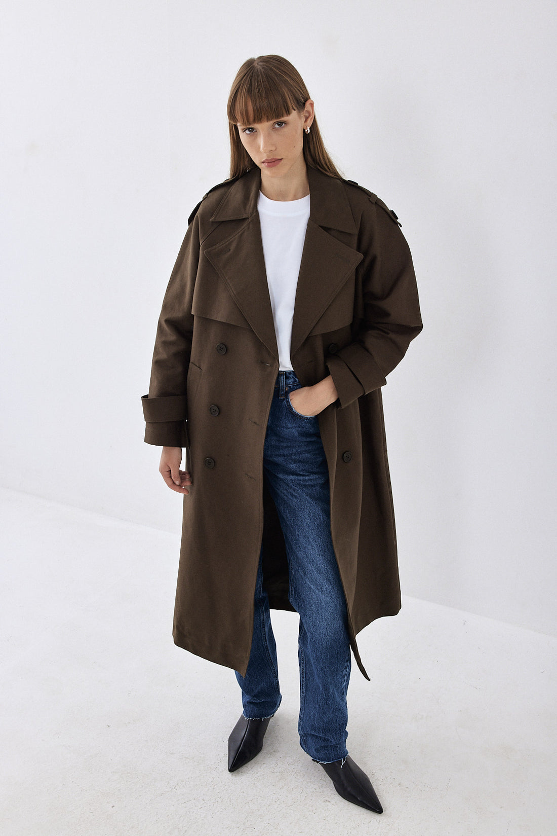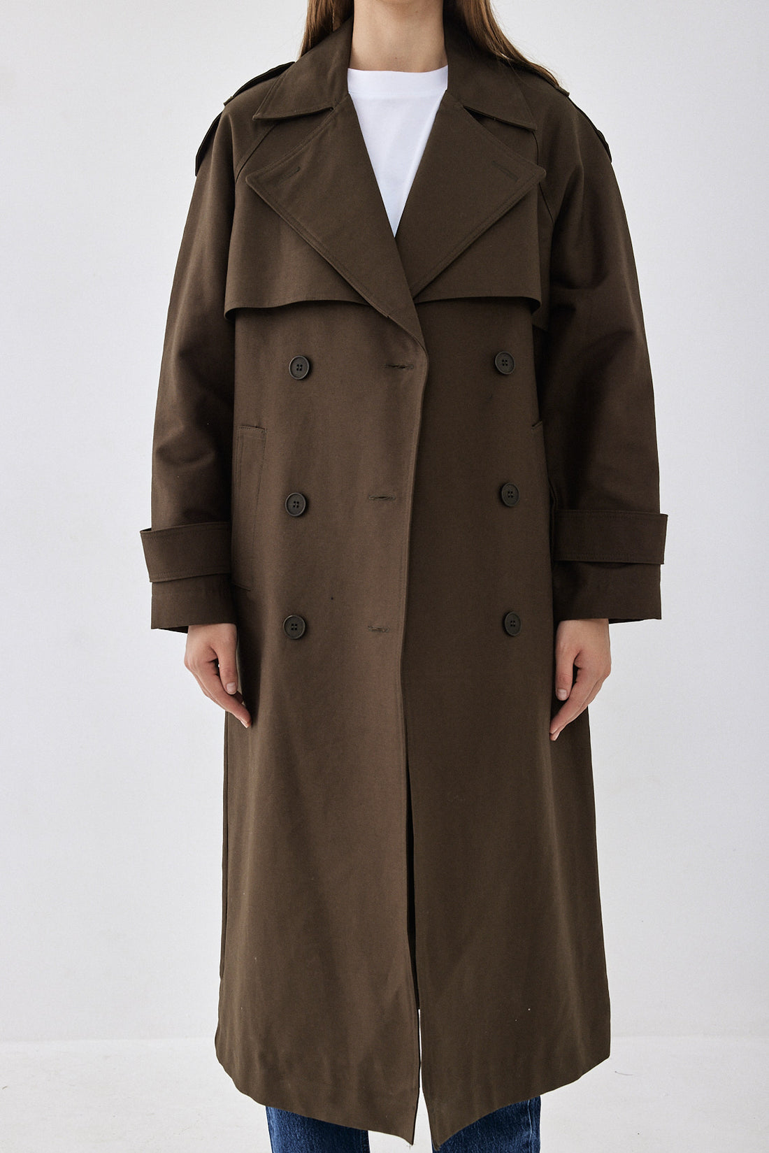 Fully lined cotton trench coat with a double breasted front. Featuring belt loops and a matching belt to define the waist. The perfect layering essential transcending seasonality, perfect in every wardrobe. Wear it over your outfit to give it that finishing touch.