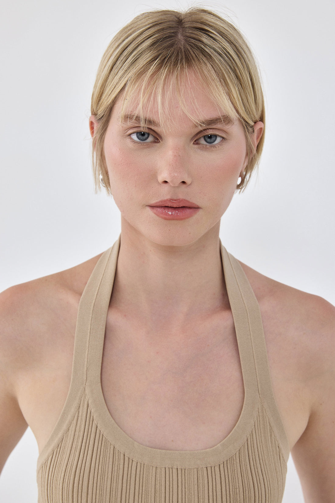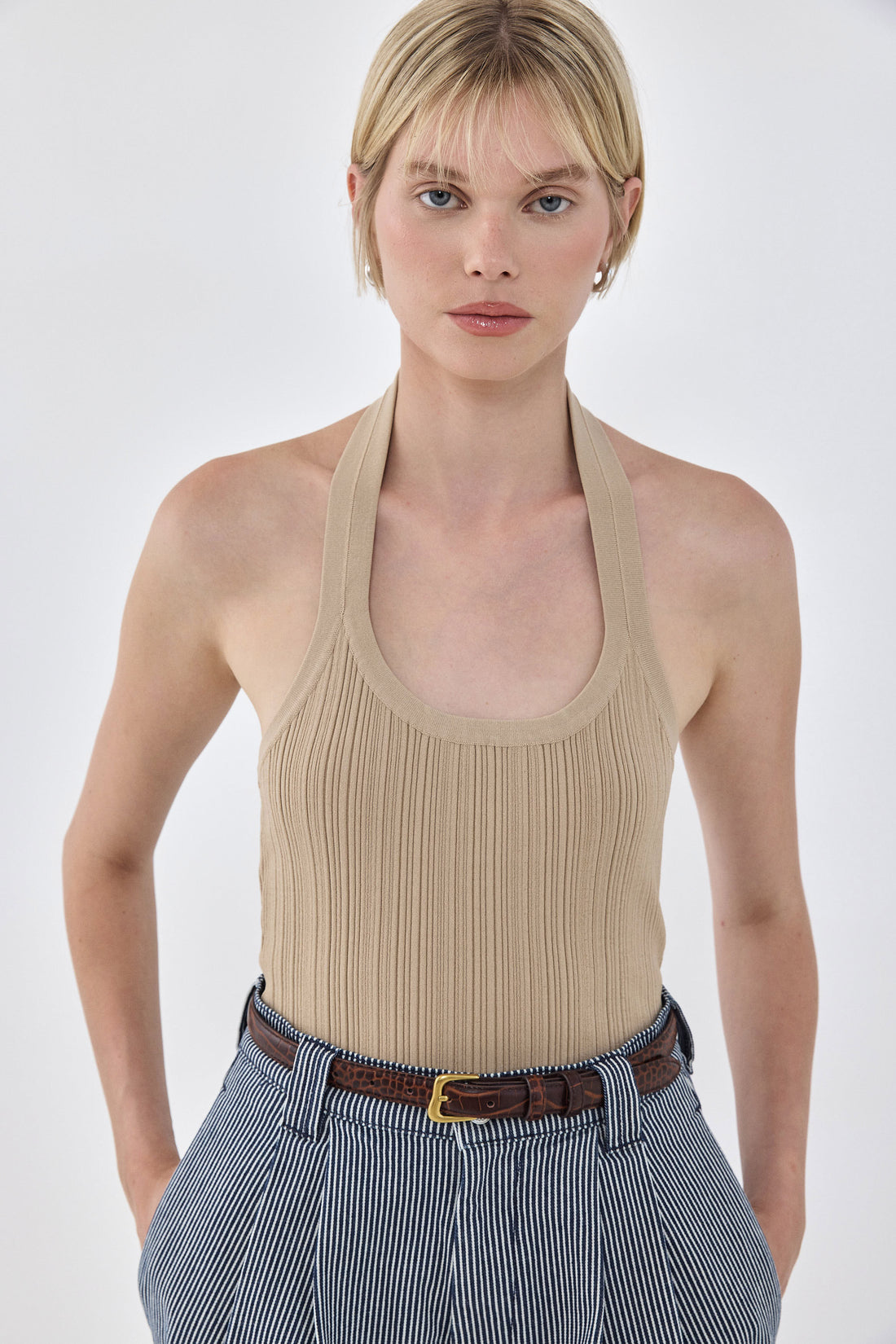 An absolute summer staple in the most flattering silhouette. Deep neck collared tank top. Slight opening at the upper back, extremely flattering. Asymmetric ribbed fabric. Hugs the body. Ribbed finish. Style it with your favorite mini skirt, Croco belt and kitten heel for a perfect day to night look.