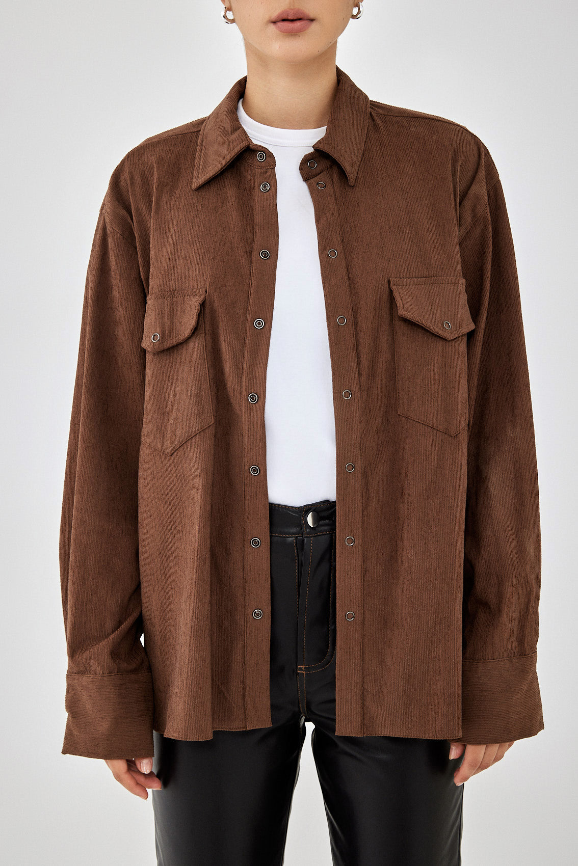 Oversized fit button up corduroy shirt. Featuring front snap buttons closure and two pockets on the front. Unlined. Match it with the corduroy shorts or A line mini skirt for the perfect everyday look.