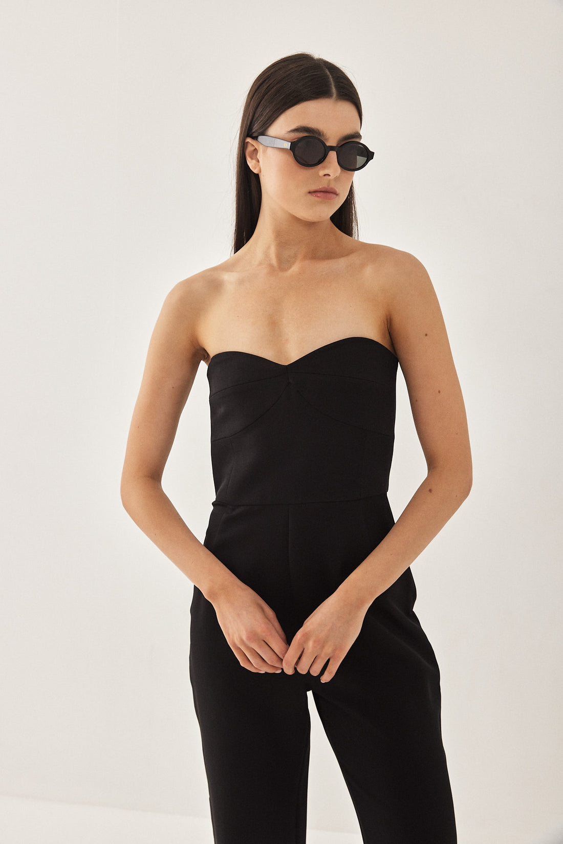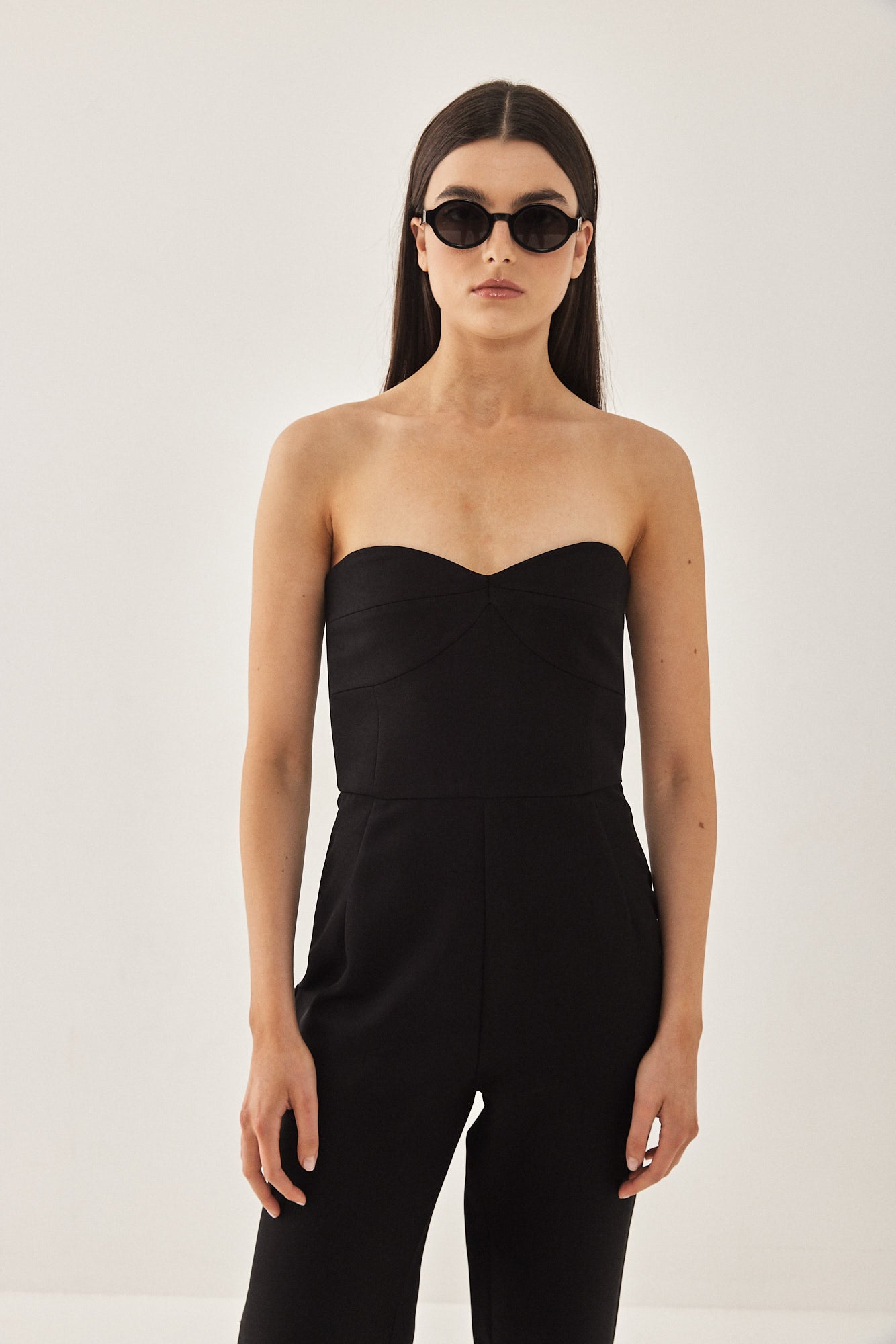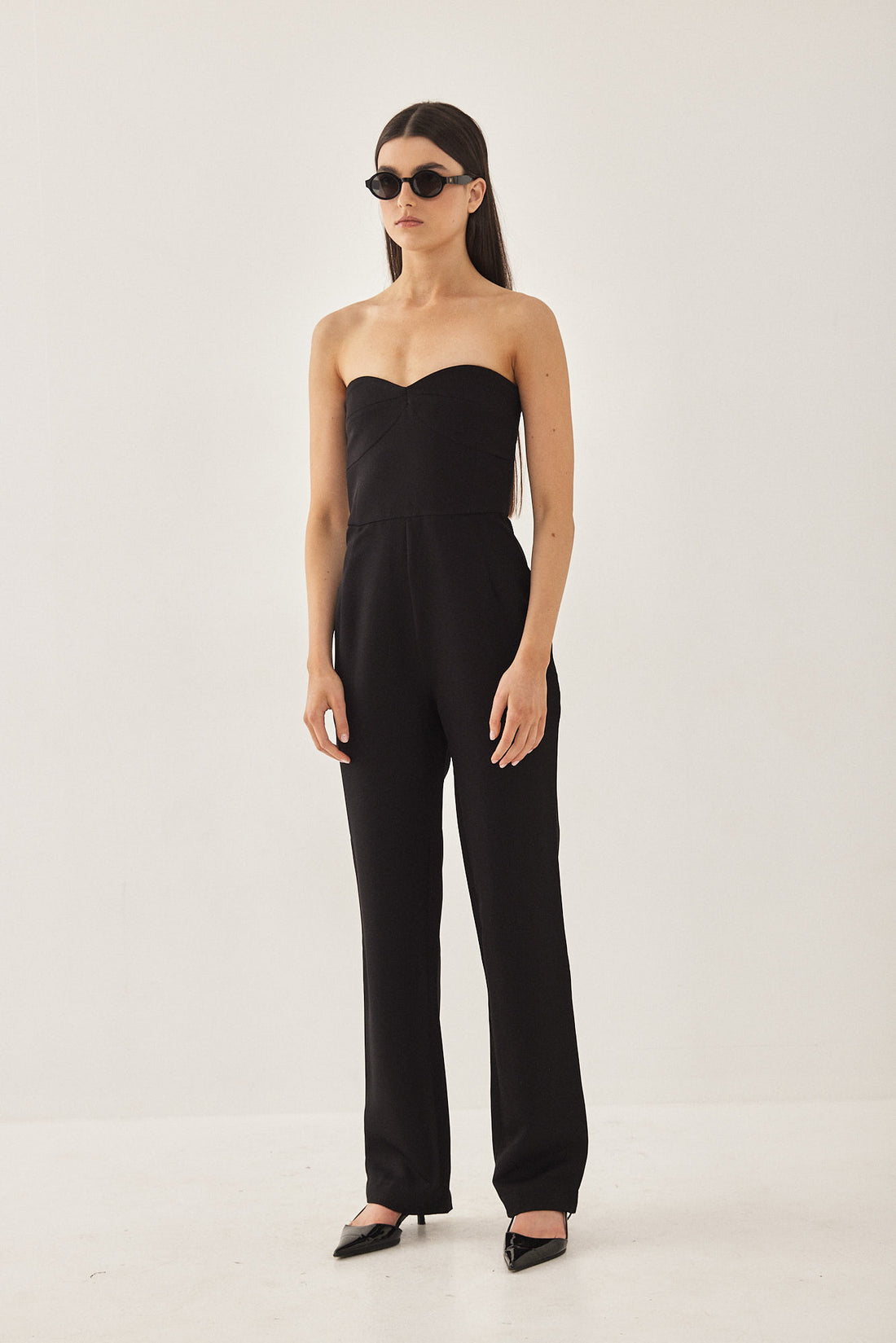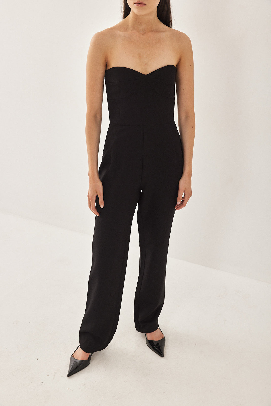 A strapless tailored jumpsuit with a corset fit top. Straight fit full length leg. Featuring a strapless neckline with a silicone strap for a better grip and a hidden zip closure. Featuring wiring at the sides for additional support. Embroidered logo at the back. Style it with a pair of earrings, a shoulder bag and a pair of sandals for the perfect going out look.