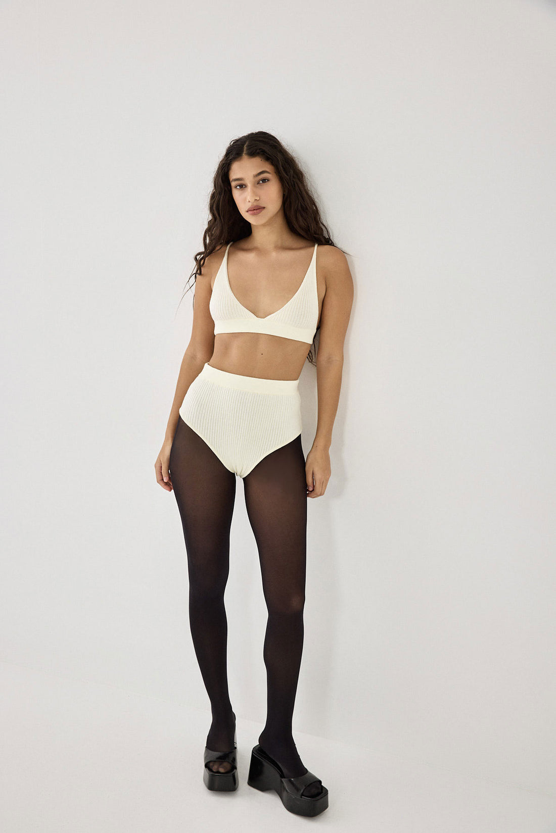 The coziest bralette you'll own. Triangle bralette. Ribbed material. Thin straps. Elastic underbust band. Logo embroidery detailing at the back of the band. Style it with the matching cozy panties, throw the cozy cardigan on top and get ready to bundle up in the coziest set.