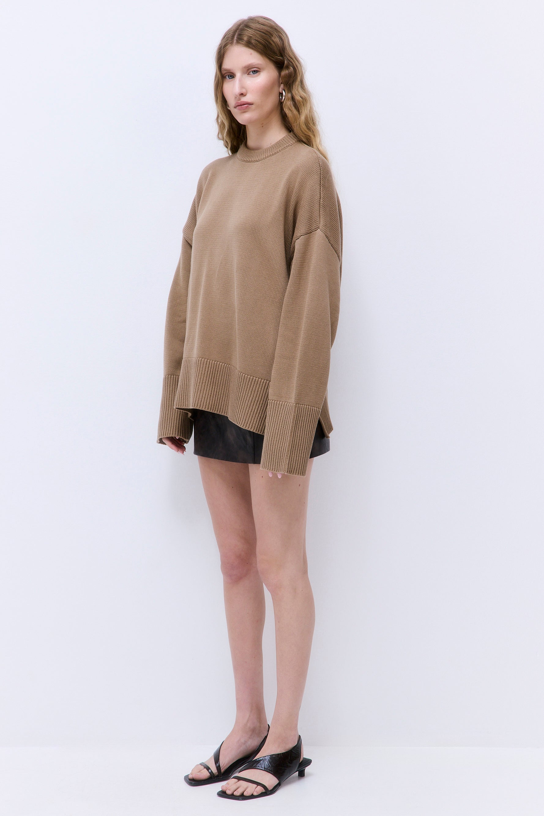 The perfect cozy winter essential. Crew neckline. Oversized fit. Slits on the side. Dropped shoulders. Wide rib hem. Tonal silicon logo on the back. Fully fashioned. Style it with our with our chic Sheer Midi Skirt and pair these with our iconic Yvon Shoulder Bag for an effortless everyday look.