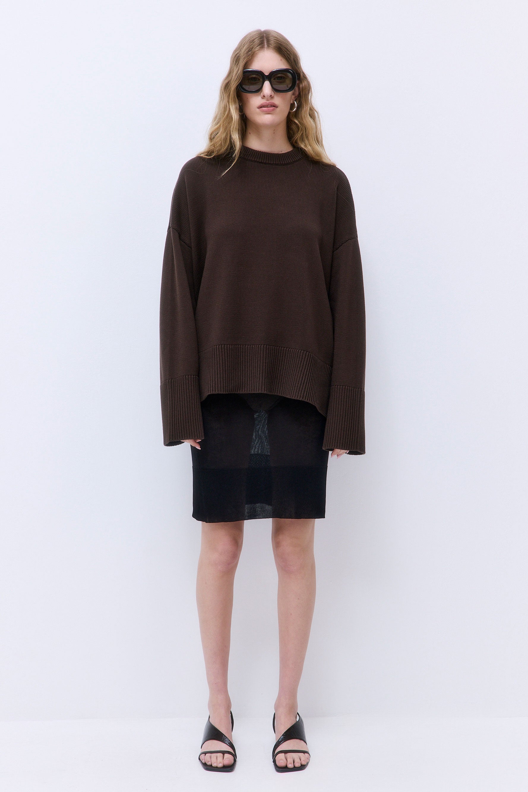 The perfect cozy winter essential. Crew neckline. Oversized fit. Slits on the side. Dropped shoulders. Wide rib hem. Tonal silicon logo on the back. Fully fashioned. Style it with our with our chic Sheer Midi Skirt and pair these with our iconic Yvon Shoulder Bag for an effortless everyday look.