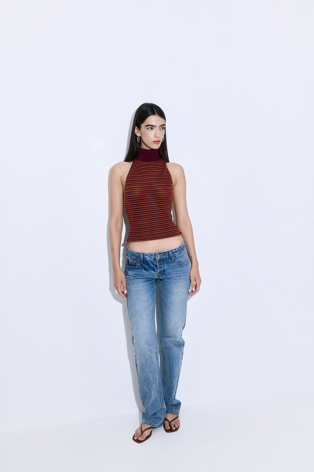 Introducing your new favorite top this season. High turtleneck ribbed collar. Open back design. Soft and breathable luxurious fabric. Sleeveless. Slightly sheer. Ribbed finish. Style it with our matching crochet pants, our chic crochet bandana and close this look with our crochet tote bag.