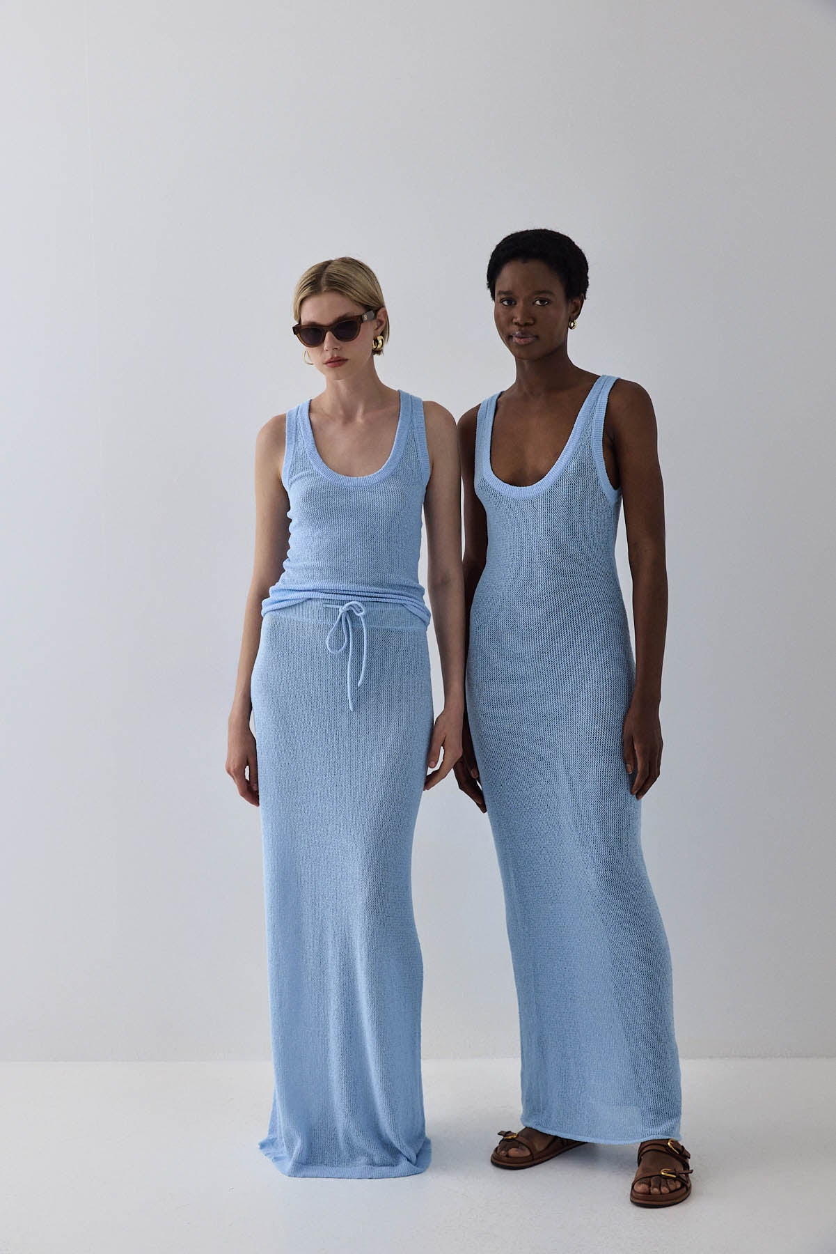 Deep scooped crochet maxi dress. Material that hugs the body, ultra flattering. Round neck cleavage. Sleeveless. Ribbed finish. Full length. The simplest and chicest way to elevate your summer look. Simply throw on the crochet maxi dress over your favorite swim set, add a pair of slides and sunnies and you are beach ready.