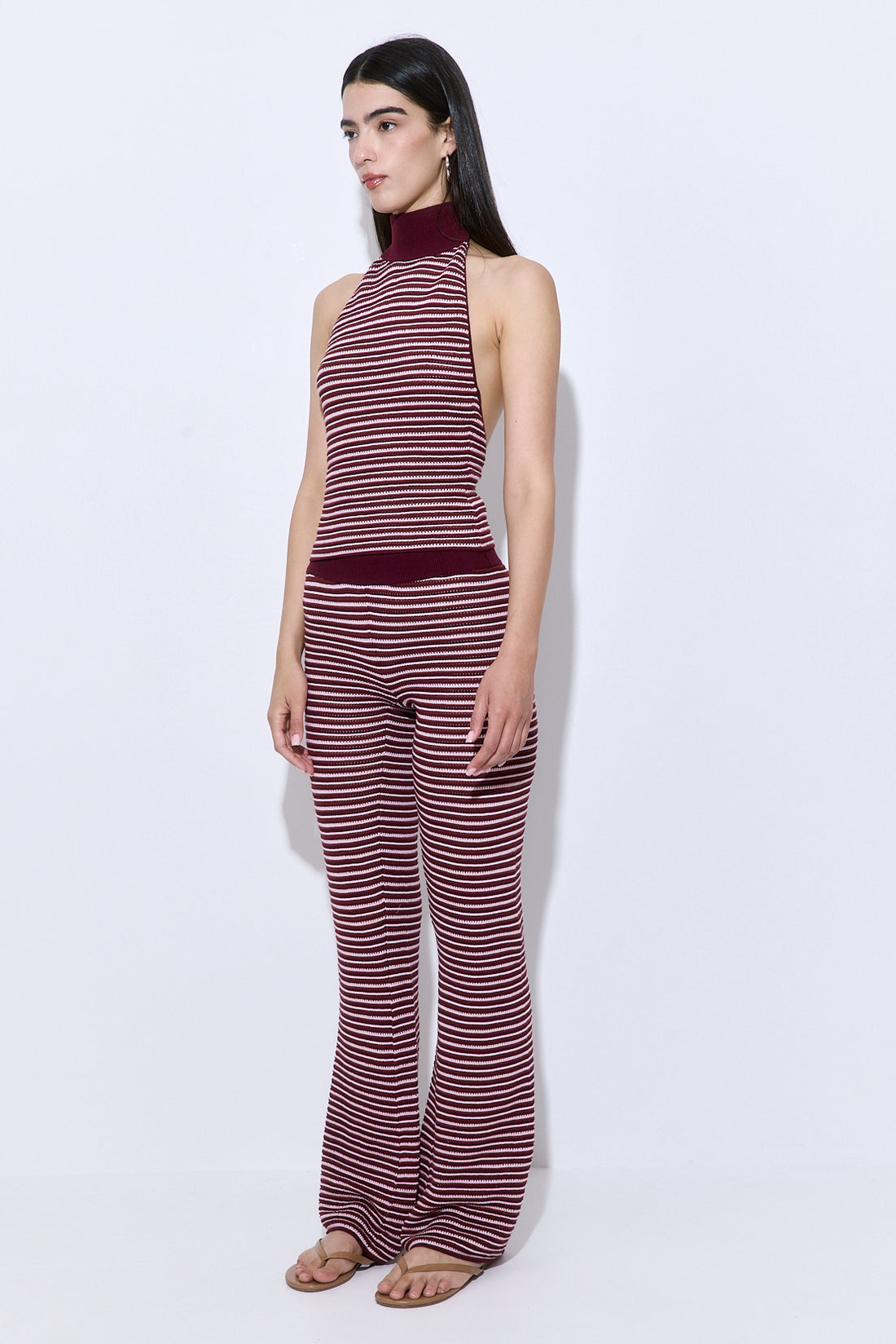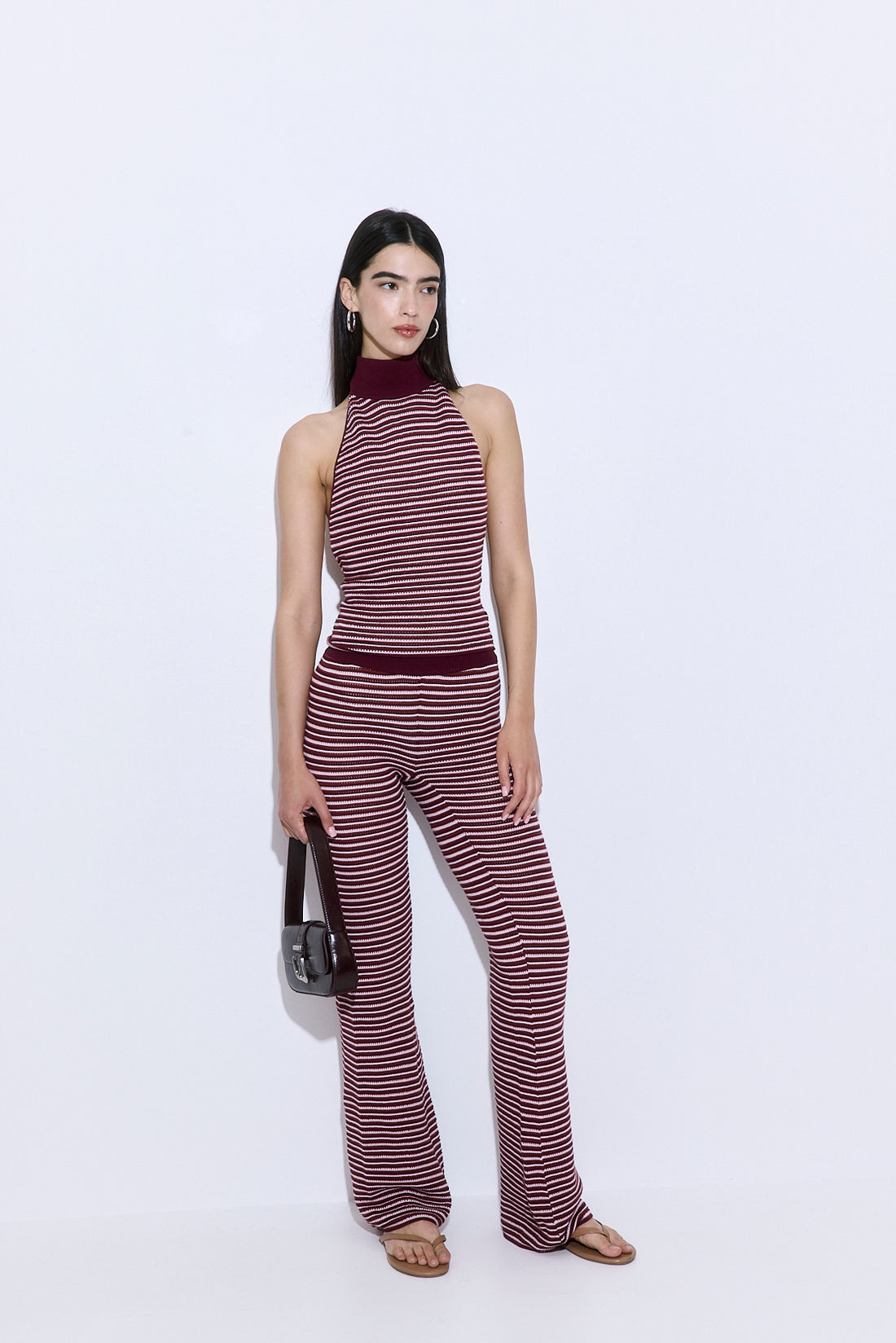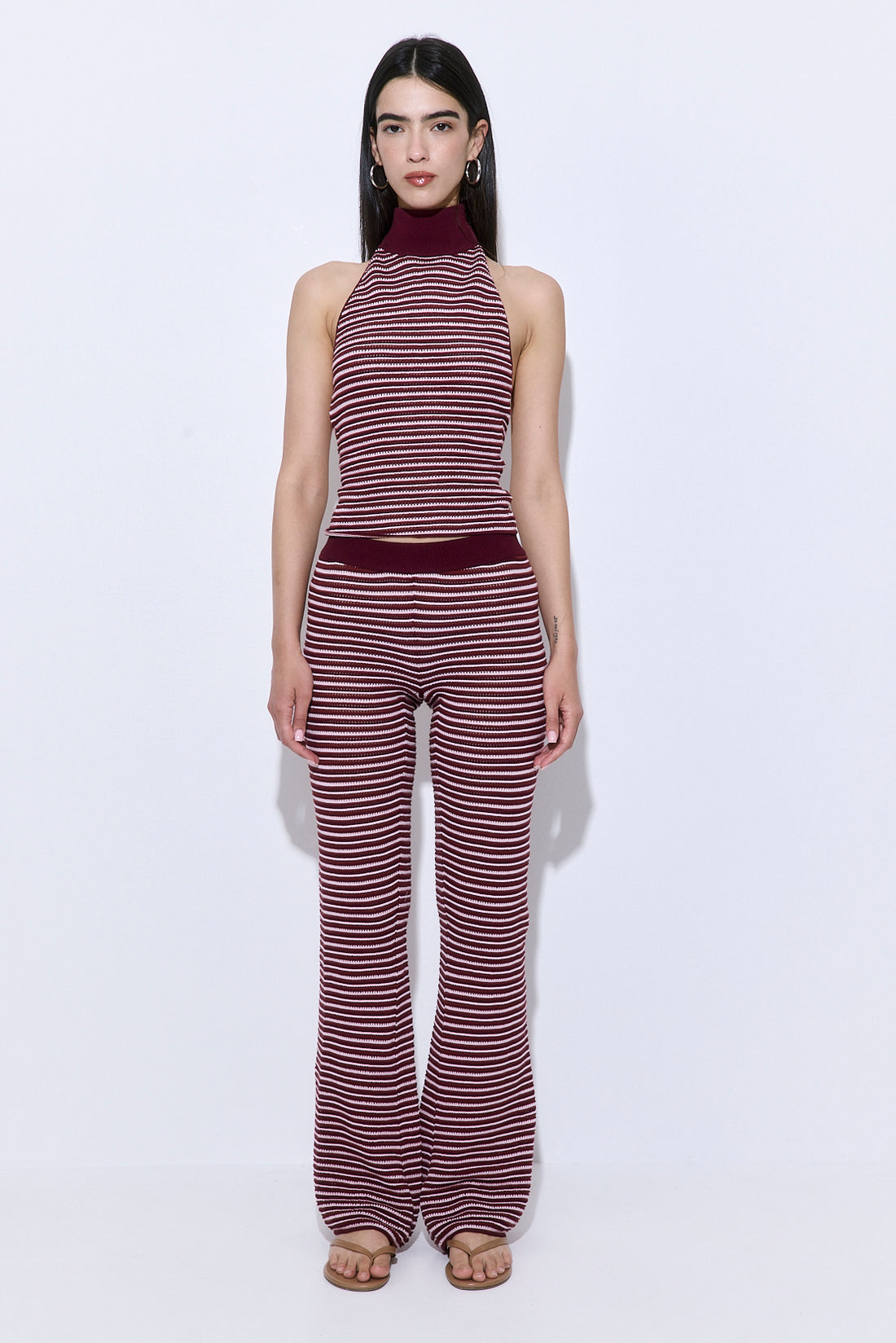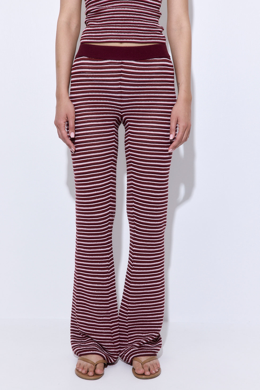 Introducing your new summer favorite. Our crochet flared pants were made especially to elavate this season's outfits. High rise fit. Contrasted ribbed waistband. Flared silhouette. Slightly sheered. Full length. Ribbed finish. Style it with our crochet turtle neck, our beautiful scrunchie and finish off with our new mini crochet bag.