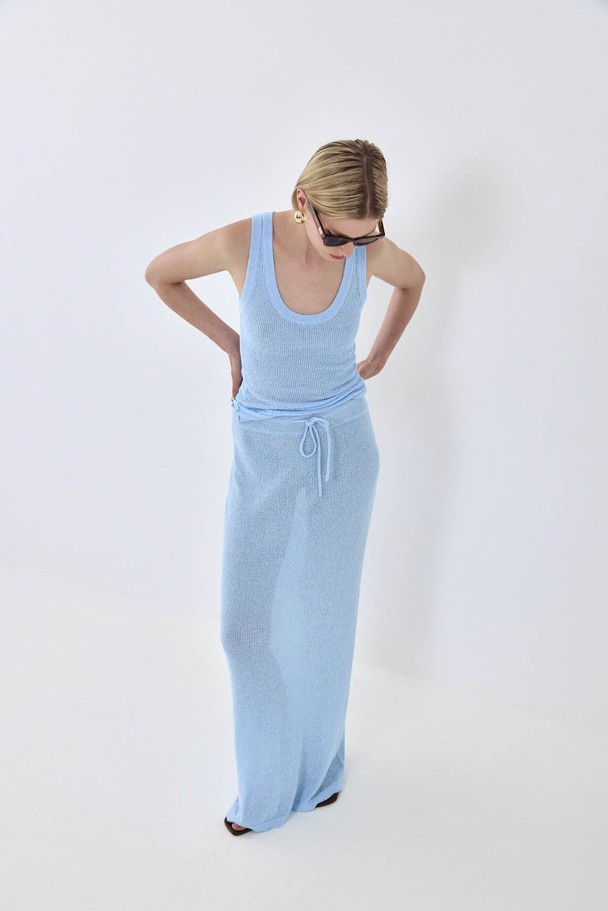 The most gorgeous crochet skirt, an absolute must have in your summer wardrobe. Mid rise maxi skirt. Full length. Ultra flattering material that hugs the body. Elastic waistband. Drawstring closure. Style it over your favorite swimsuit of the season, our aviator sunnies and a pair of slides for the perfect beach look.
