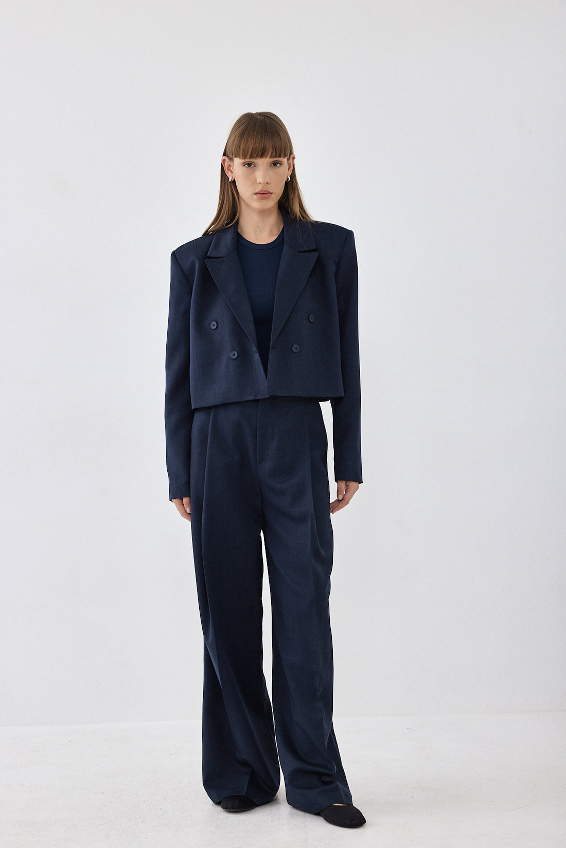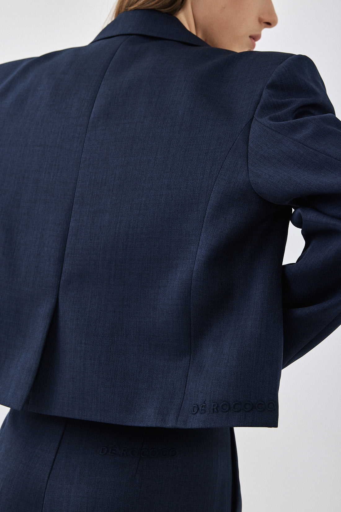 A new addition to our signature daddy collection. Cropped blazer. Features a lapel collar and front button closure. Long sleeves with pronounced shoulders. Dé Rococo embroidery ton sur ton at the back. Style it with a matching color daddy bottom for the ultimate stylish look.
