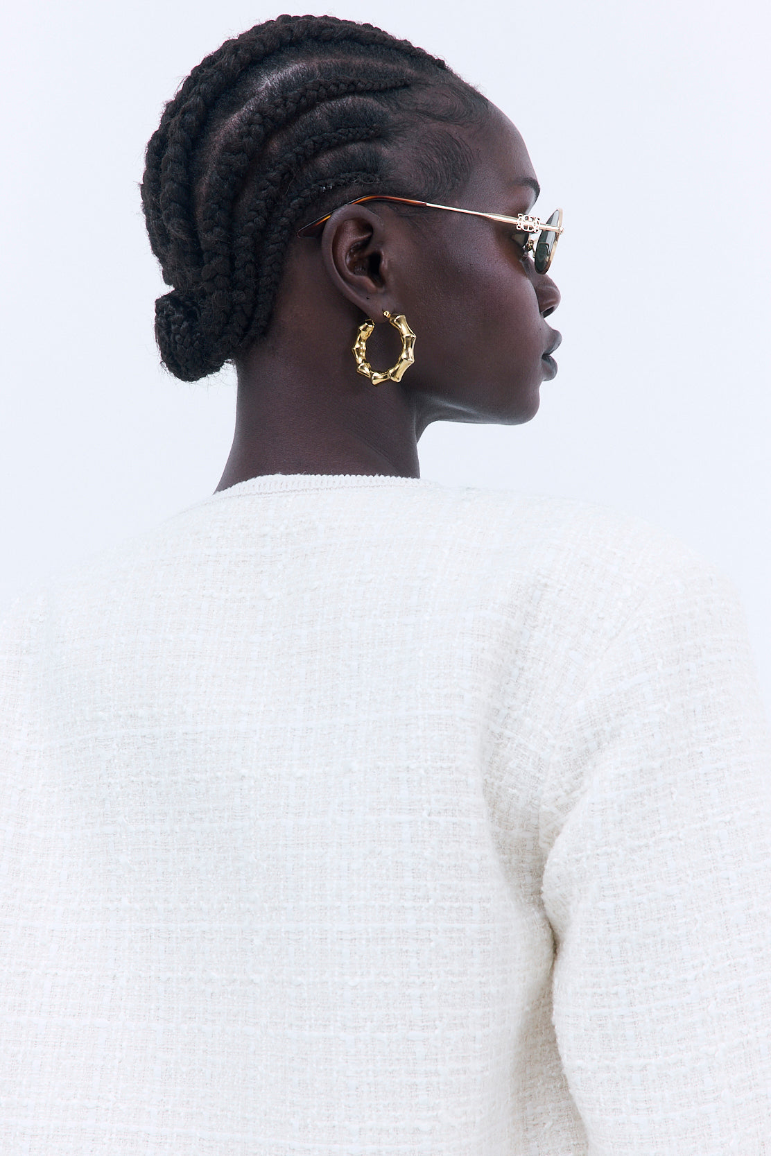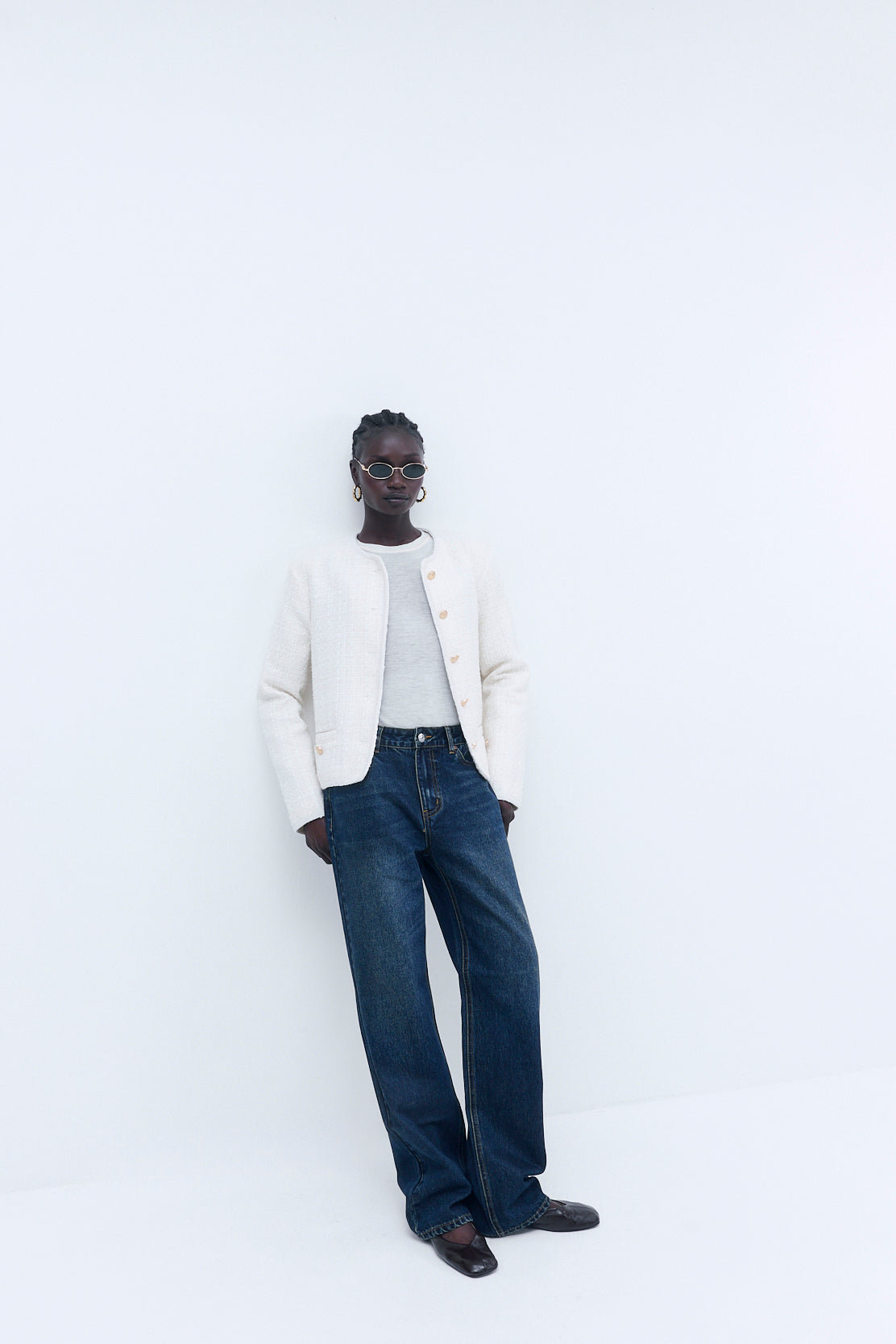 Effortless elegance meets timeless texture. Cropped, slim fit. Featuring gold buttons and ribbon trims. Welt pockets. Designed with shoulder pads for a fitted look. Style it with our new, matching Tweed Micro Mini Shorts and iconic Oval Sunglasses for a timeless look.