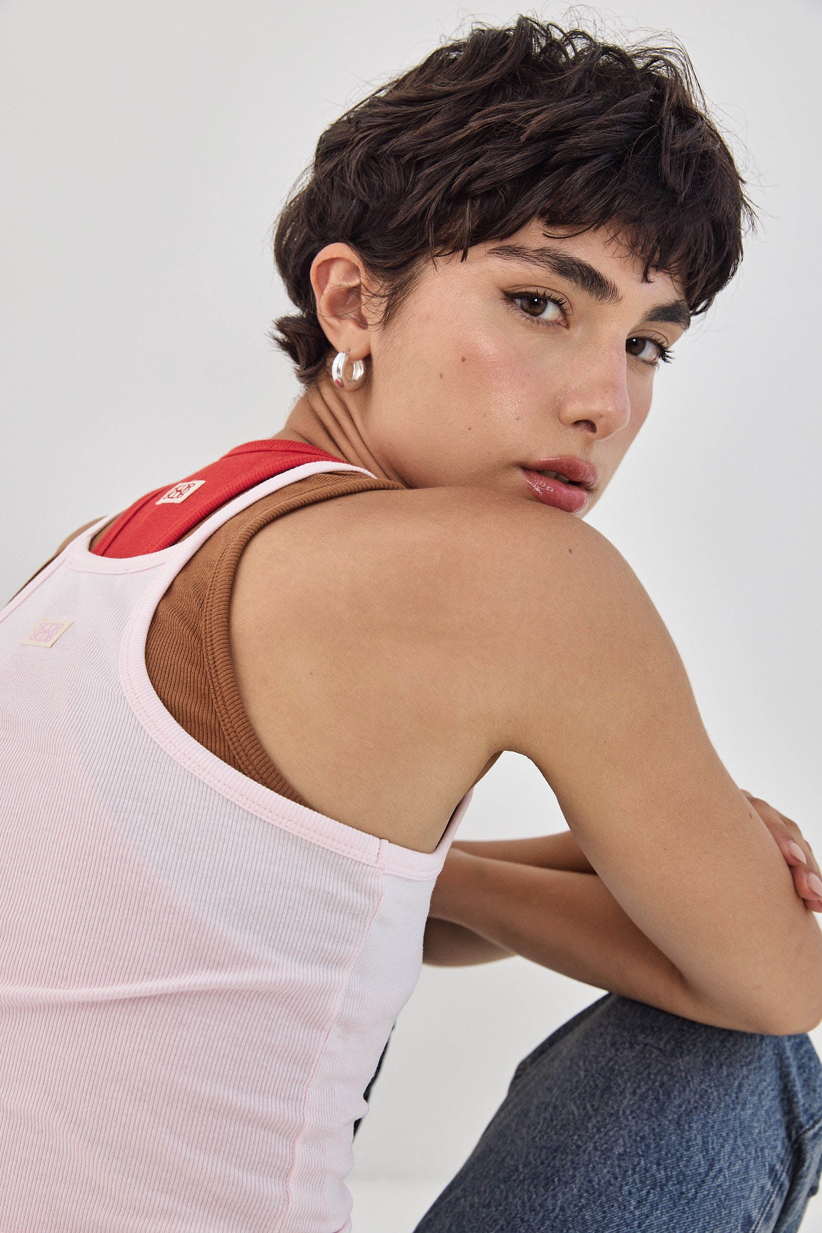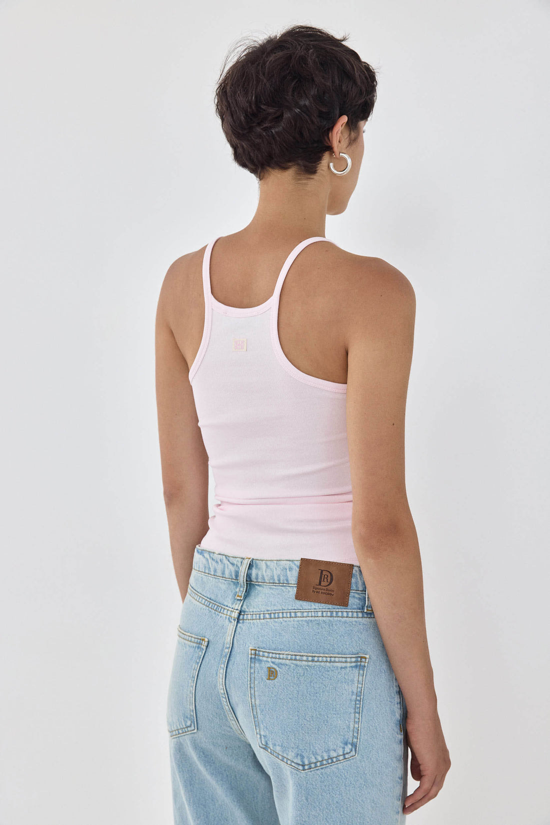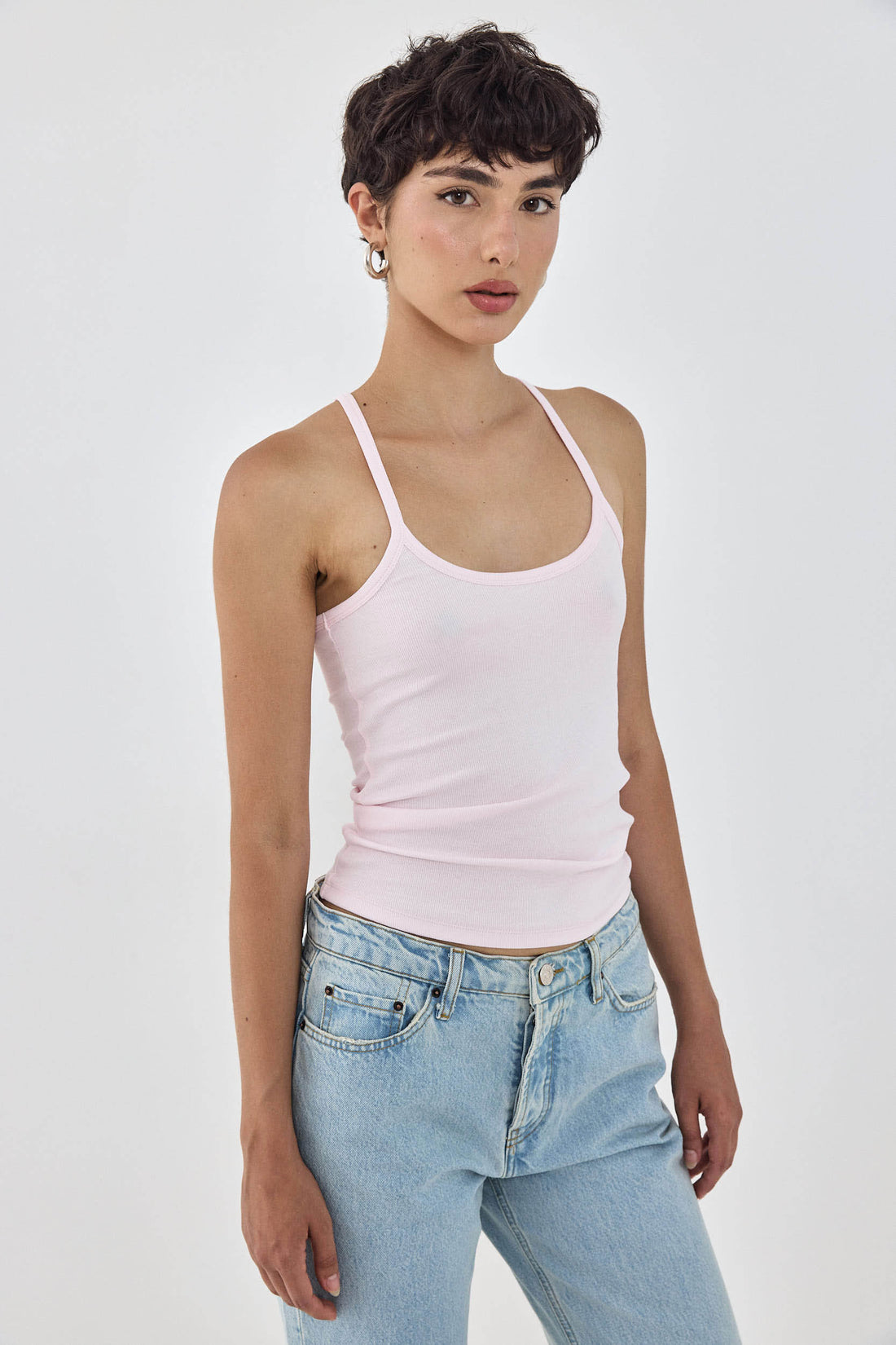 Round neckline cami tank top. Ribbed. Ribbed finish. Delicate halter back. Round neckline. Ultra soft fabric you won't want to take off. Delicate sheer. Cotton woven label with logo detailing at the back. Style it with your favorite denim, large rattan tote bag and neutral colored accessories for a stunning daily look.