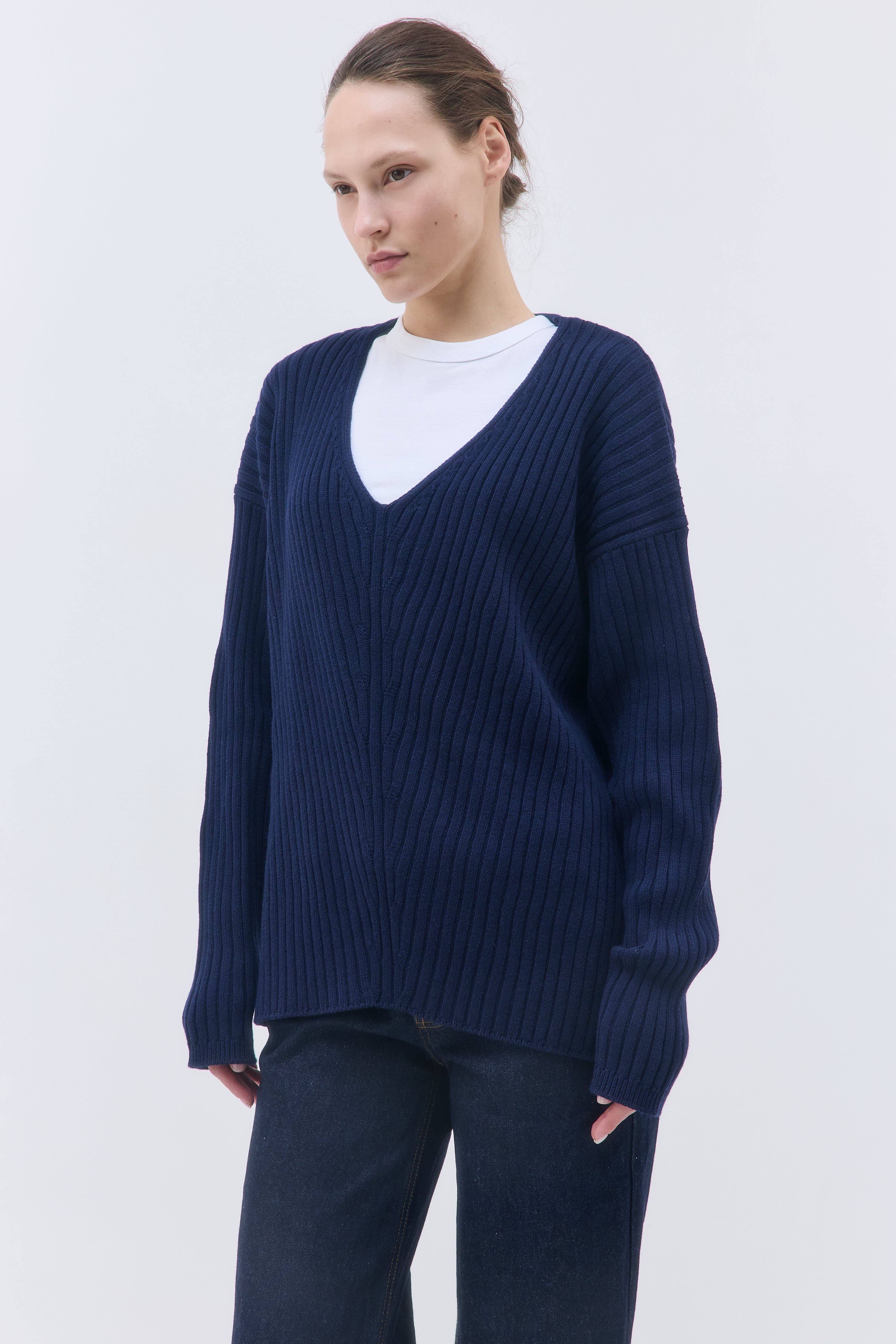 Introducing your new staple knit, made to be worn again and again. An oversized deep-V thick ribbed knit. Clean finishes. Featuring a tonal silicone logo at the back. Layer it with our timeless Classic Relaxed T Shirt, and pair those with our iconic Oversized Double Breasted Trench Coat for the ultimate cozy winter's day look.