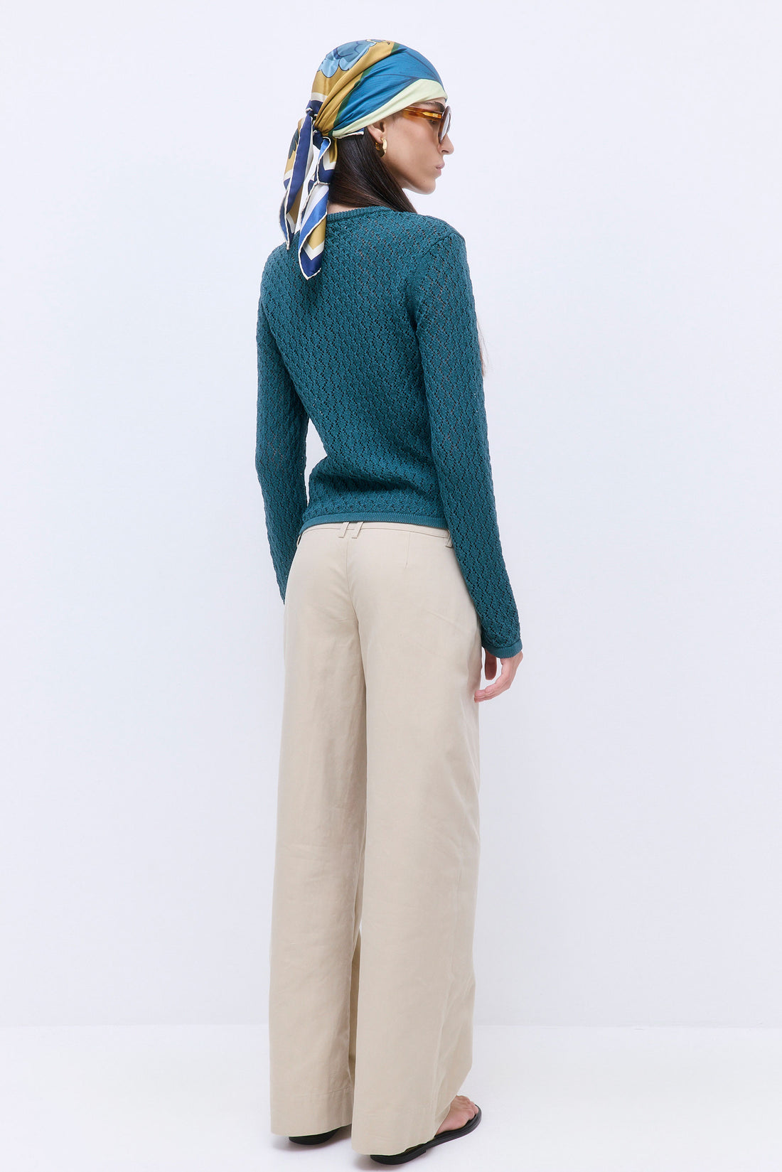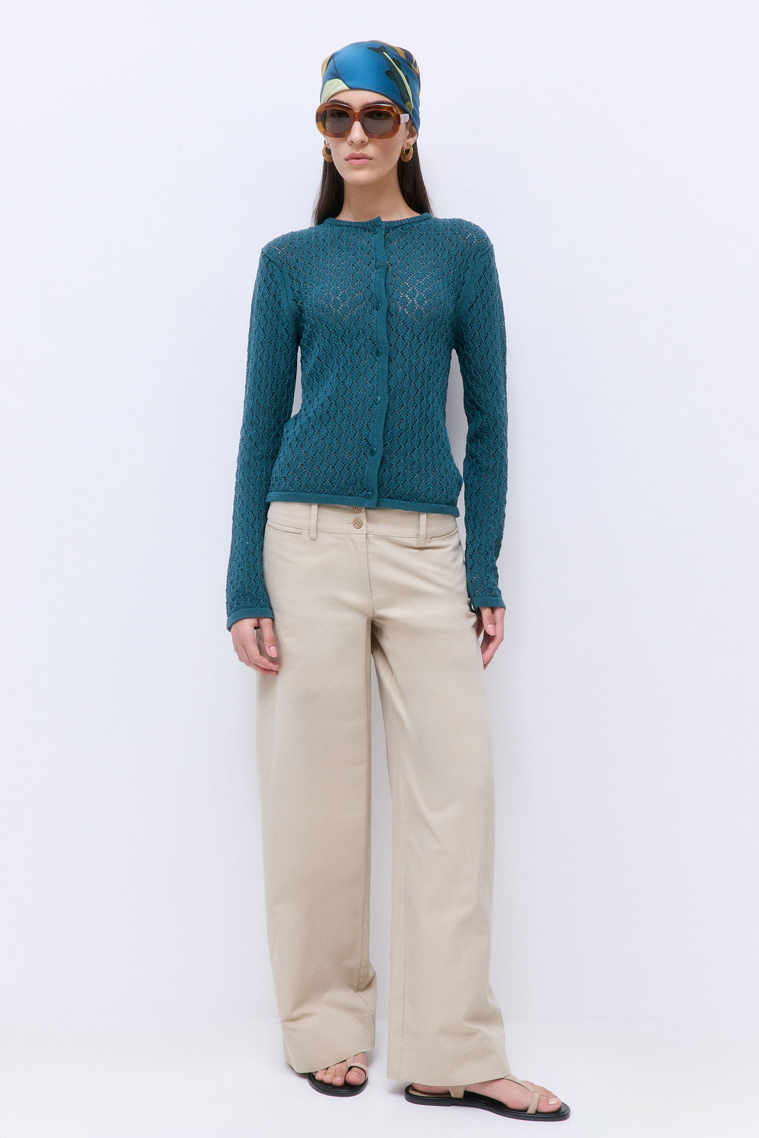 A touch of summer warmth, wrapped for fall. Diamond knit crochet cardigan, featuring tonal buttons. Relaxed fit. Round neckline. Ribbed finishes. Fully fashioned. Style it with our iconic Striped Drill Shorts and pair those with our signature Wide Buckle Belt for a curated look.
