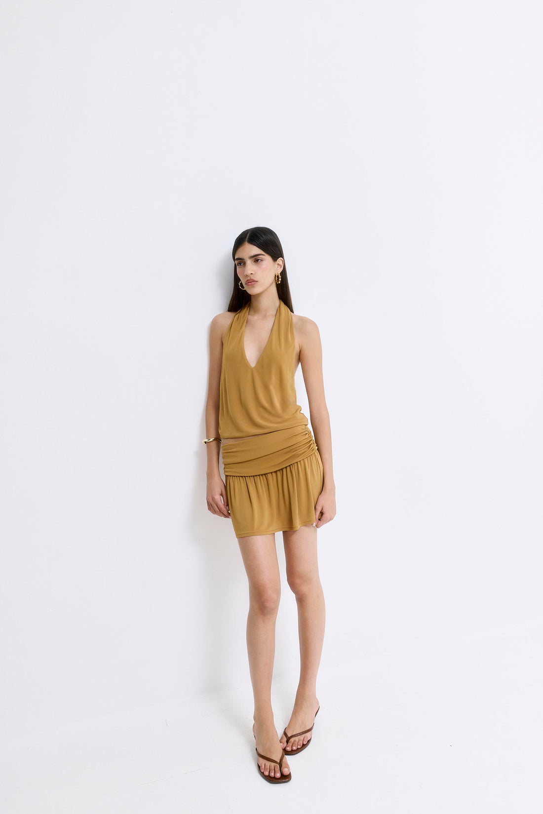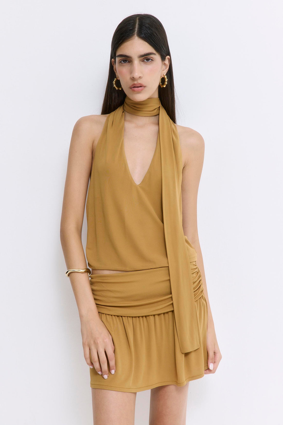 Our most iconic addition to our jersey collection. Crafted in a stretchy and soft fabric that flatters and shapes the body. Deep V neckline and an open low back. Features a gathered detail at the halter neckline's center. Includes a classy, thin tonal jersey scarf, designed to complete the neck line with an iconic twist. Versatille styling allows for wear with or without the scarf. Style it with our matching jesrey mini skirt and our iconic yvon shoulder bag for the most beautiful seasonal look.