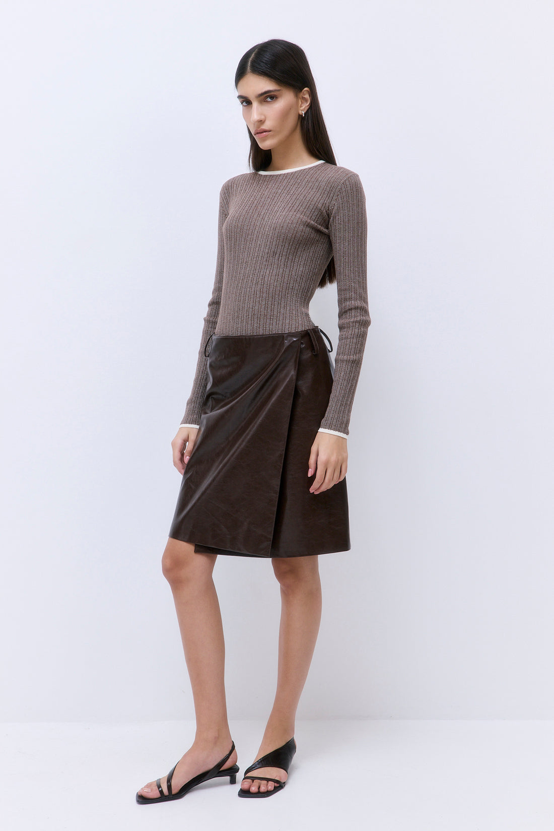 An iconic addition to our winter drop. Faux leather. Midi length skirt. Wrap around. Mid waist. Featuring a debossed tonal logo on the back. Fully lined. Belt loops. Snap buttons closure. Style it with it's matching Faux Leather Fitted Jacket and our timeless Sheer Baby Tee for a sleek look.