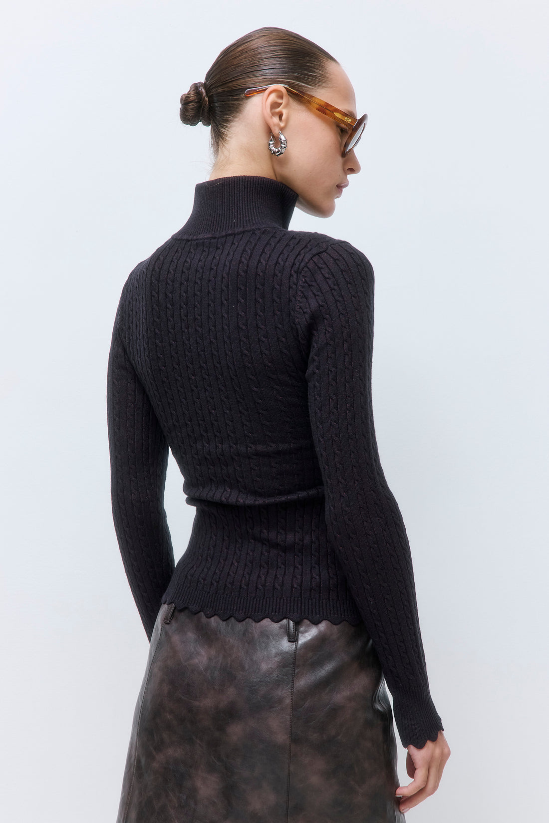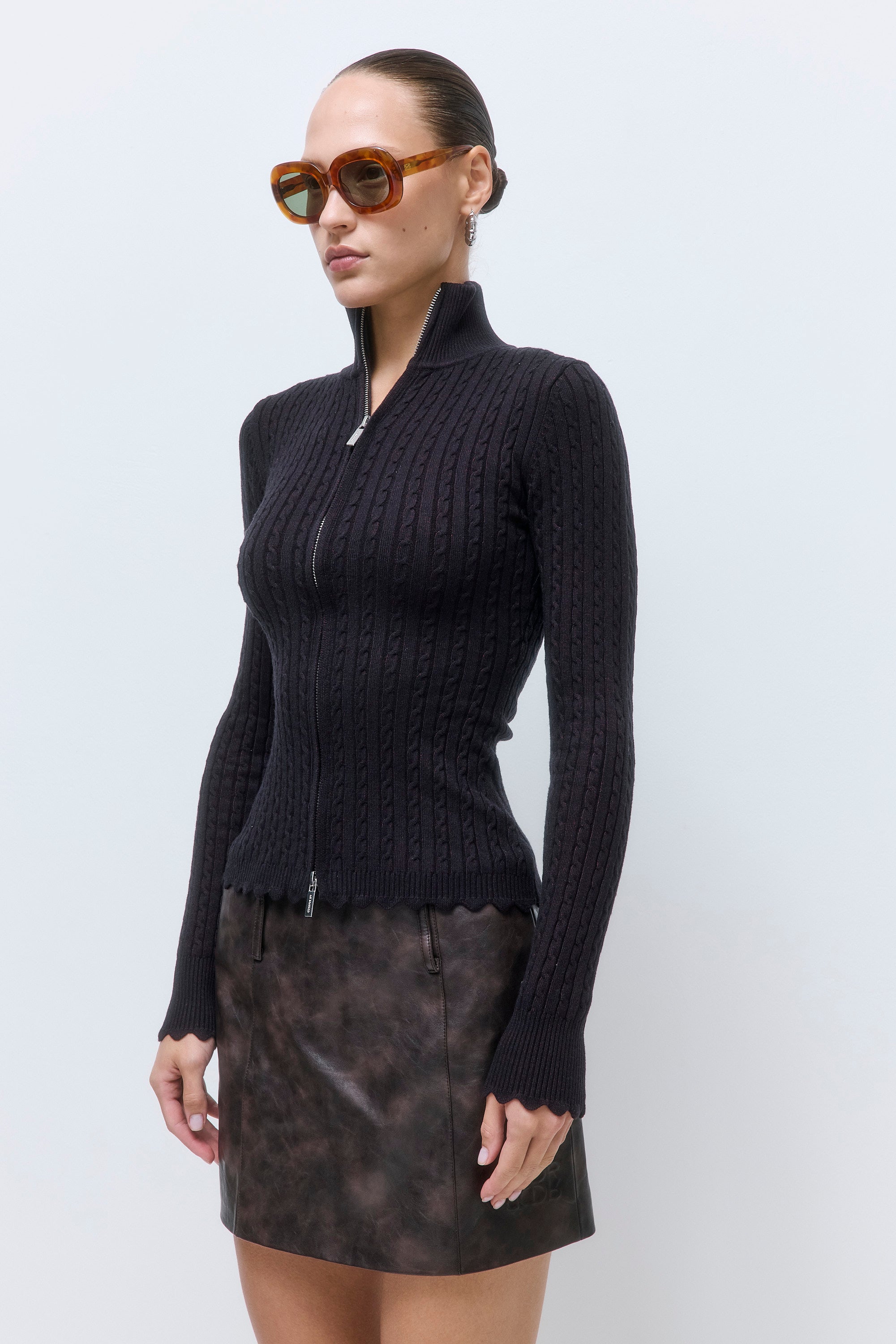 Our new cool-girl Fitted Cable Knit Cardigan is your buttery-soft essential for effortless style. Fitted silhouette. Featuring a double logo zipper that opens from both ends. Can be worn open or closed, as you please. Fully fashioned. Finished with a ribbed collar, cuffs, and hem. Wavy detailing along the sleeves and hem. Pair it with our iconic No. 15 Denim and our luxurious Jackie Sunglasses for a versatile look.
