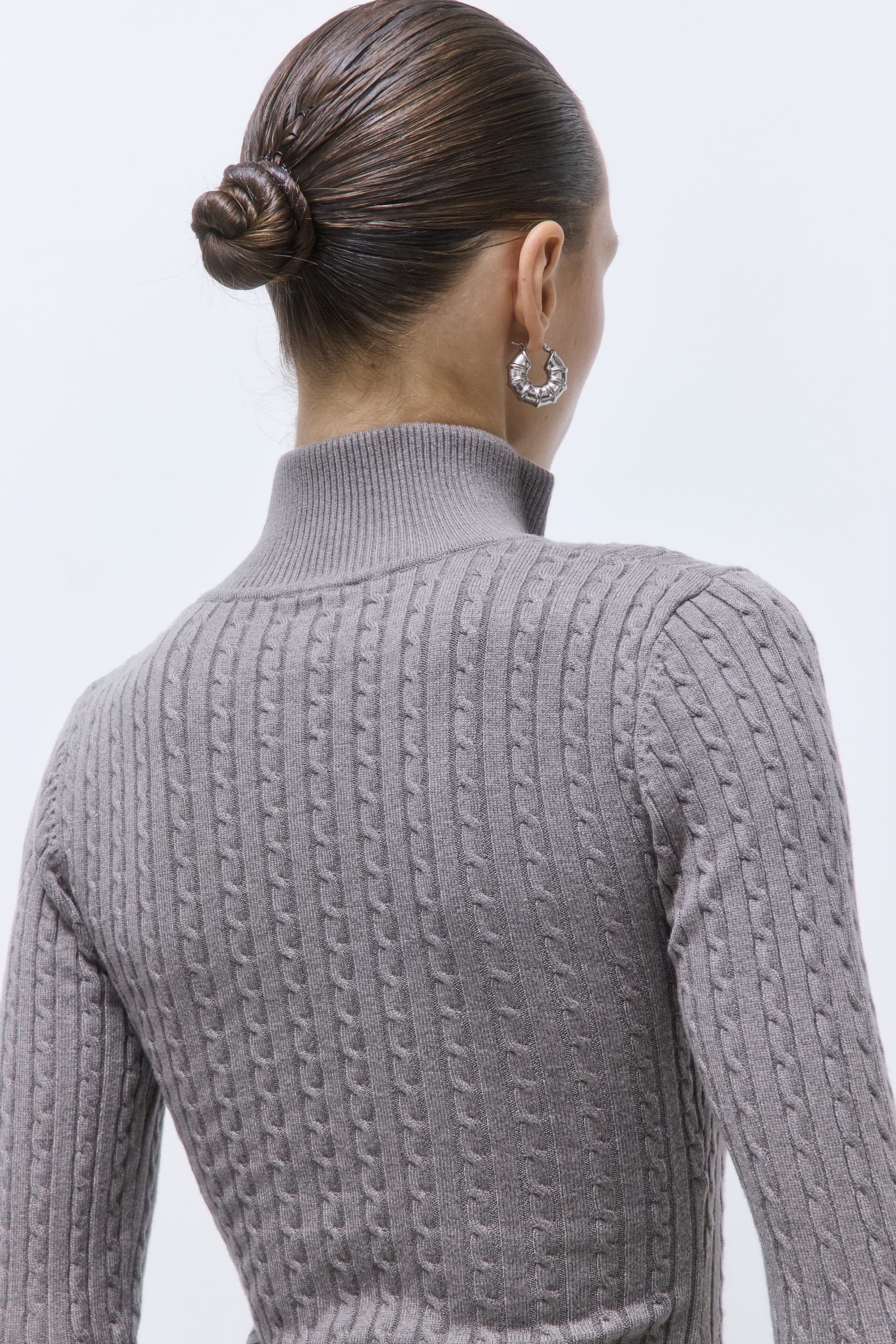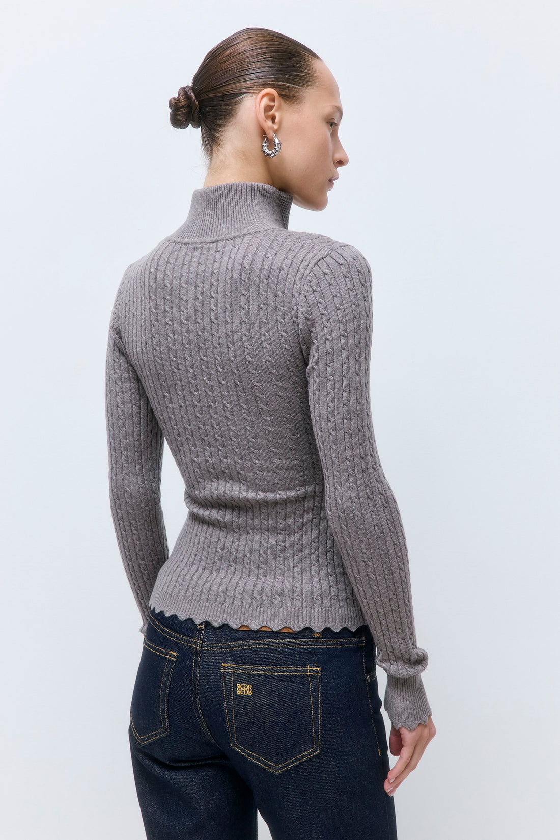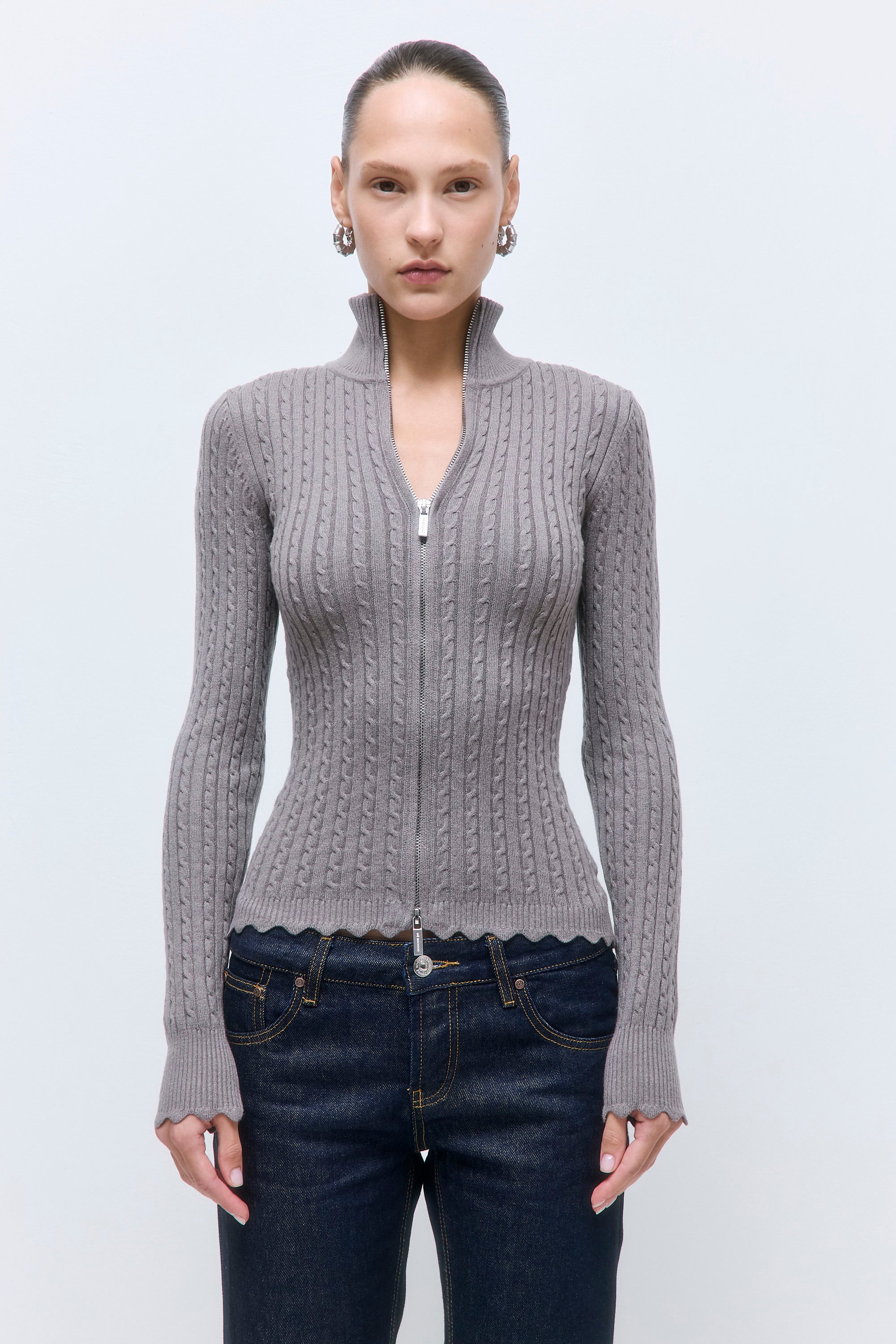 Our new cool-girl Fitted Cable Knit Cardigan is your buttery-soft essential for effortless style. Fitted silhouette. Featuring a double logo zipper that opens from both ends. Can be worn open or closed, as you please. Fully fashioned. Finished with a ribbed collar, cuffs, and hem. Wavy detailing along the sleeves and hem. Pair it with our iconic No. 15 Denim and our luxurious Jackie Sunglasses for a versatile look.