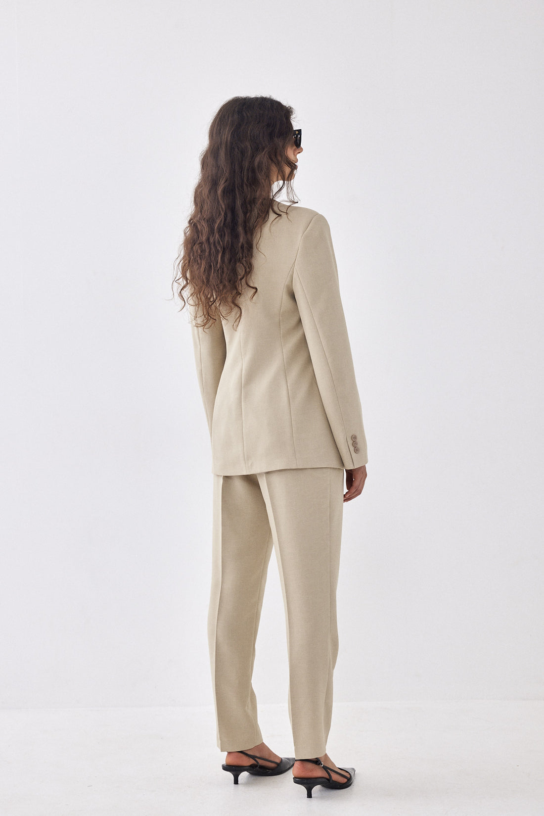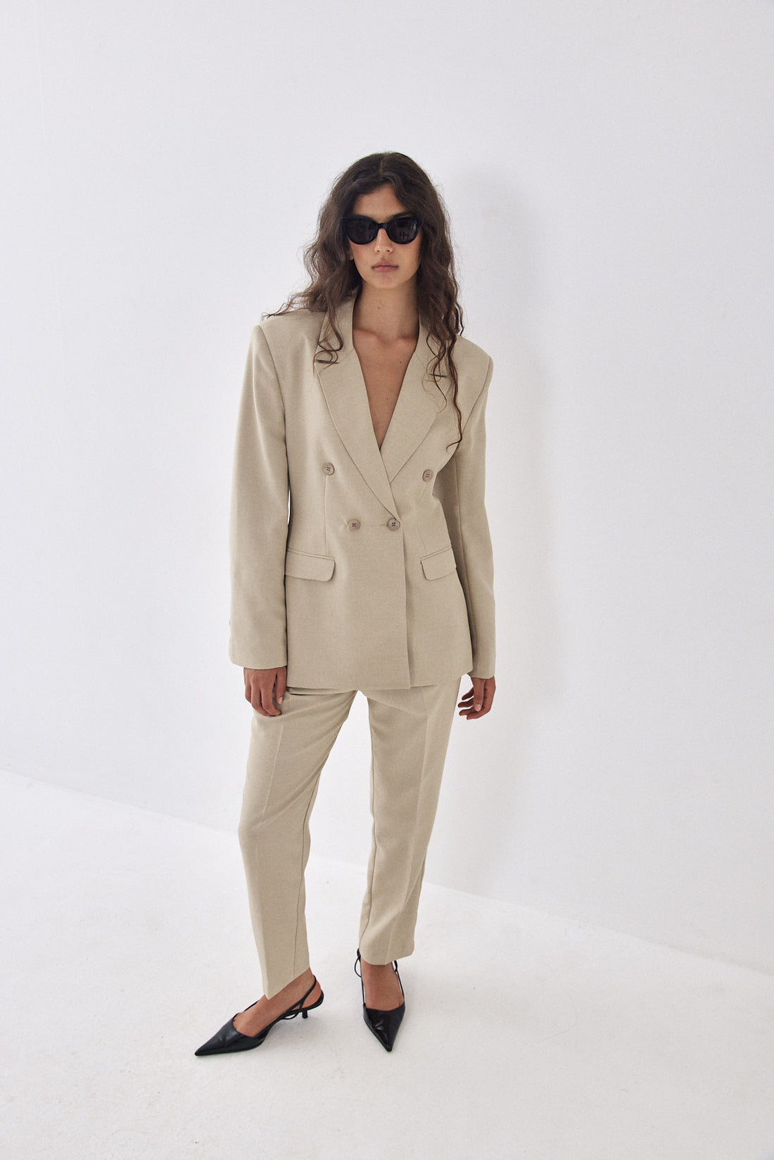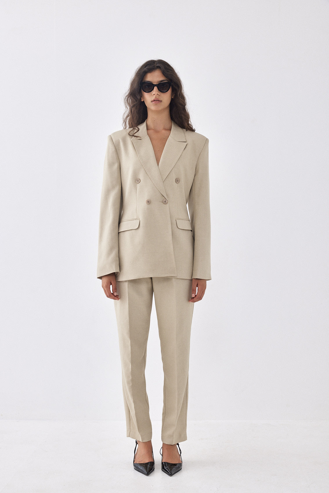 A classic blazer with an oversized fit. Features broad shoulders and a lapel collar. Fitted at the waist for a cinched look, giving the blazer a structural shape. Double breasted buttoned closure. Back embroidered logo detail on the collar. Complete the look with a pair of matching daddy pants and a pair of loafers for a classic look.