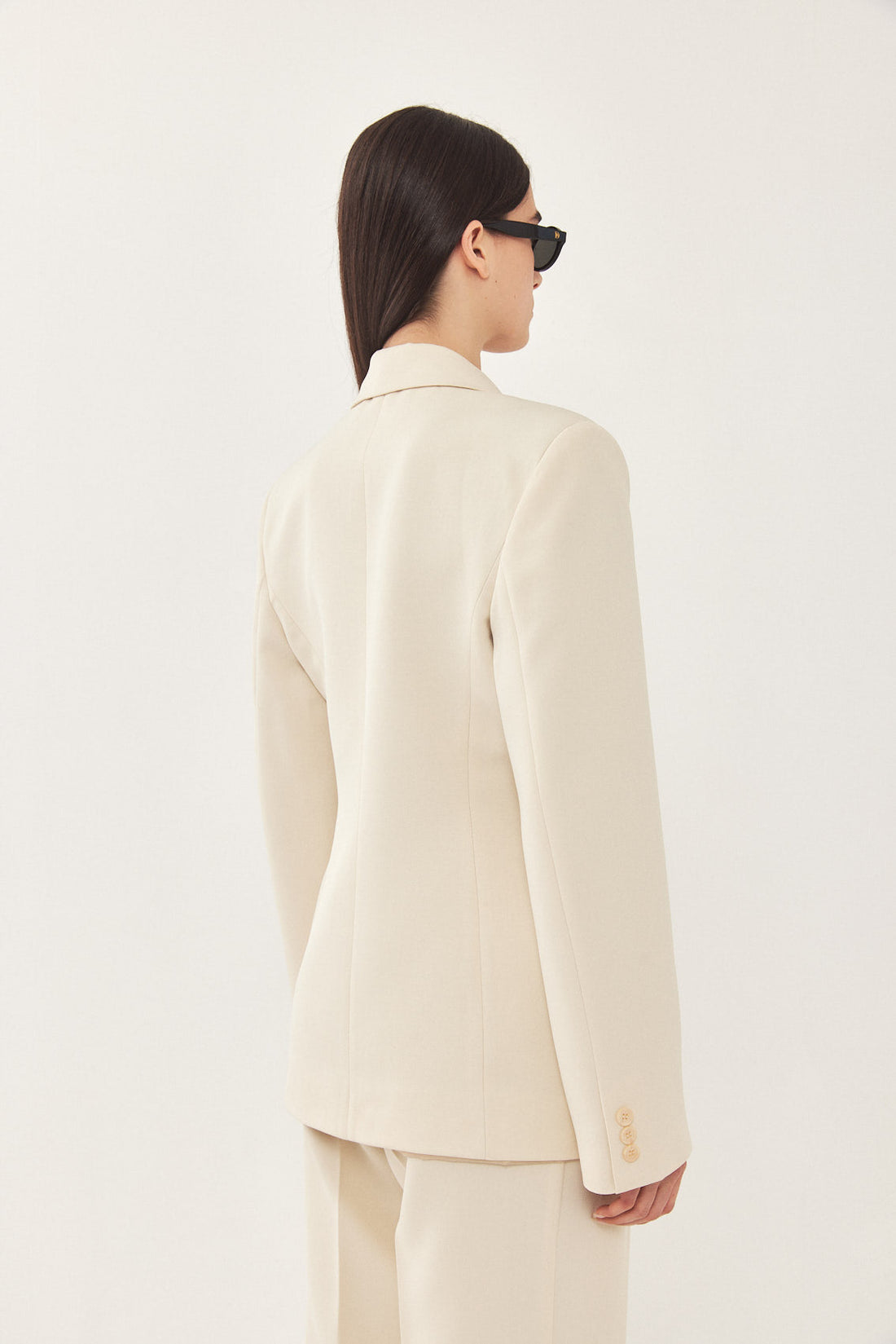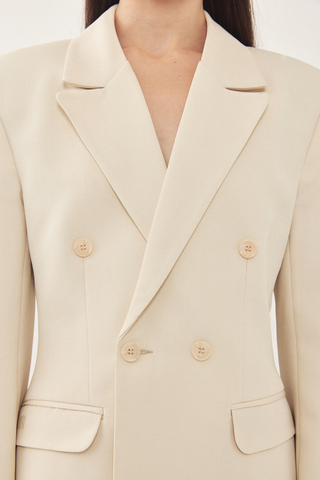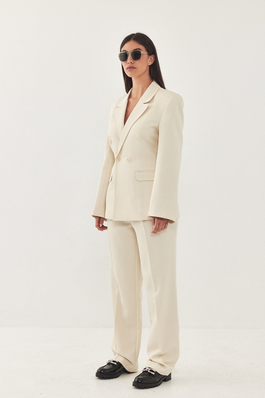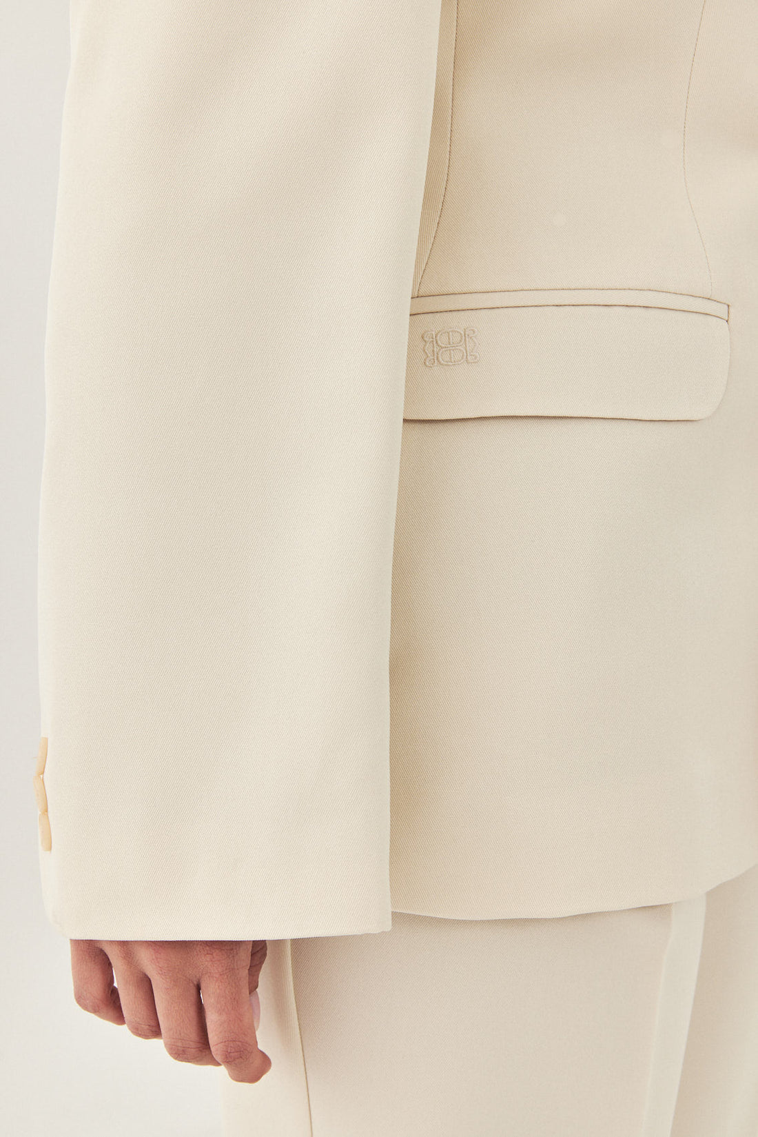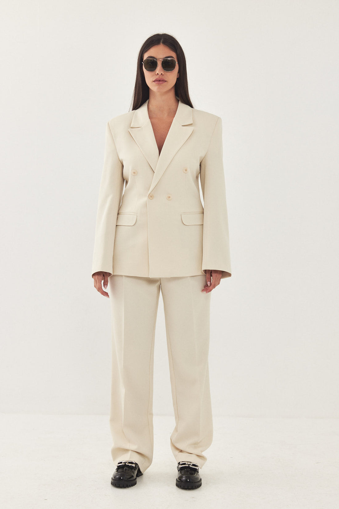 A classic blazer with an oversized fit. Features broad shoulders and a lapel collar. Fitted at the waist for a cinched look, giving the blazer a structural shape. Double breasted buttoned closure. Back embroidered logo detail on the collar. Complete the look with a pair of matching daddy pants and a pair of loafers for a classic look.