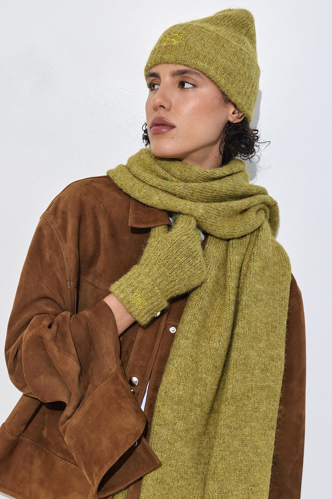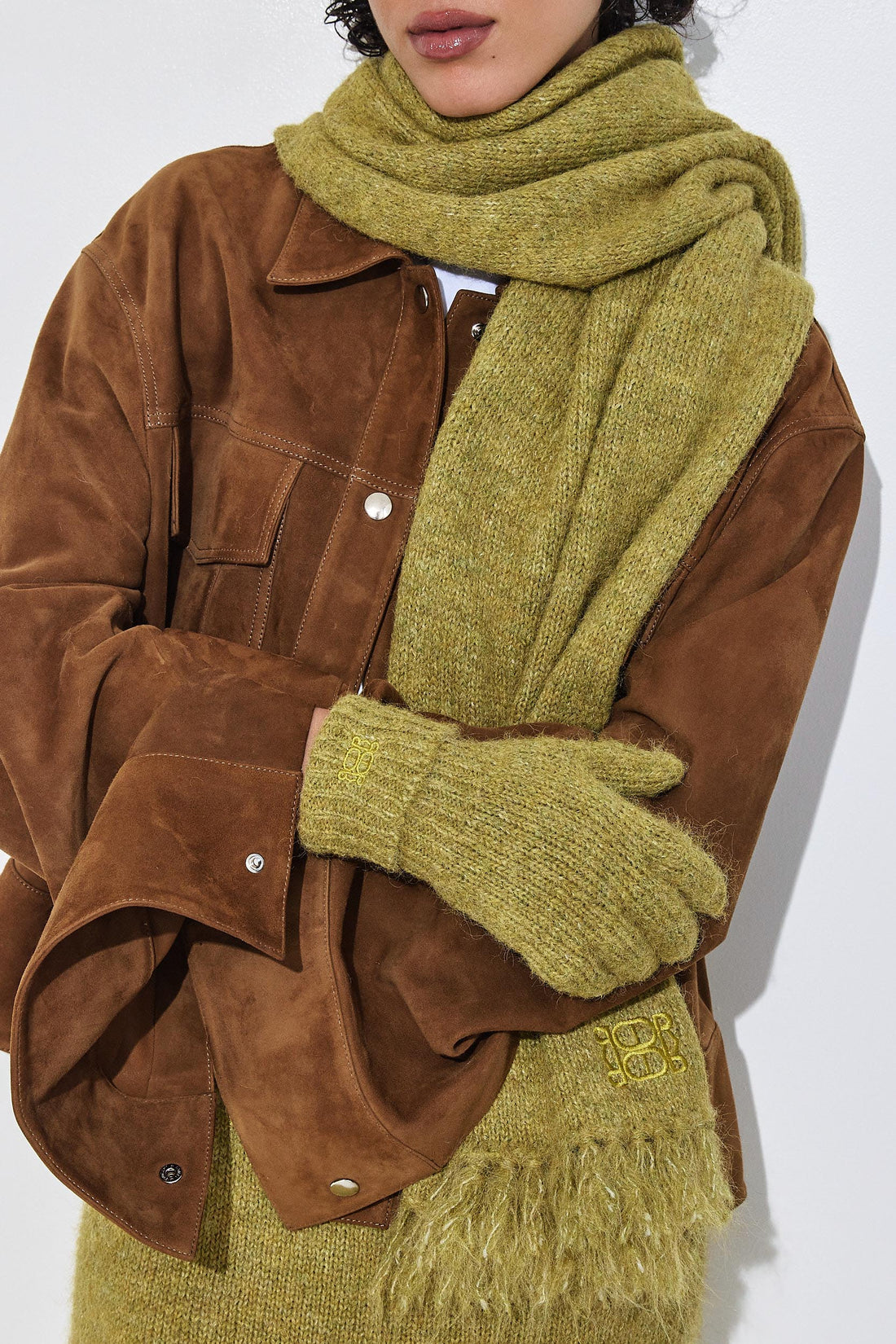 Upgrade your winter looks with our new fuzzy knitted gloves. Super soft fabric. Features a tonal embroidered logo and ribbed cuffs. Style it with our fuzzy maxi dress, our vegan leather bomber and our oval sunnies for a gorgeous winter look.