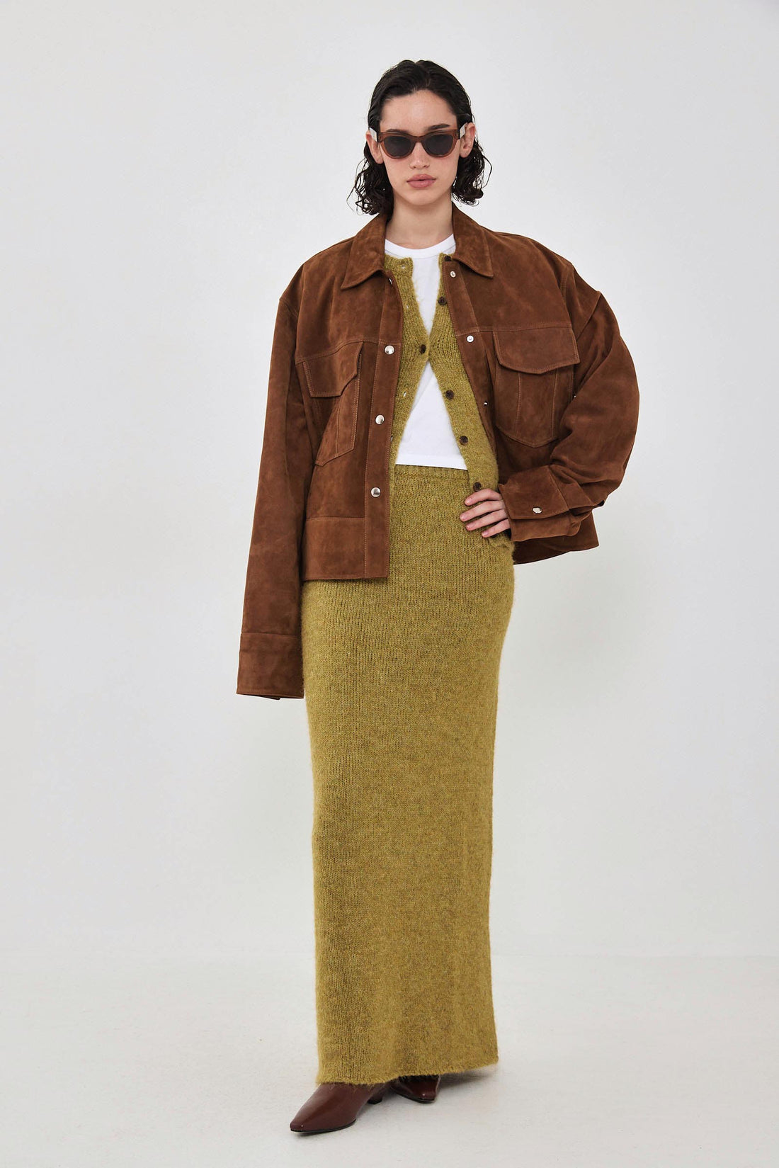 Add a touch of cozy texture to elevate your fall look with our new fuzzy maxi skirt. Soft and cozy fabric. Comfortable ribbed elastic waistband. Low rise. A sleek, form-fitting silhouette that flatters the body. Tonal logo embroidery on the back. Style it with our matching fuzzy jumper, our signature belt and a pair of our chic oval sunnies for a beautiful cozy look.