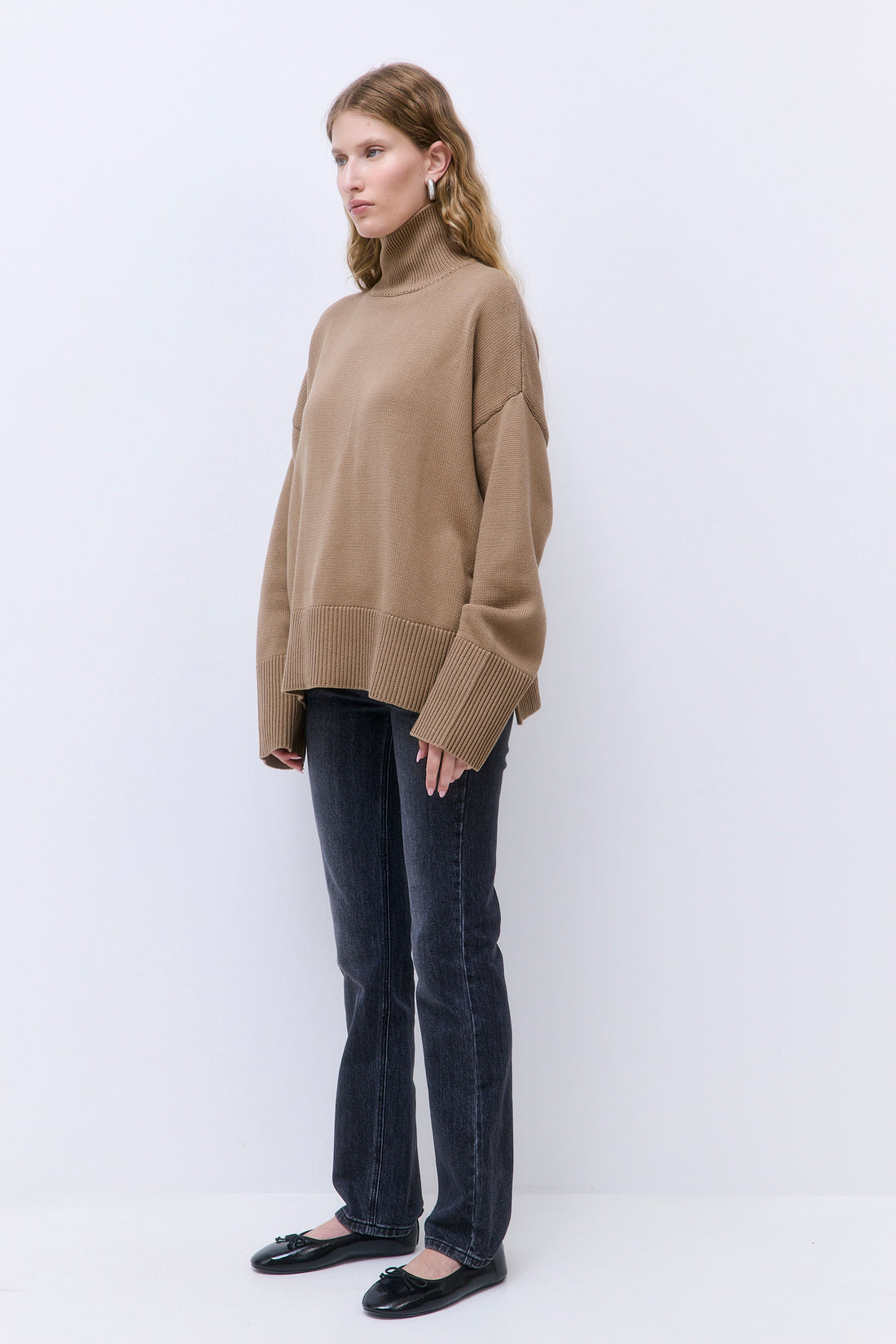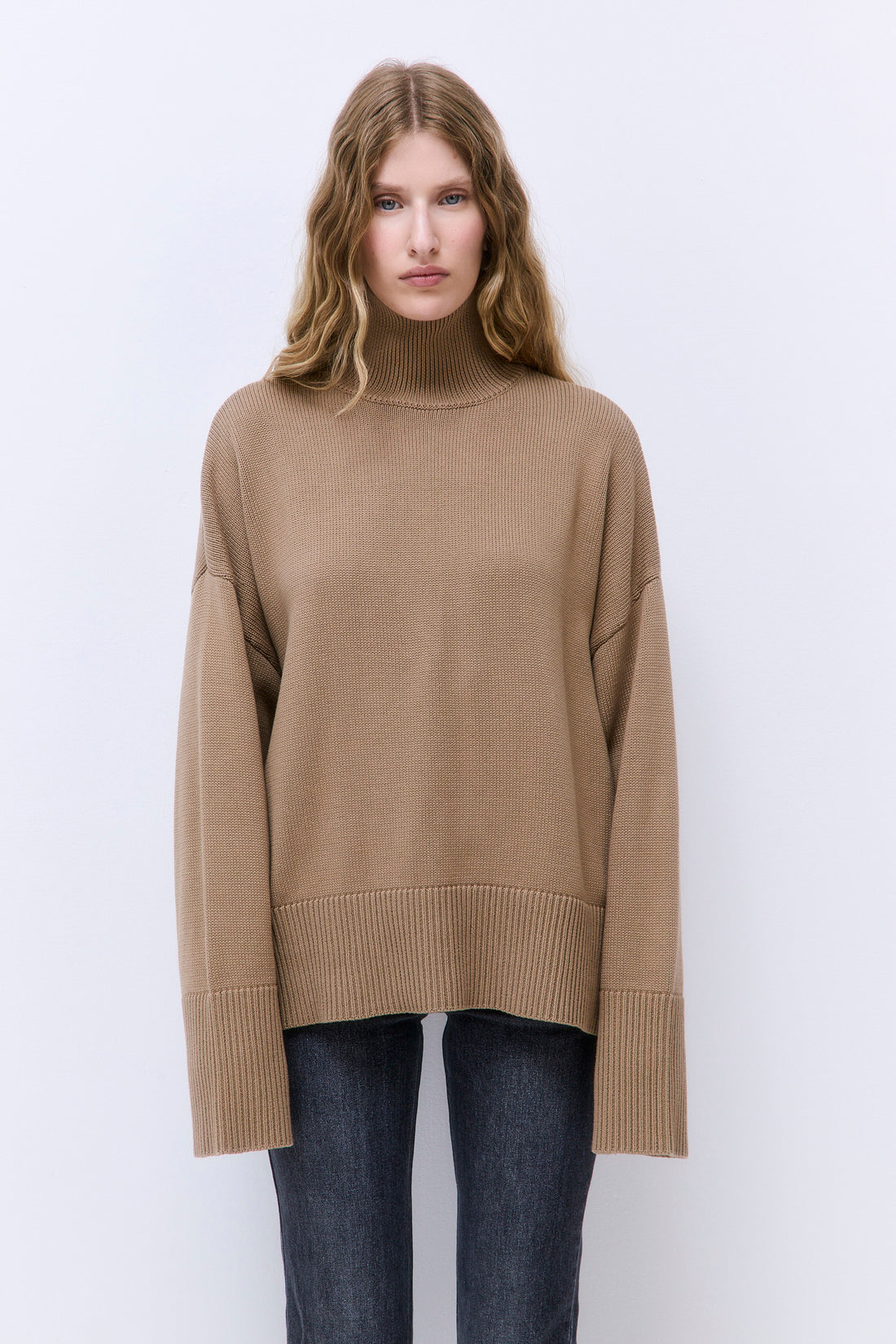 The perfect cozy winter essential. Turtleneck. Oversized fit. Slits on the side. Dropped shoulders. Wide rib hem. Tonal silicon logo on the back. Fully fashioned. Style it with our with our chic Sheer Midi Skirt and pair these with our iconic Yvon Shoulder Bag for an effortless everyday look.