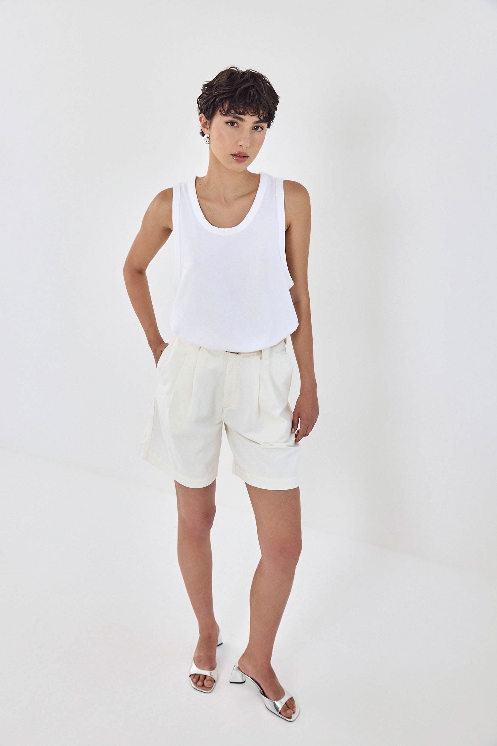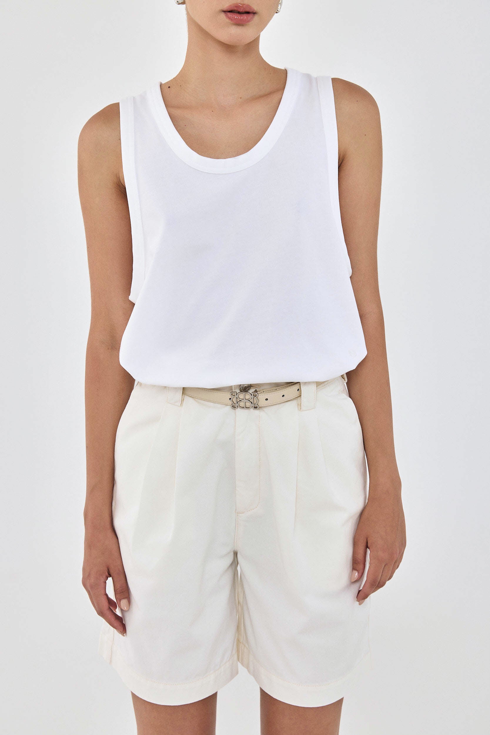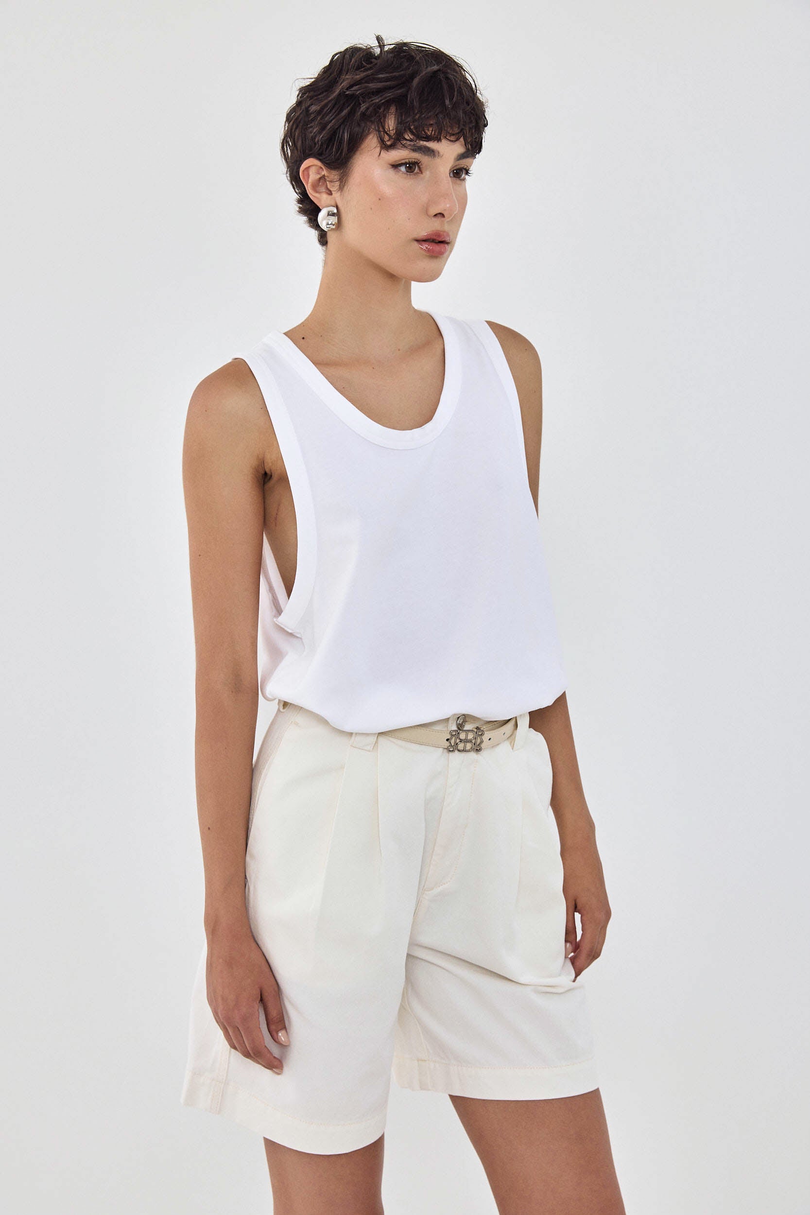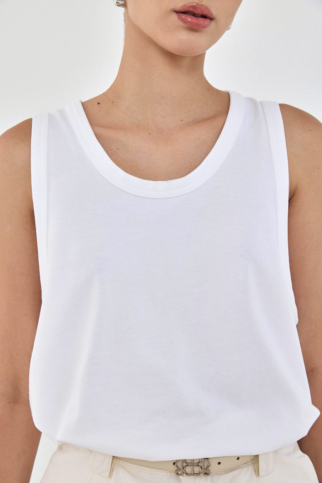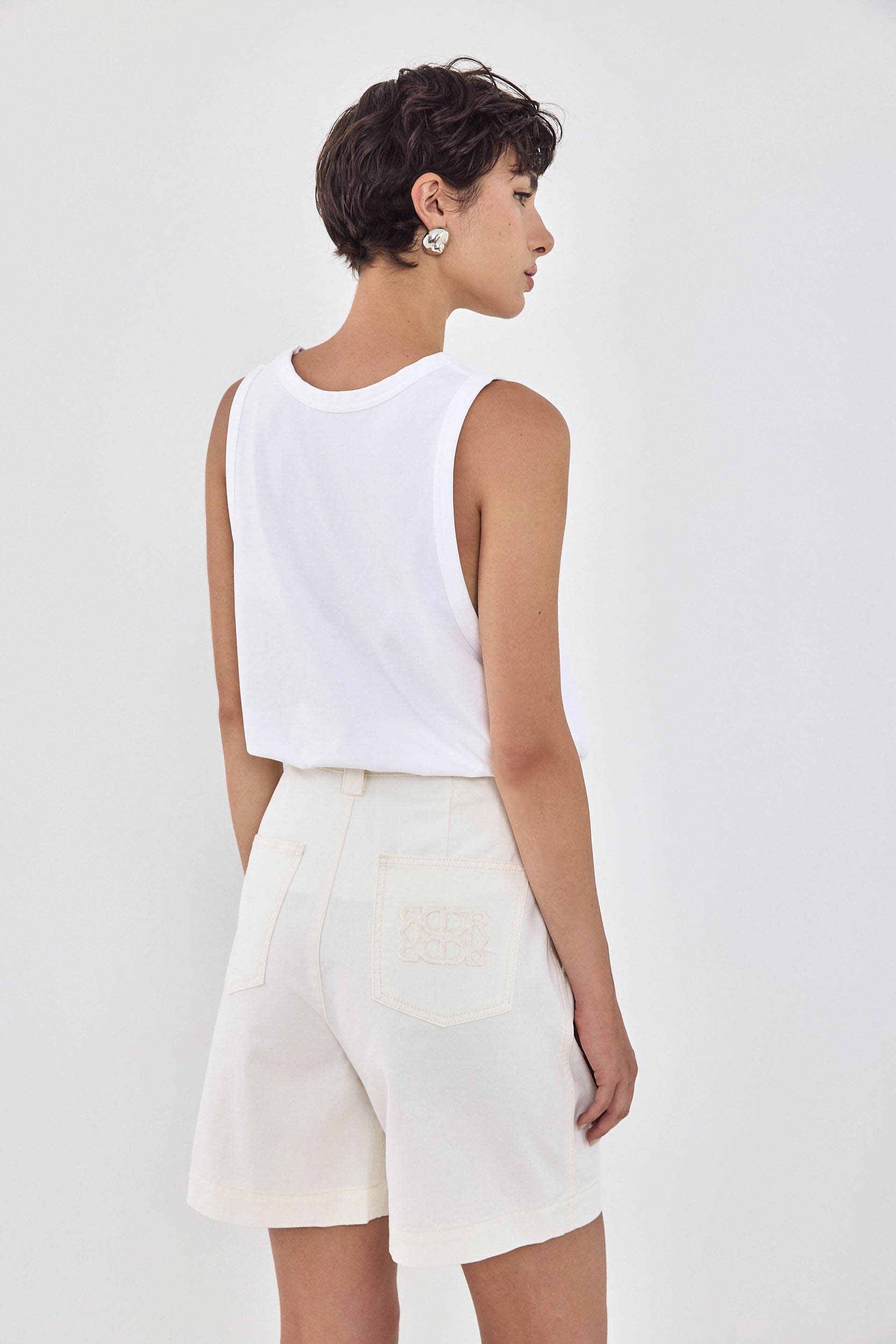 The perfect tank top is an absolute summer wardrobe essential. Boxy silhouette. Sits loosely on the body. Made from a thick heavy cotton composition, maintaining its shape all day long. Embroidered tonal logo detailing at the front of the shirt, just above the waistline. Style it a denim mini skirt, croco belt and a pair of chunky loafers to easily attain Parisian effortless chicness.