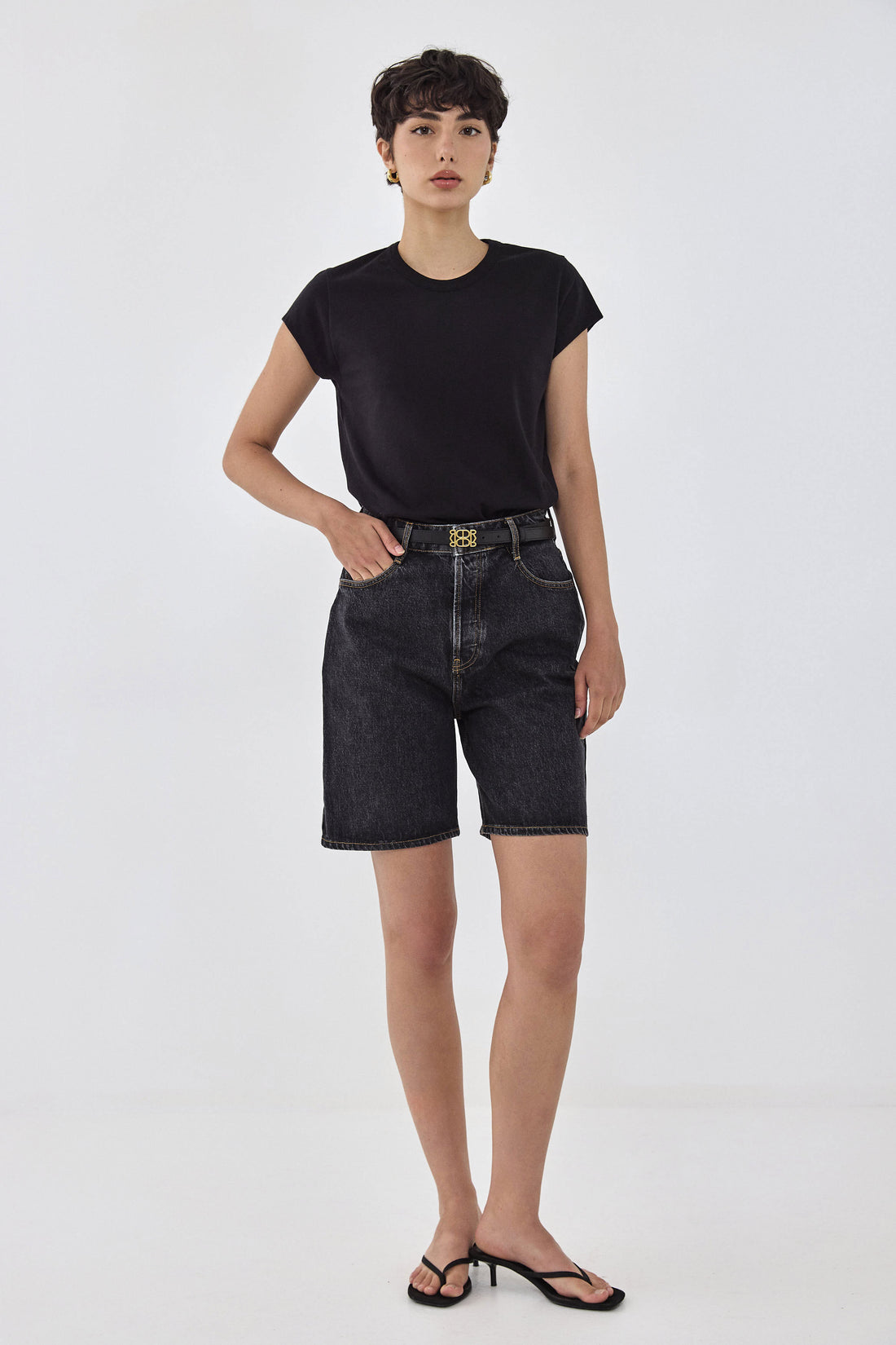 Your new go to everyday T-shirt. Classic crew neckline. Made from a thick heavy cotton composition, maintaining its shape all day long. Mini short sleeves. Embroidered tonal logo detailing at the front of the shirt, just the waistline. Style it with your favorite daddy bottom, croco belt and cat eye sunglasses for a Parisian summer look.