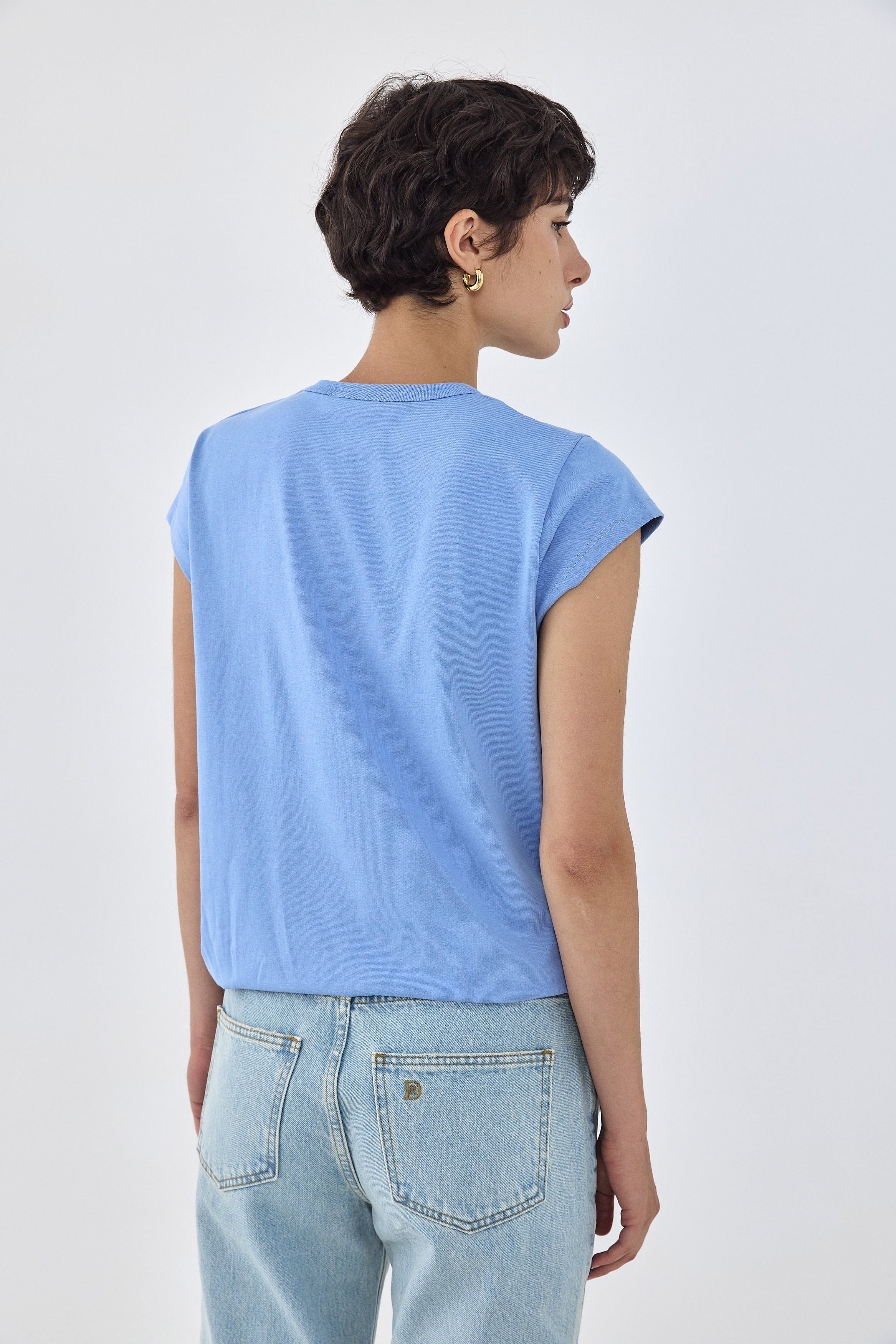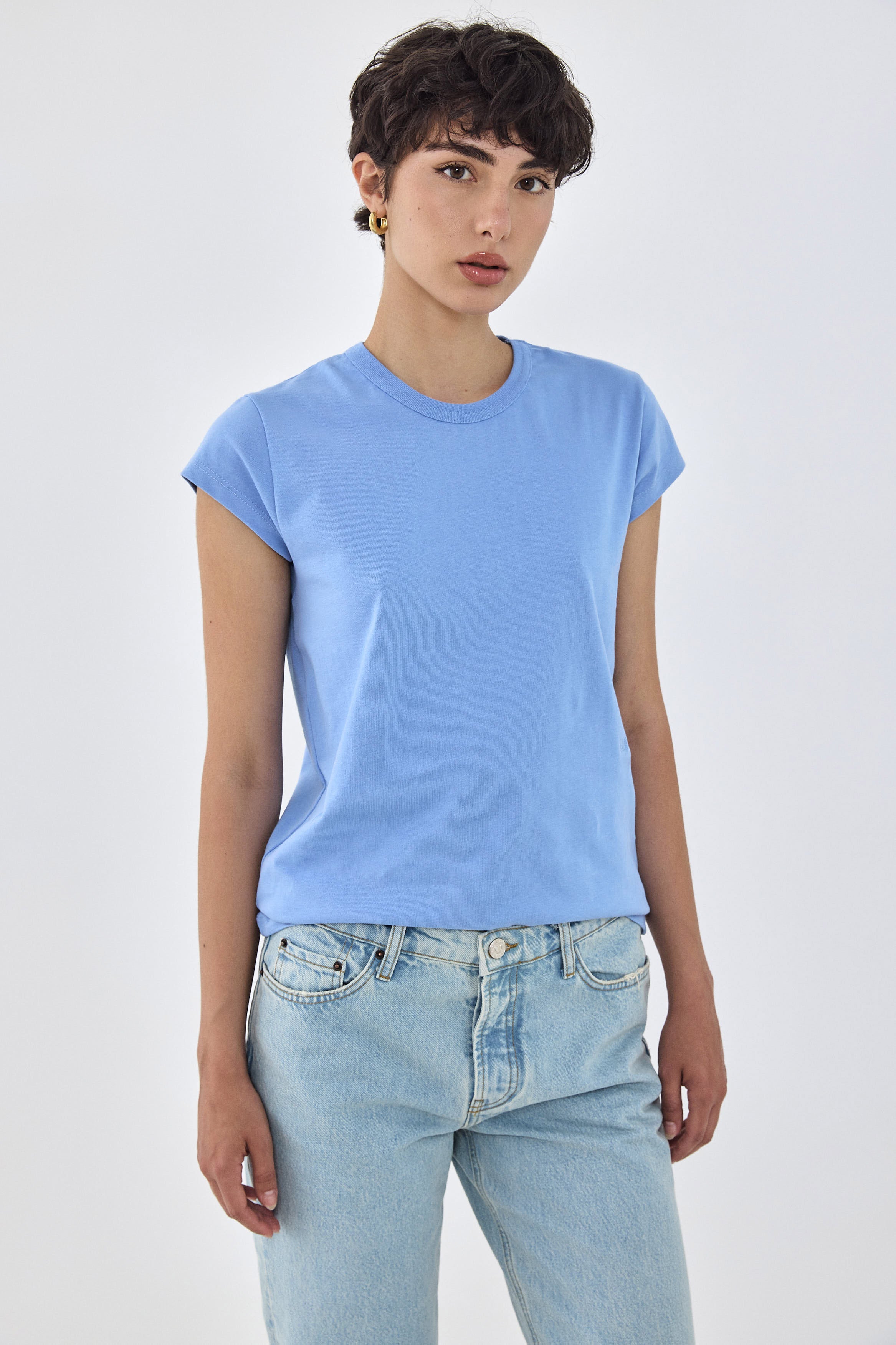 Your new go to everyday T-shirt. Classic crew neckline. Made from a thick heavy cotton composition, maintaining its shape all day long. Mini short sleeves. Embroidered tonal logo detailing at the front of the shirt, just the waistline. Style it with your favorite daddy bottom, croco belt and cat eye sunglasses for a Parisian summer look.