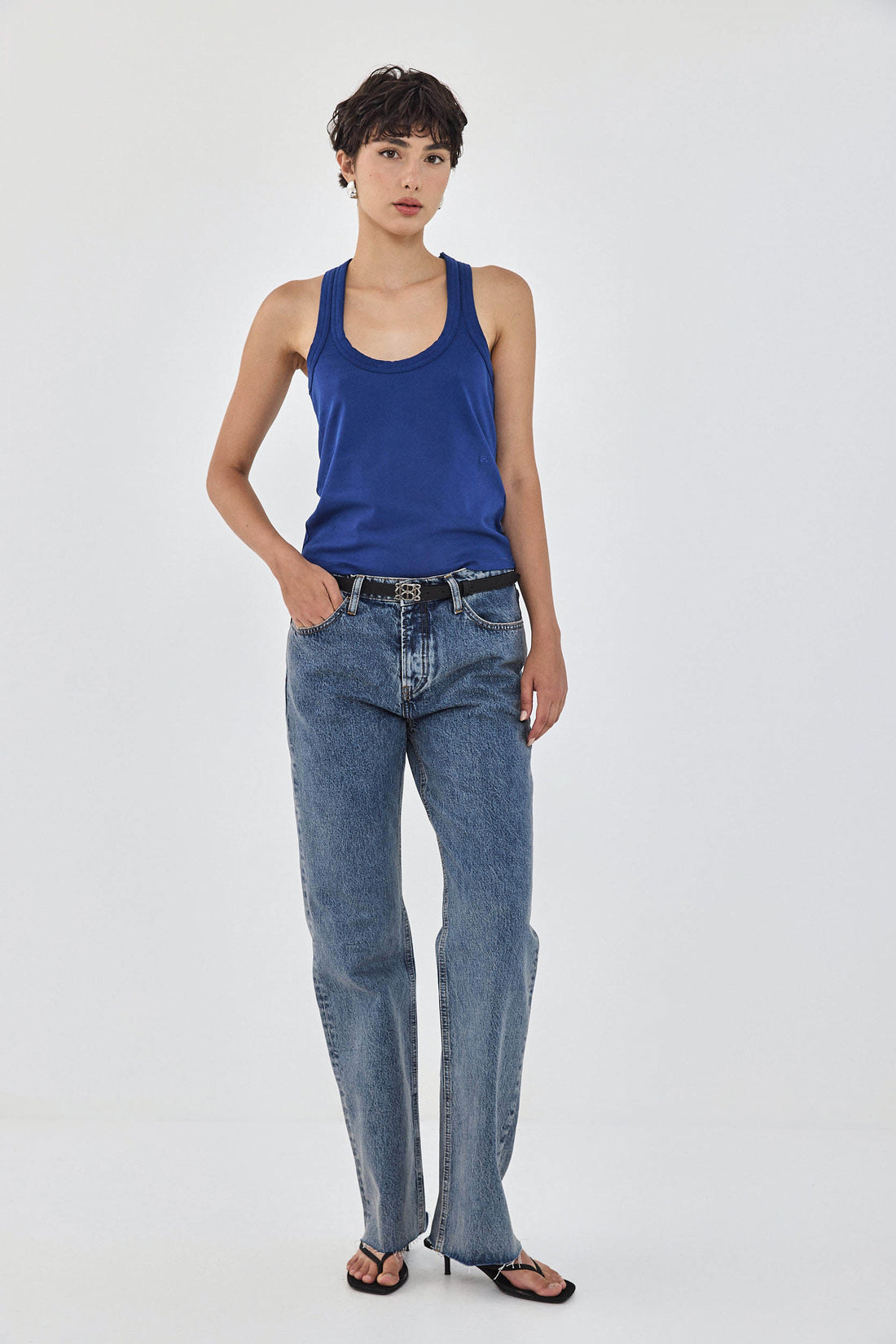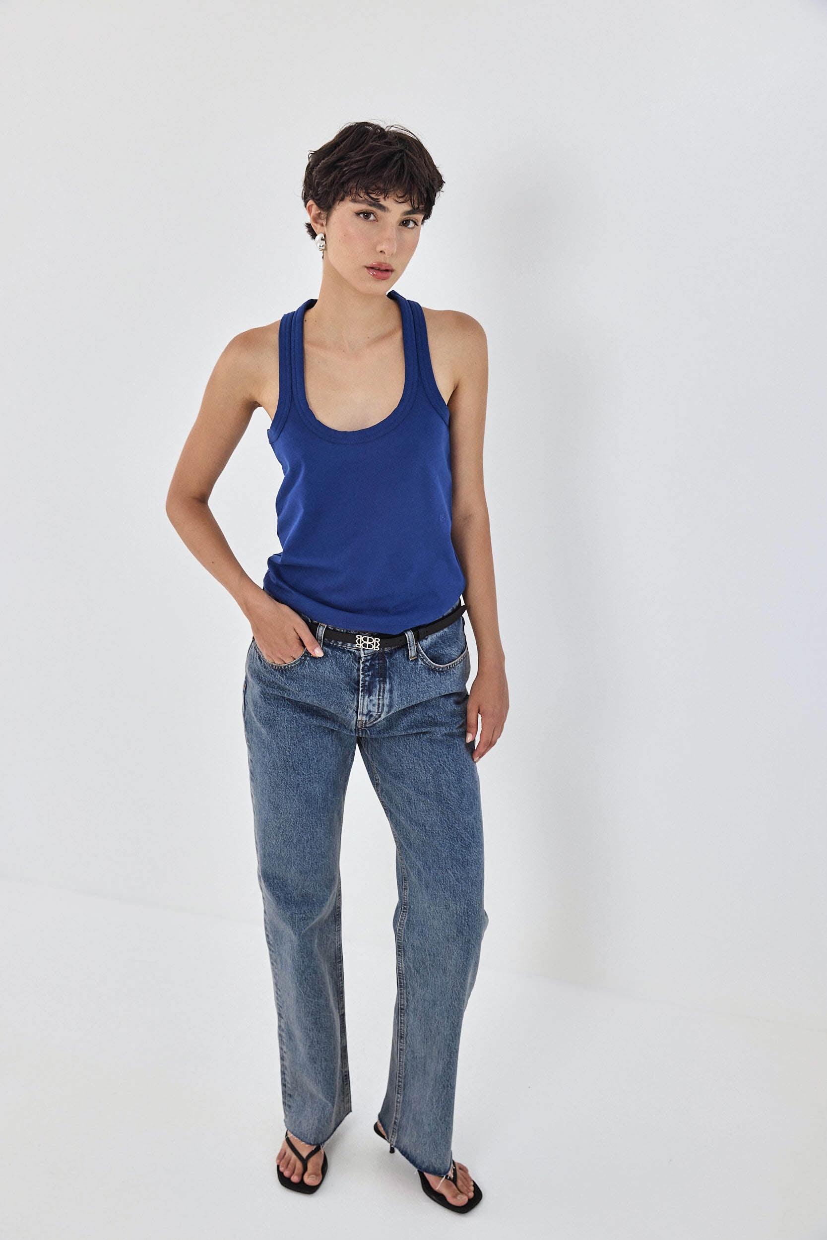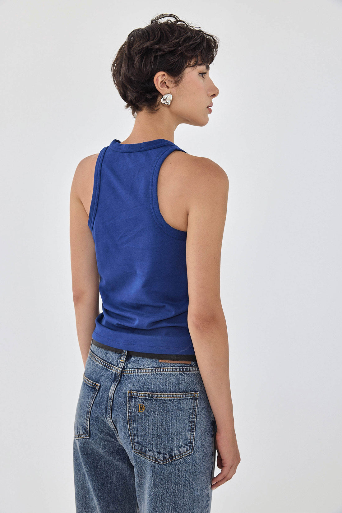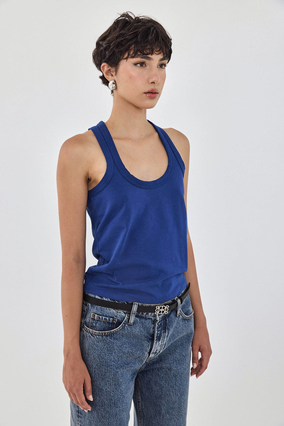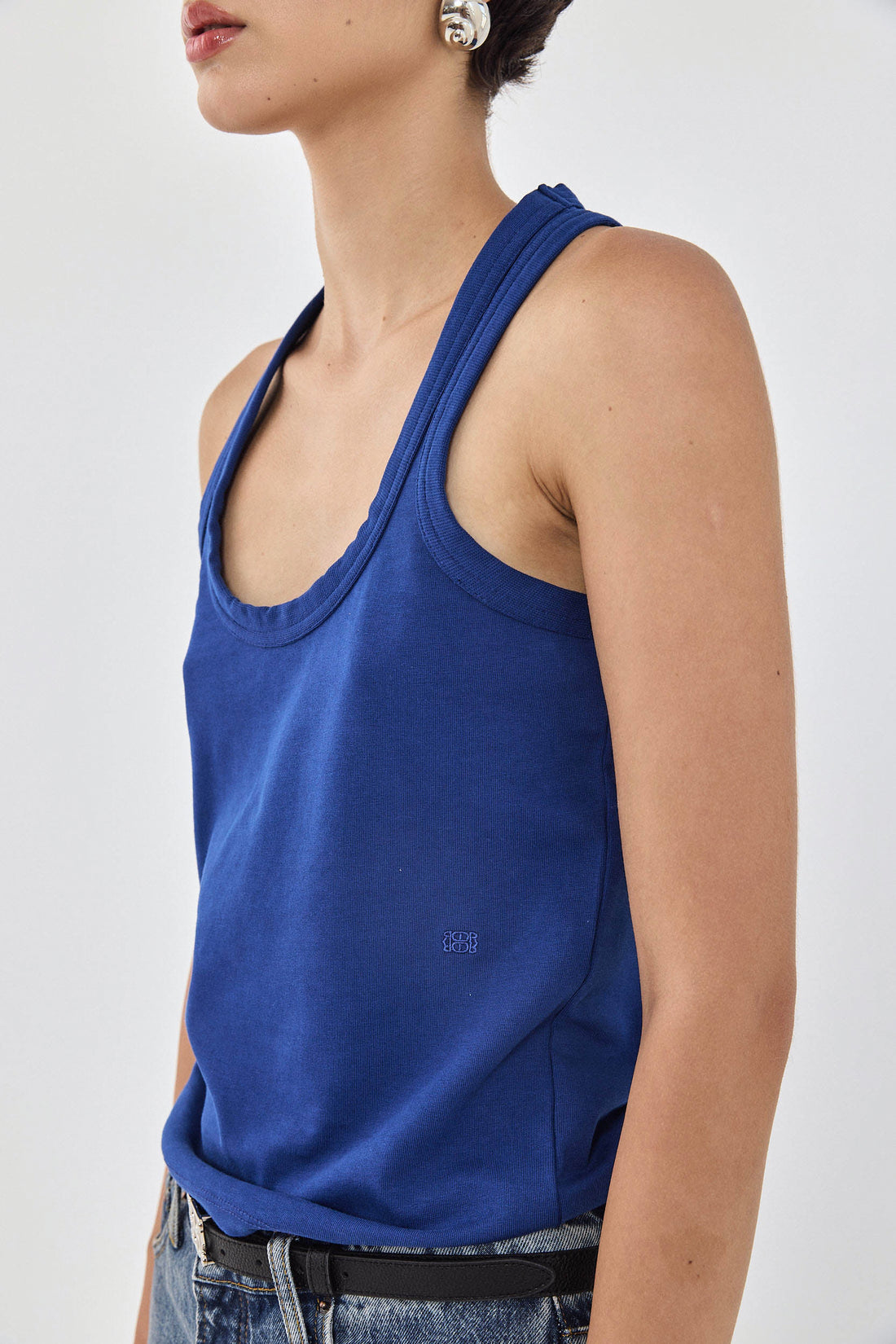 Your new favorite deep scooped tank top. Made from a thick heavy cotton composition, maintaining its shape all day long. Embroidered tonal logo detailing at the front of the shirt, just above the waistline. Racer silhouette at the back. Style it with the drill cotton maxi skirt, a belt to cinch the waist and golden accessories to tie the whole look together.