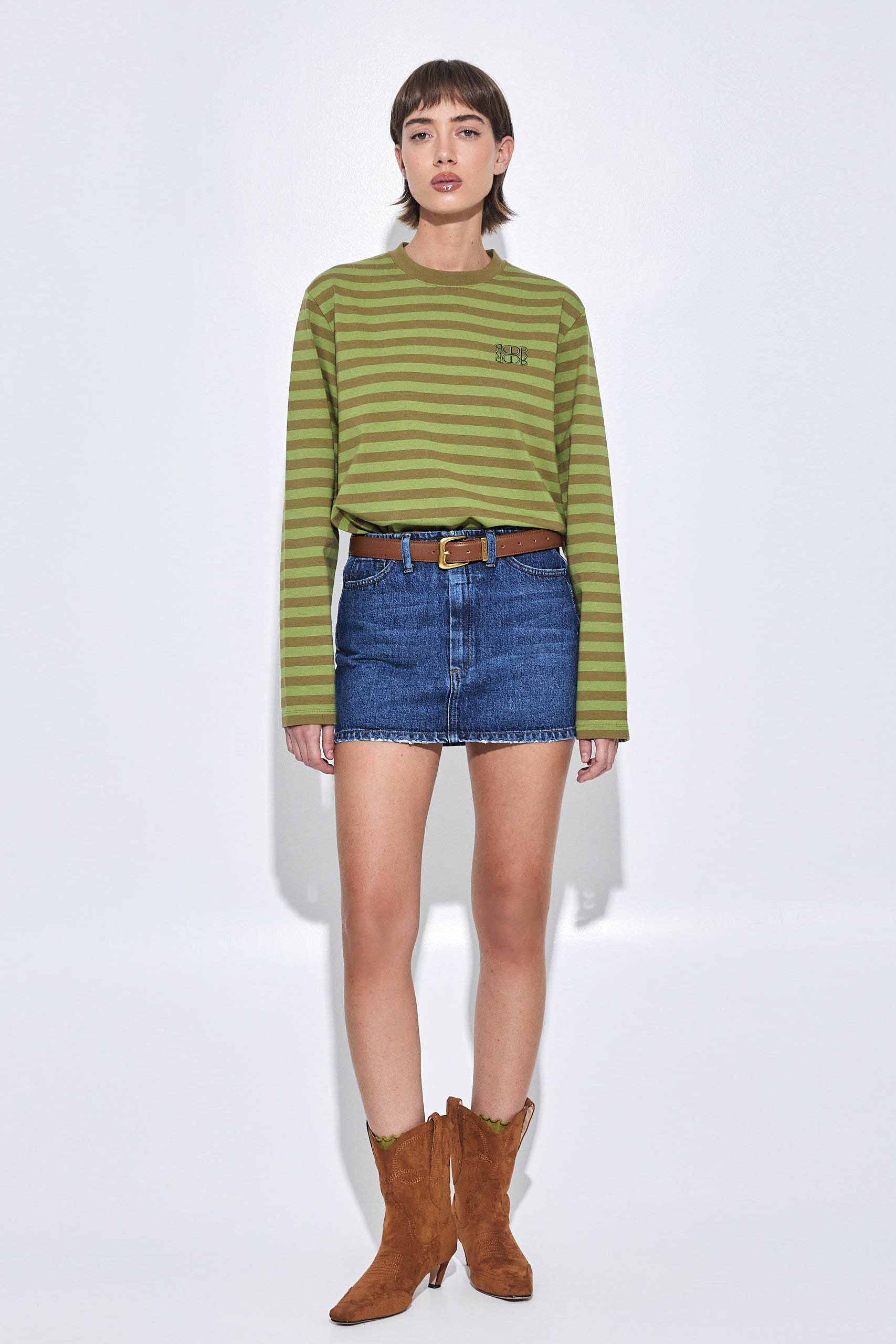 Our long sleeved striped shirt is the ultimate piece for layering this winter. Crewneck top. Oversized fit. Featuring a tonal embroidered logo on the front. Drop sleeve shoulders. Style it with our high waisted denim, our classic long trench and a pair of our beautiful oval sunnies for a an everyday cool look.