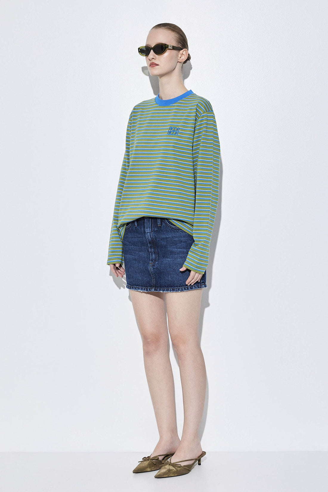 Our long sleeved striped shirt is the ultimate piece for layering this winter. Crewneck top. Oversized fit. Featuring a tonal embroidered logo on the front. Drop sleeve shoulders. Style it with our high waisted denim, our classic long trench and a pair of our beautiful oval sunnies for a an everyday cool look.
