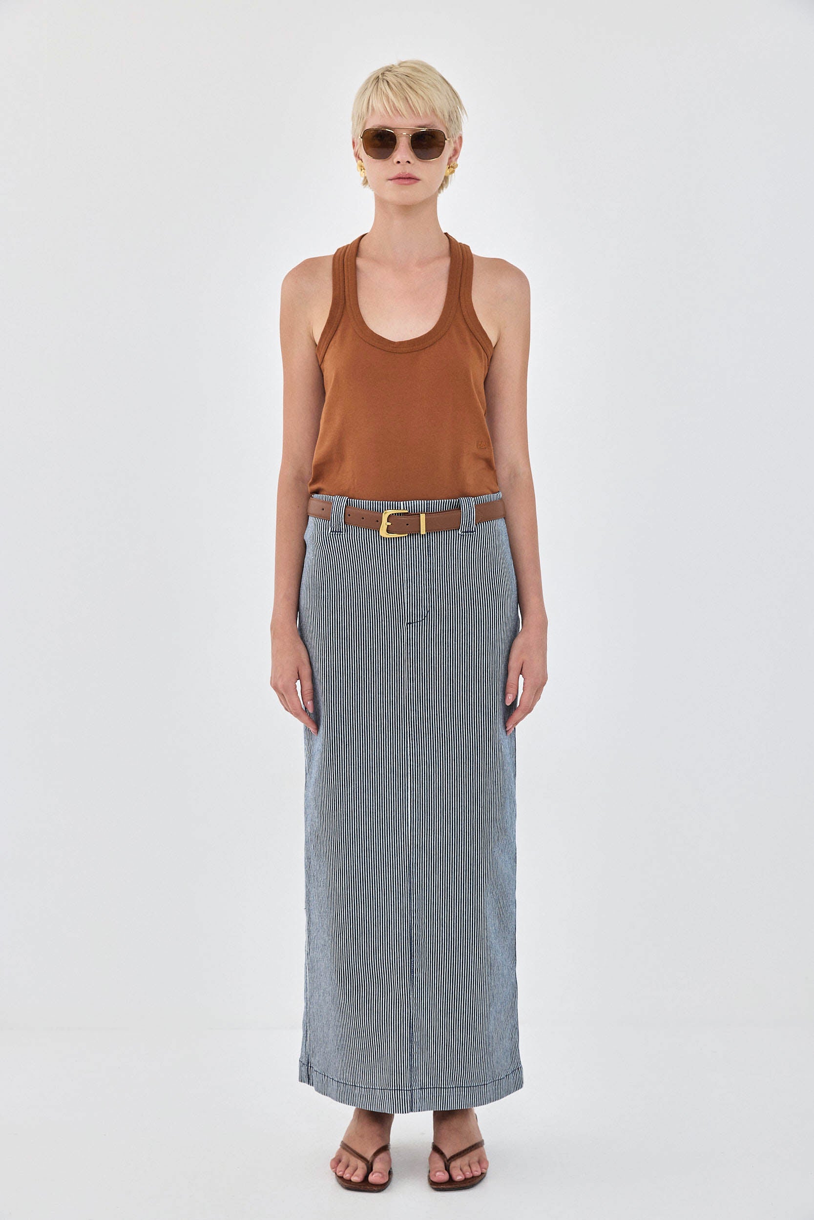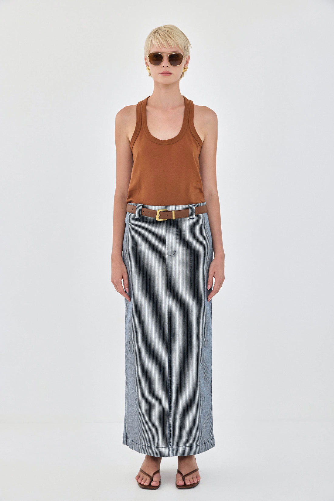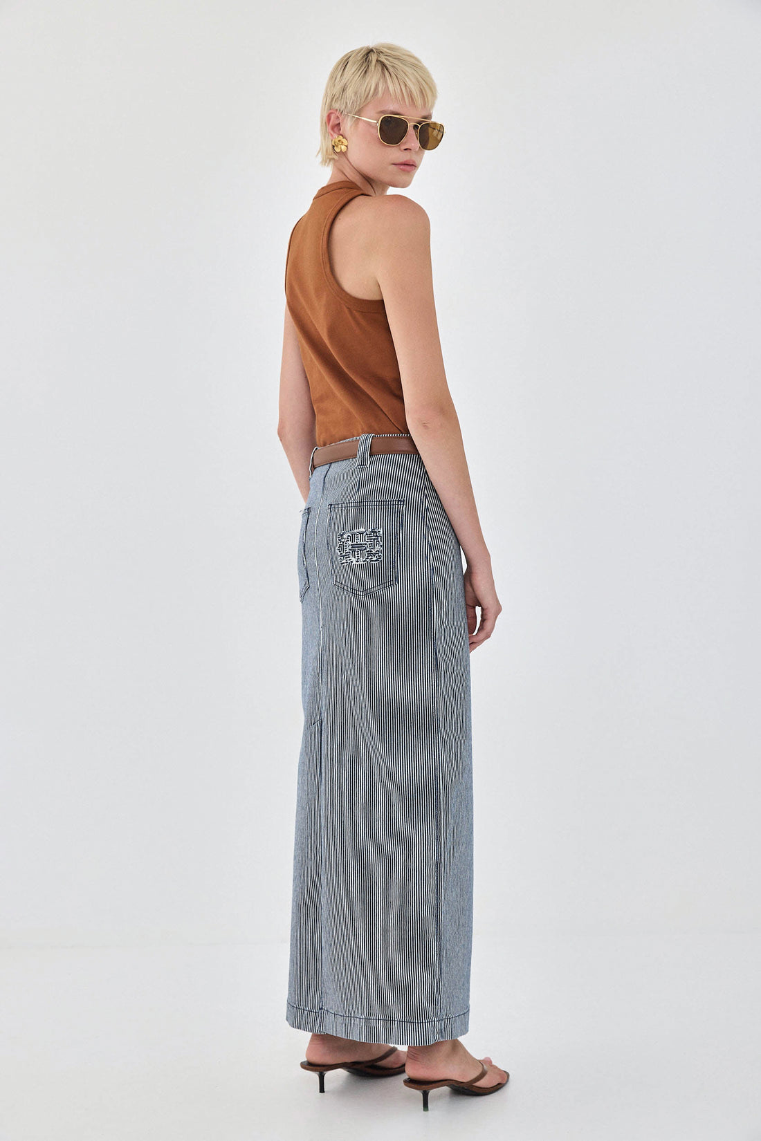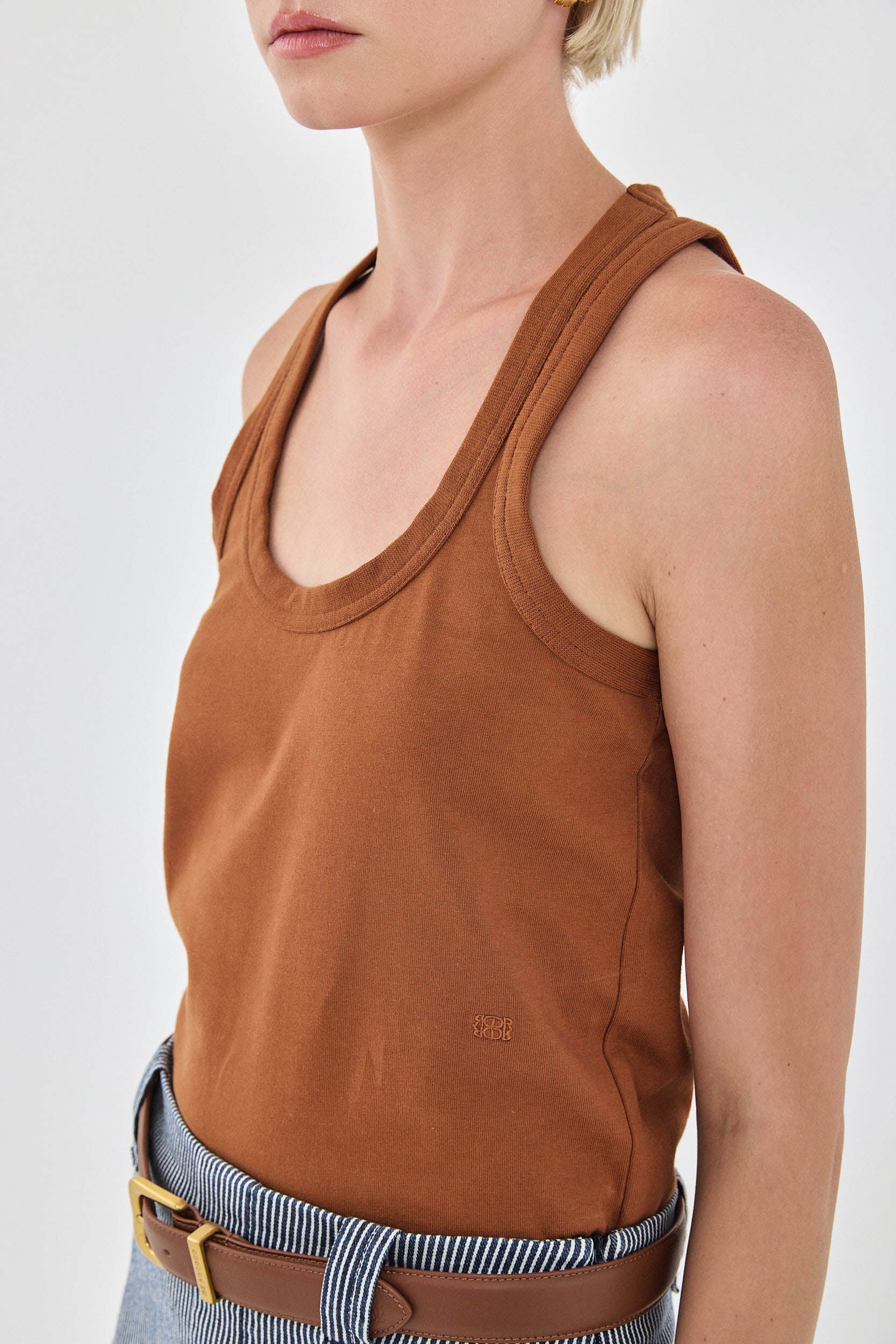 Your new favorite deep scooped tank top. Made from a thick heavy cotton composition, maintaining its shape all day long. Embroidered tonal logo detailing at the front of the shirt, just above the waistline. Racer silhouette at the back. Style it with the drill cotton maxi skirt, a belt to cinch the waist and golden accessories to tie the whole look together.