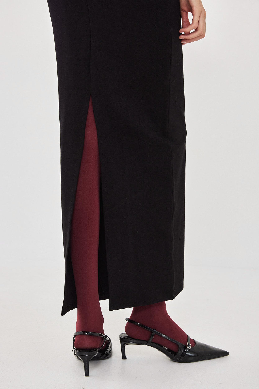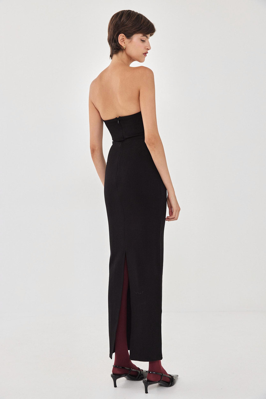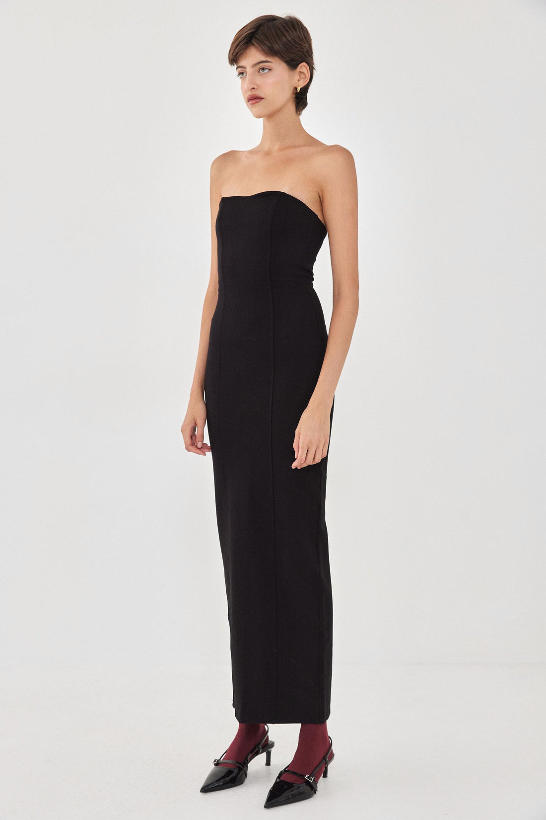 A strapless midi dress made from a body hugging jersey fabric. Features a corset silhouette with a princess cut. Has silicone straps for a better grip. Double layered at the chest. Back slit and a hidden back zipper closure. Style it with a pair of kitten heels and a clutch for the perfect going out look.
