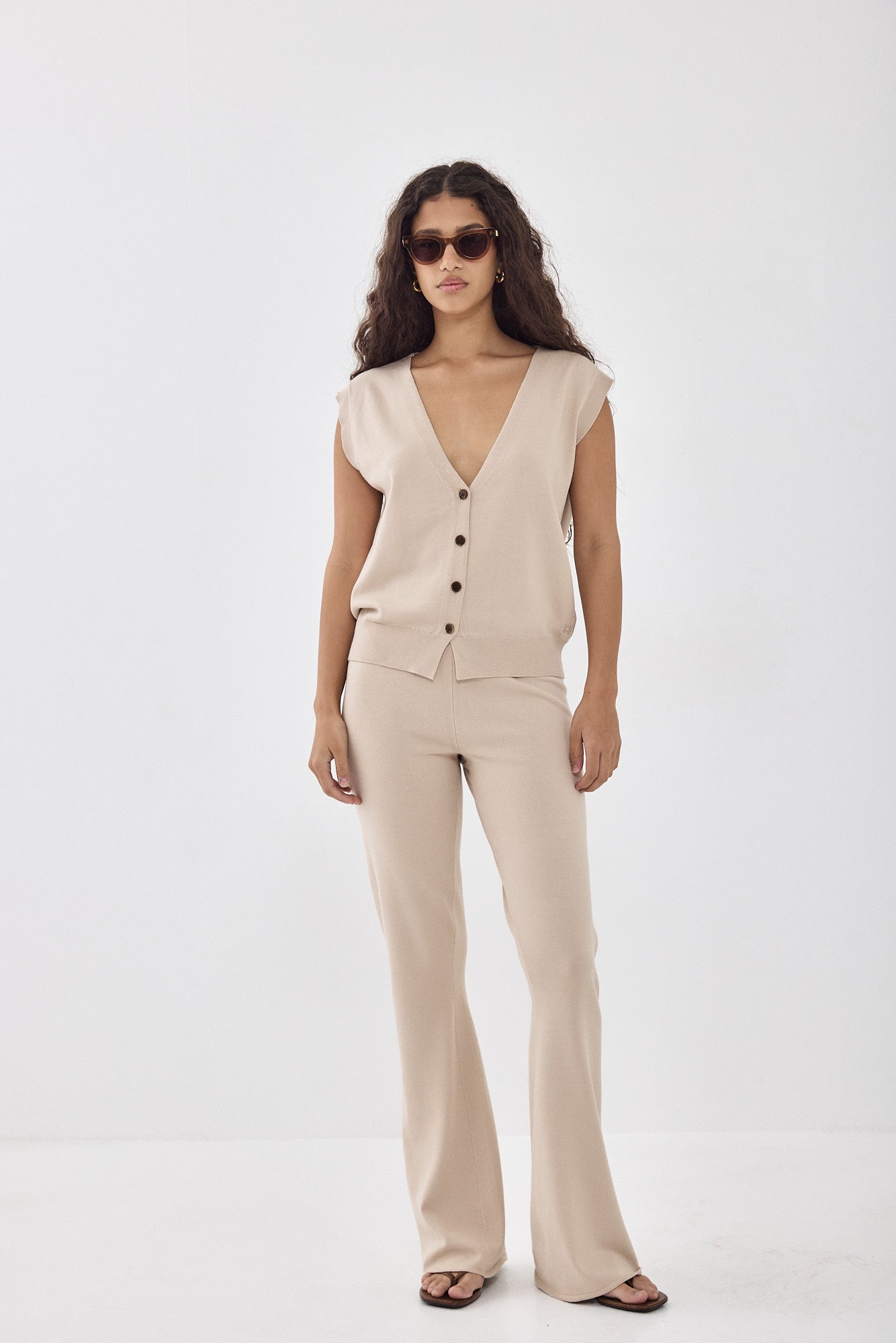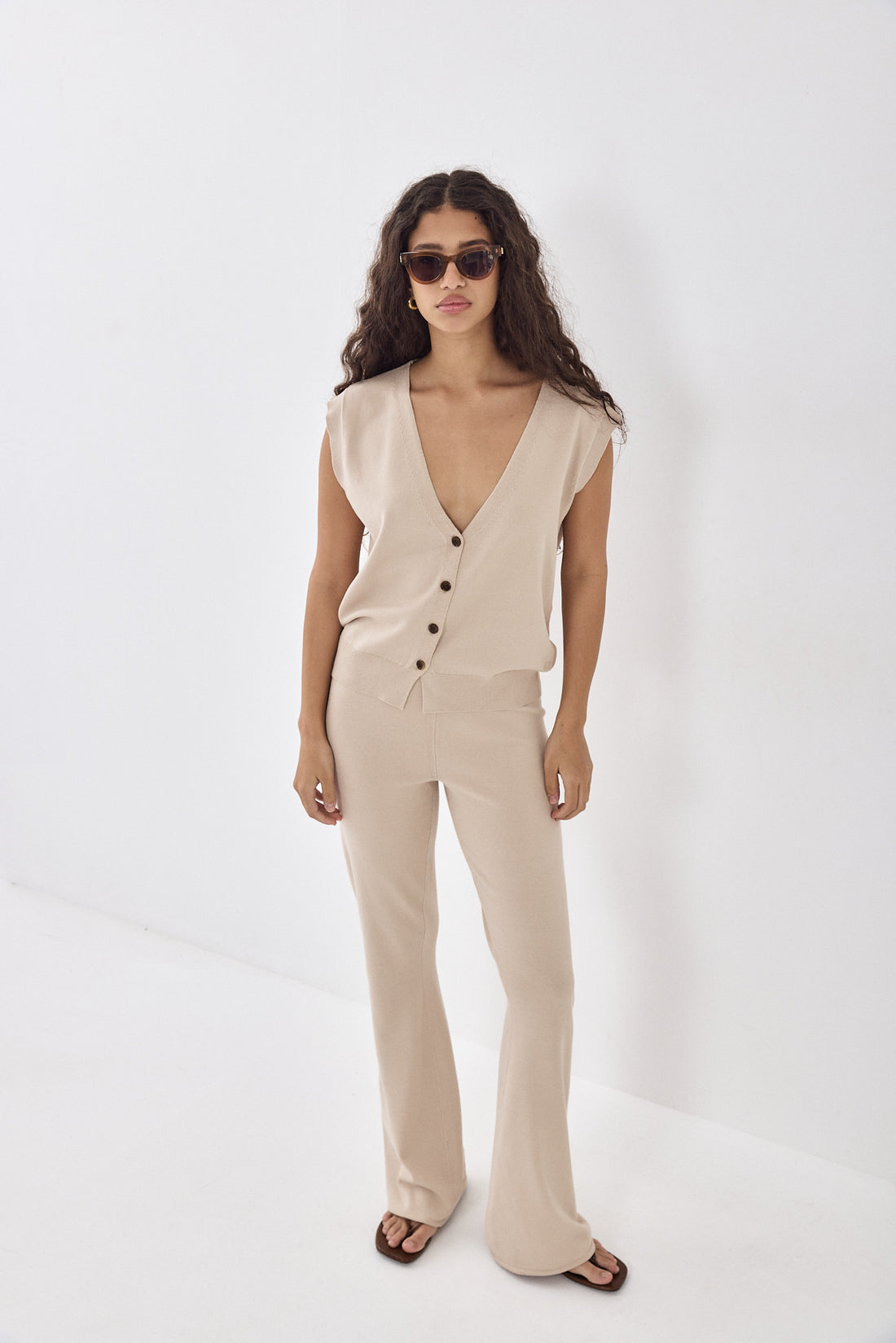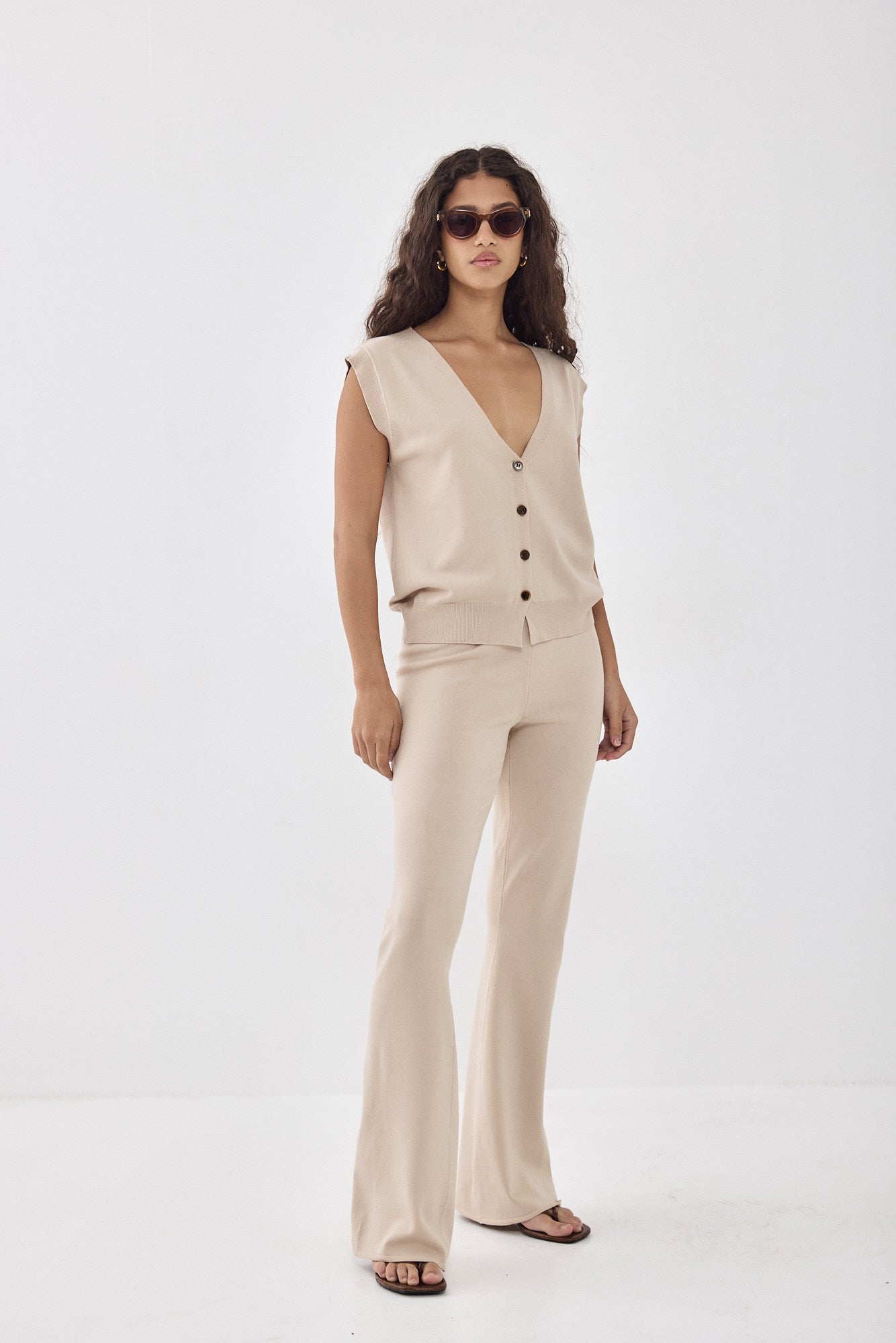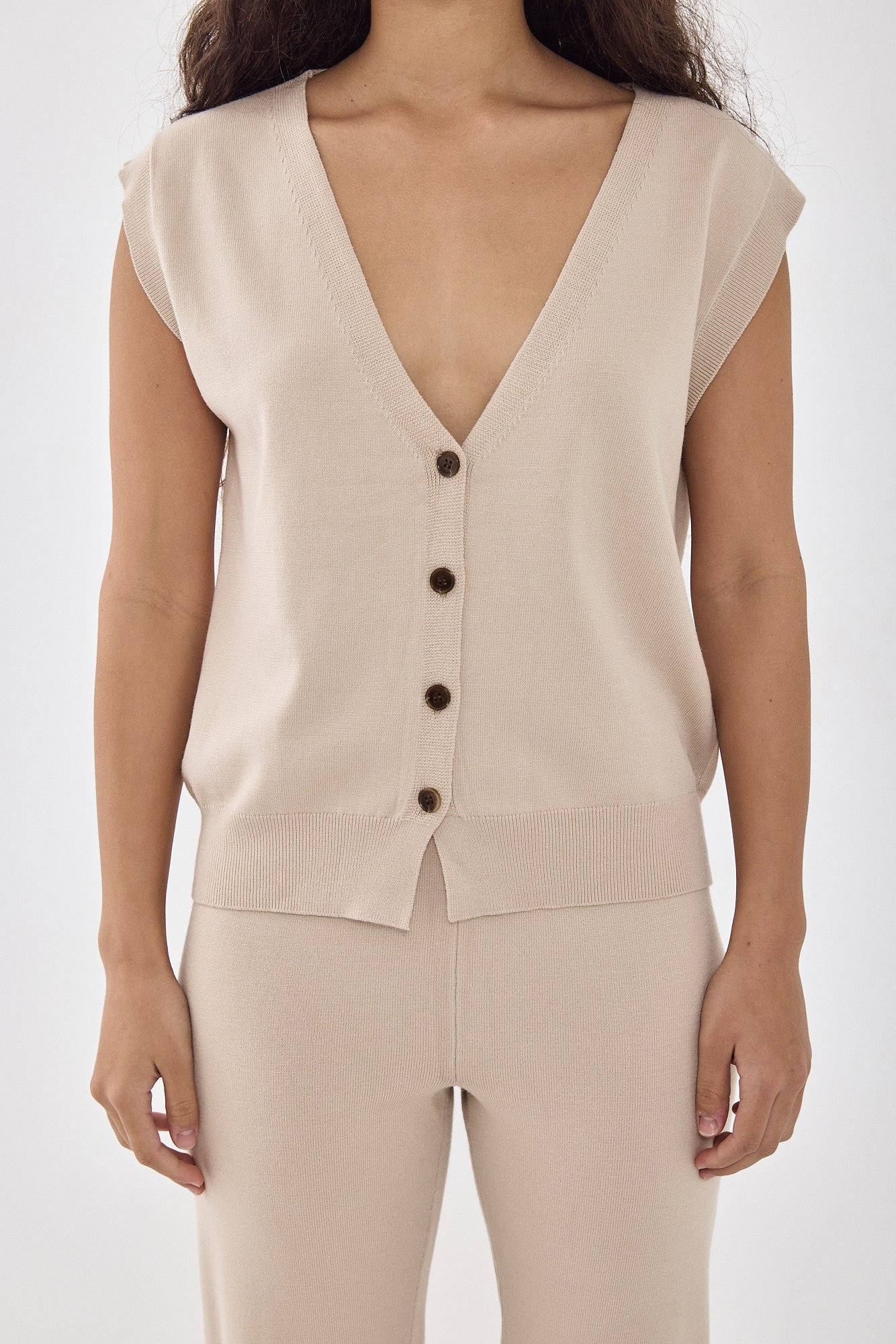 The perfect knit vest for spring. V neck silhouette. Ribbed finish with a slight cuff at the end. Embroidery logo detailing. Featuring a button closure. Delicate logo engraving on the buttons. Style it with your favorite matching bottom, delicate gold accessories and our Golden Aviator sunnies for a breezy and feminine spring look.