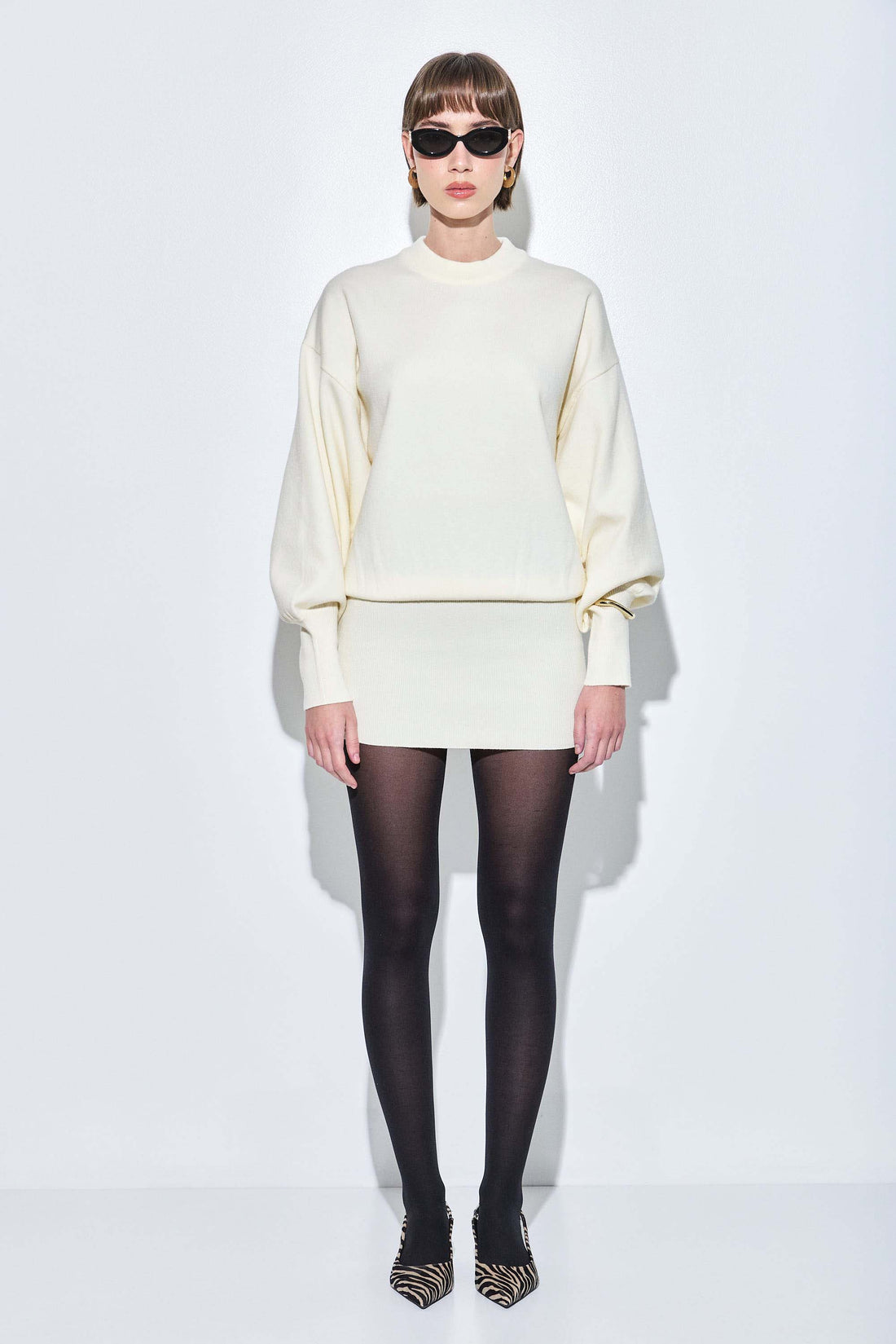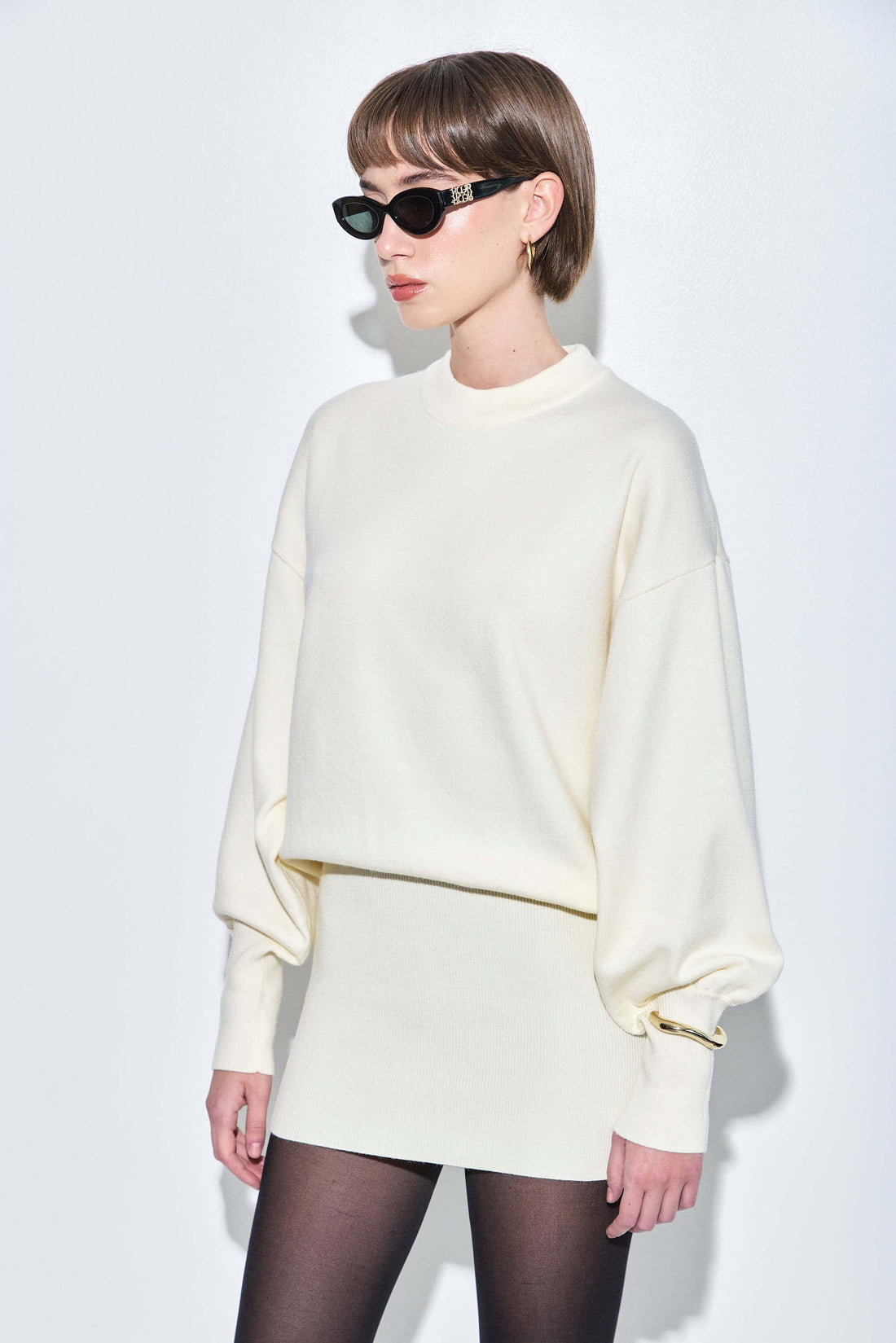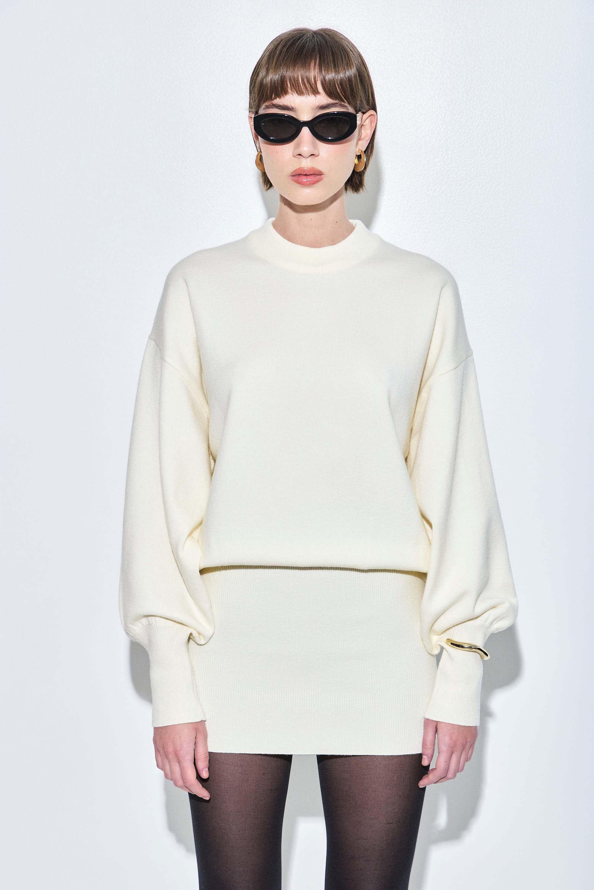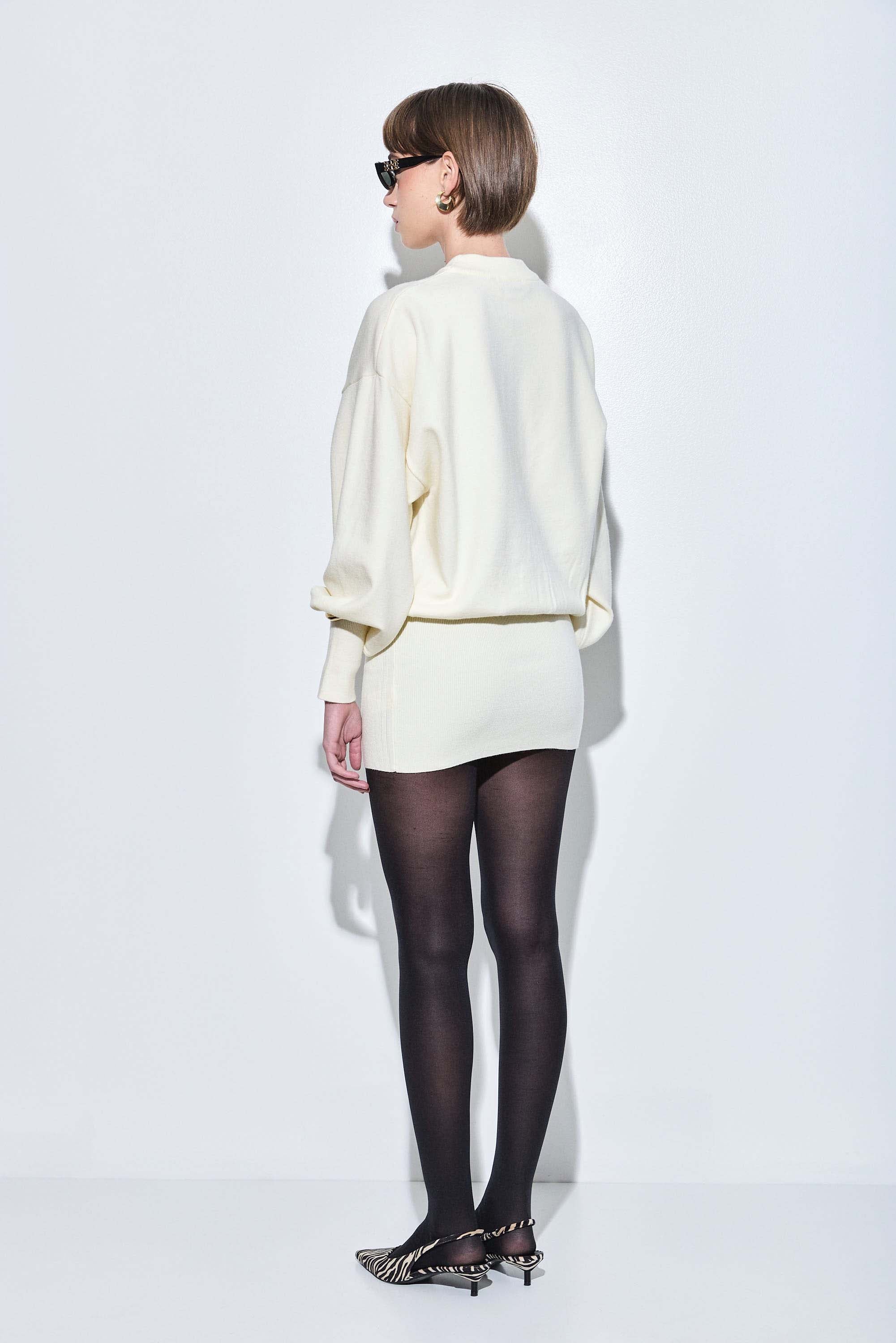 Our new long sleeved volume mini dress will take your wardrobe to the next level. Featuring voluminous and relaxed upper silhouette and a fitted bottom. Dropped Shoulders. Volume sleeves. Ribbed cuffs. Wide thick ribbed finish. Style it with our Vegan leather trench coat and a pair of our stylish oval sunglasses to seal this cool look.