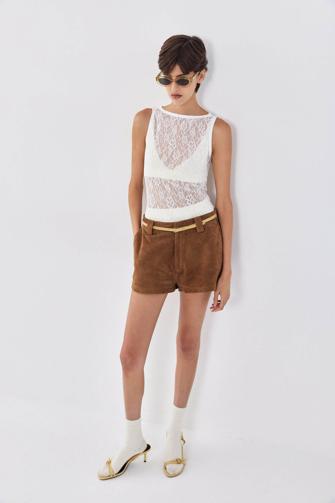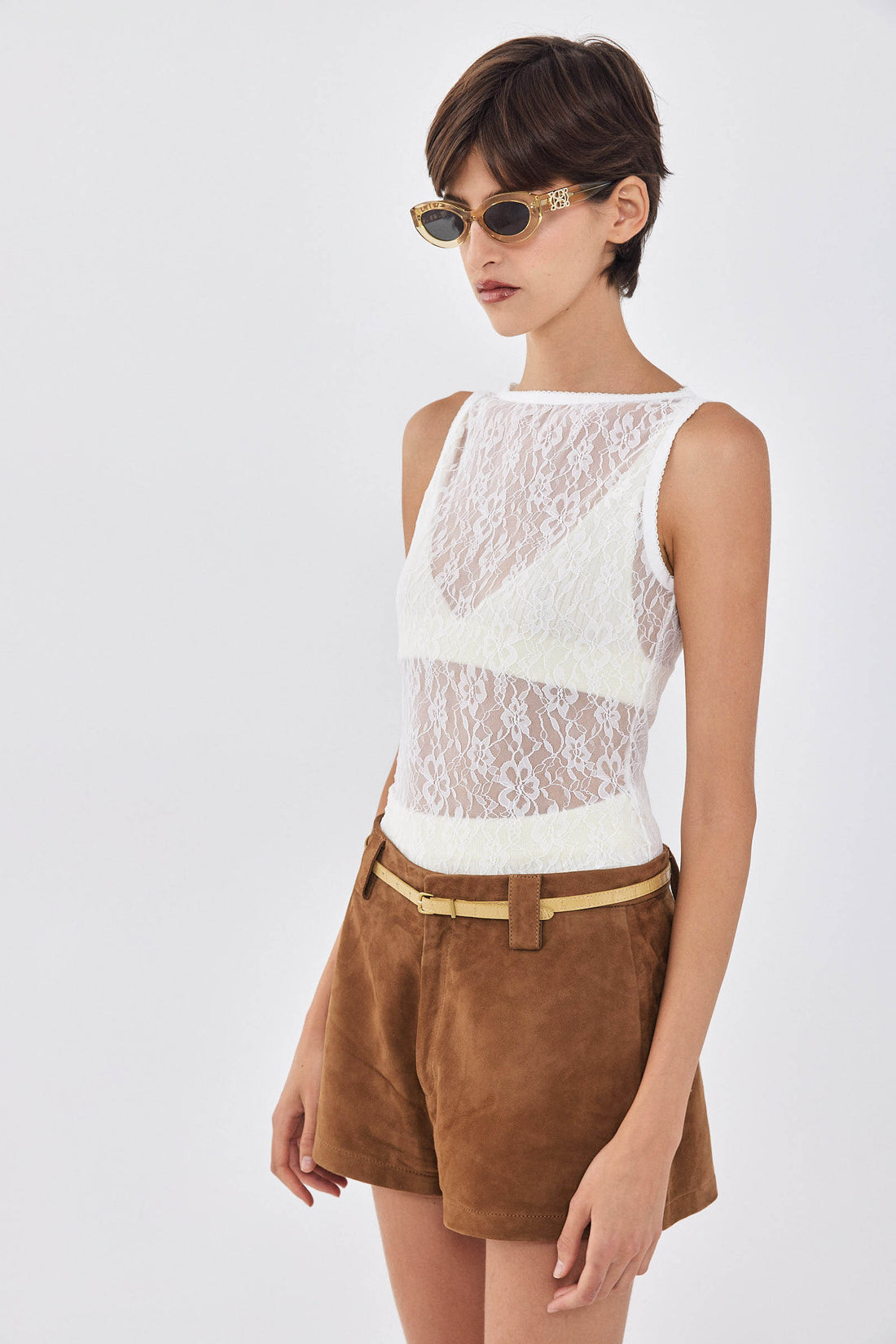Flower pattern lace bodysuit. Sleeveless boatneck. Stretchy material which hugs the body. Ultra-flattering. Cotton tonal logo patch at the back. Snap closure at the bottom. Thong silhouette. Style it with your favorite suede bottoms, lace lingerie underneath and your favorite pair of heels for a chic night out look.