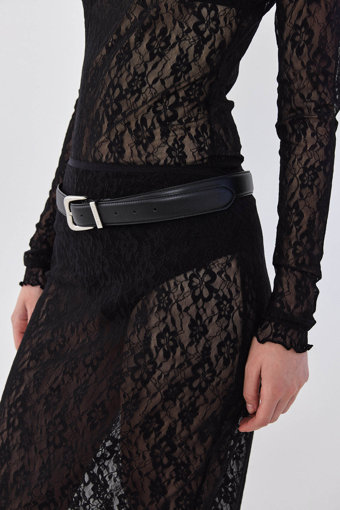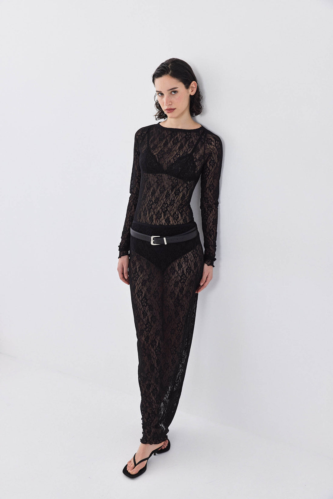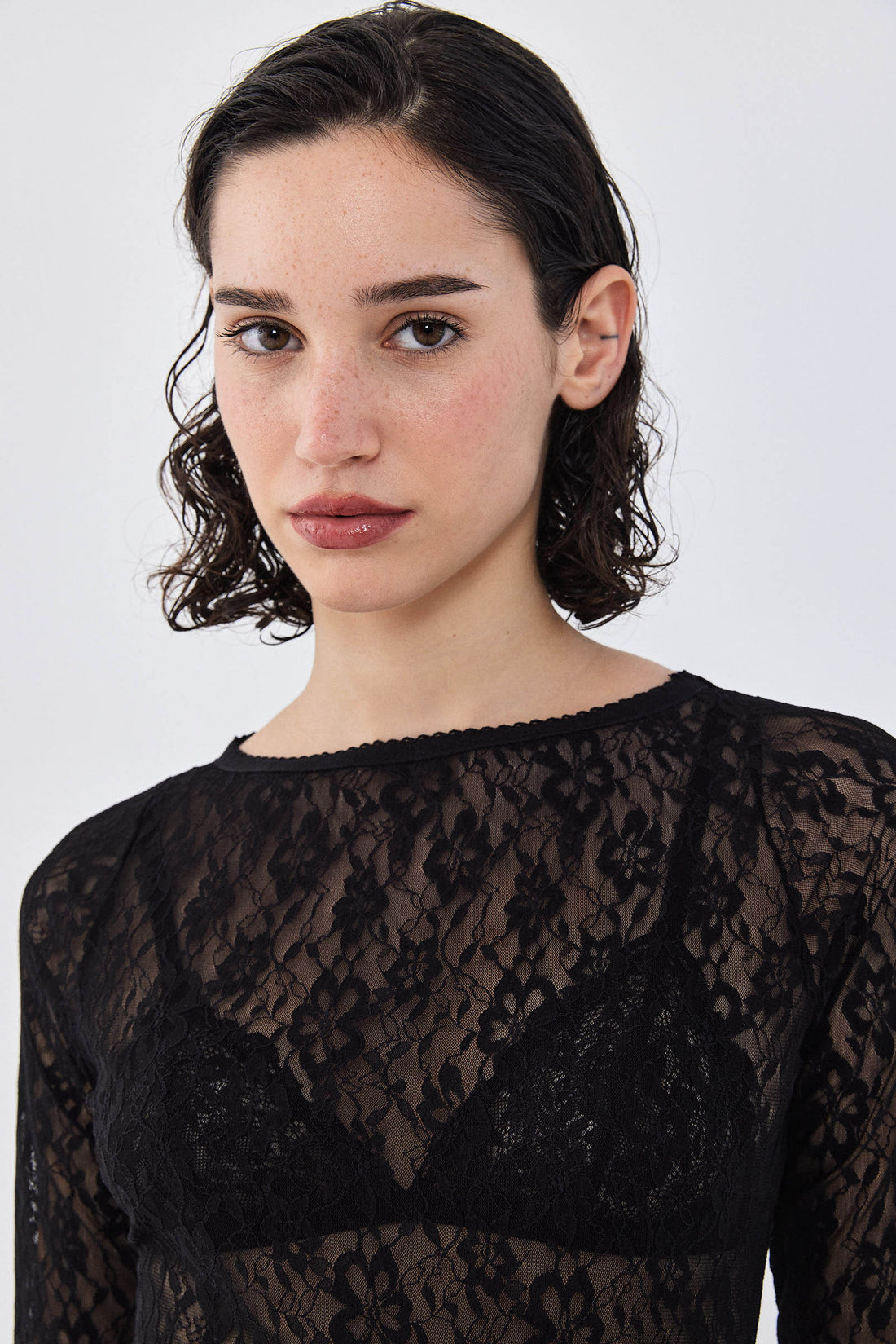 Long sleeved lace top. Boatneck neckline. Flowery lace pattern. Stretchy material which hugs the body. Cotton tonal logo patch at the back. Baby lock finish. Style it over your favorite lace bra, suede bottom and thin genuine leather belt for the an effortlessly chic autumn look.