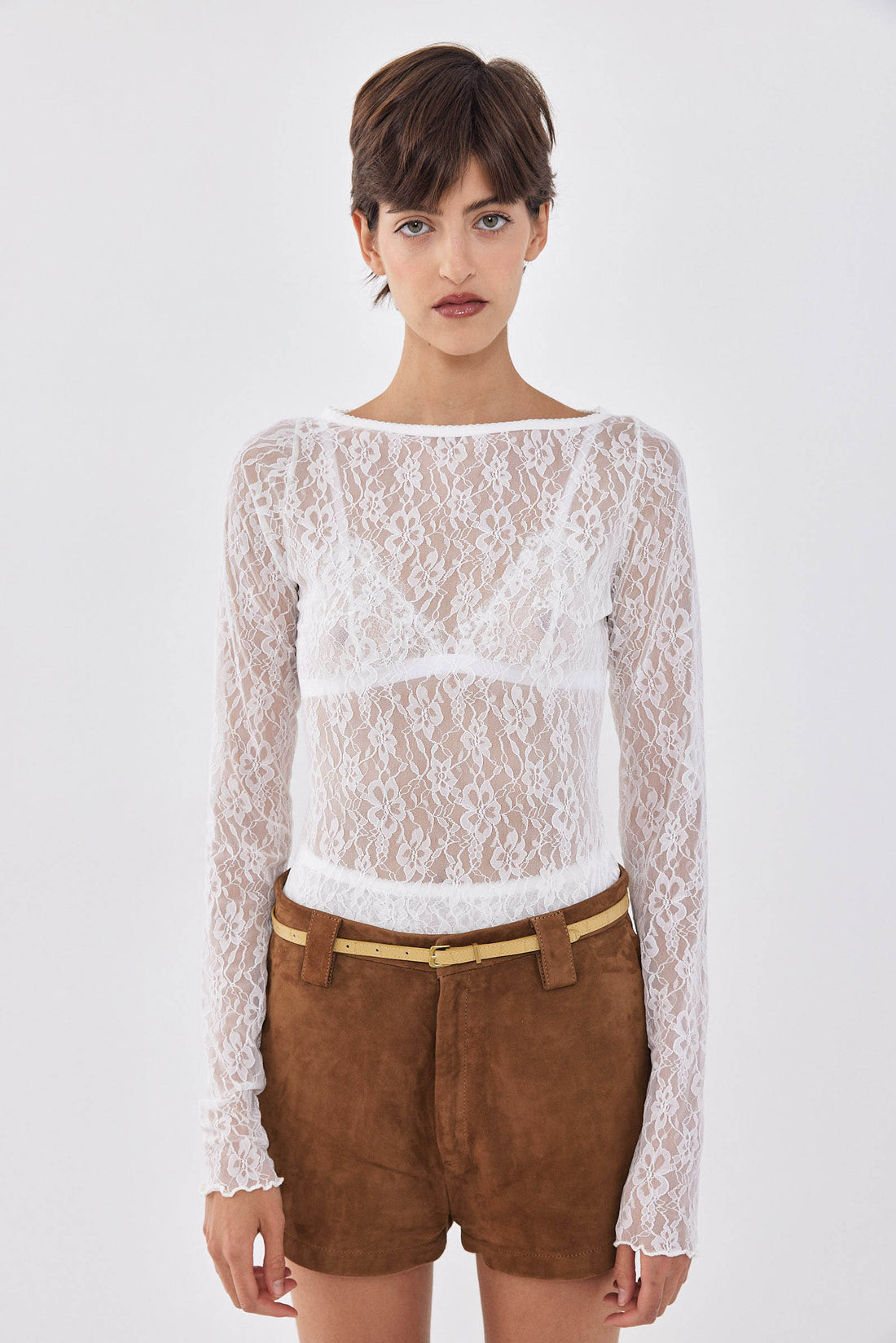 Long sleeved lace top. Boatneck neckline. Flowery lace pattern. Stretchy material which hugs the body. Cotton tonal logo patch at the back. Baby lock finish. Style it over your favorite lace bra, suede bottom and thin genuine leather belt for the an effortlessly chic autumn look.