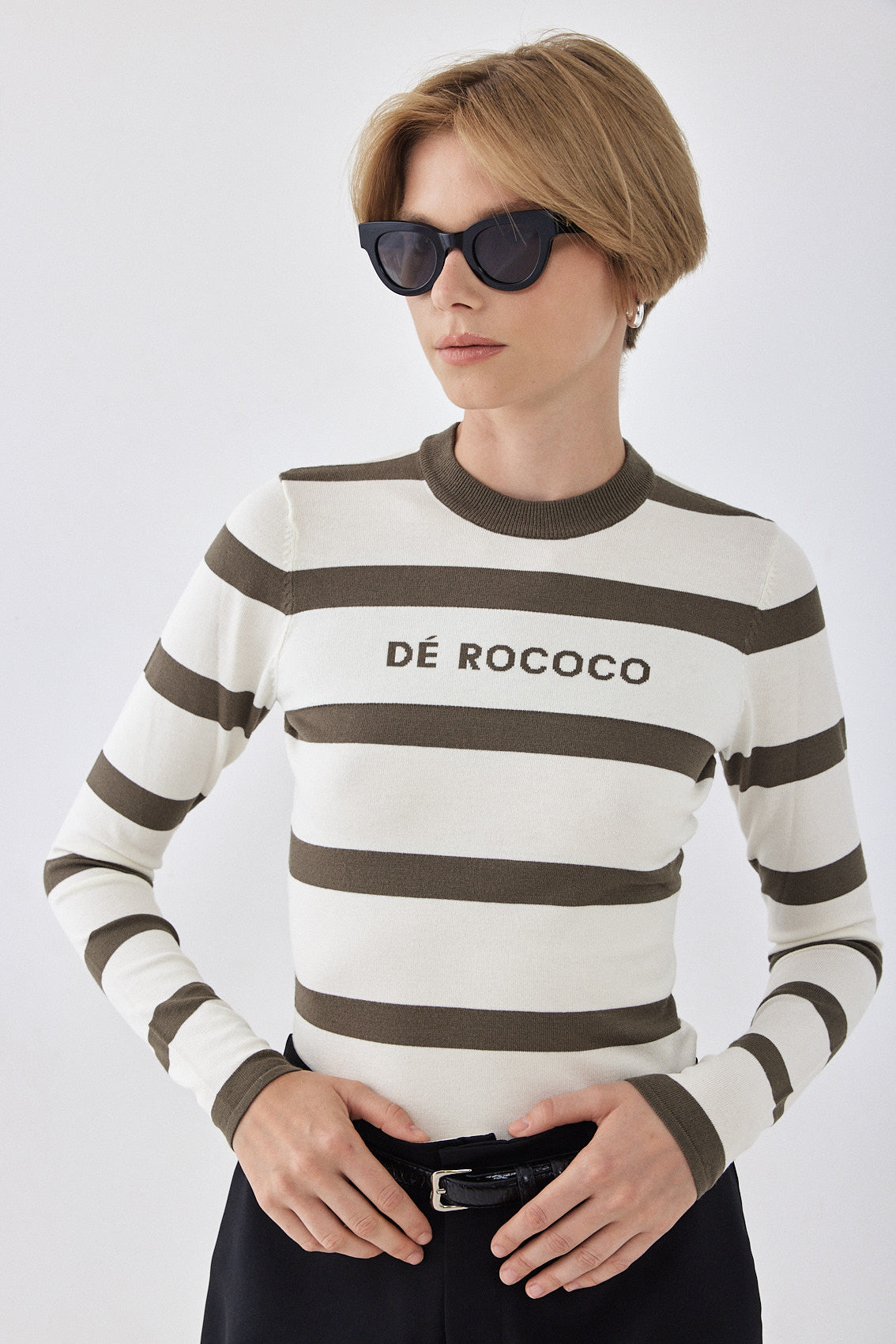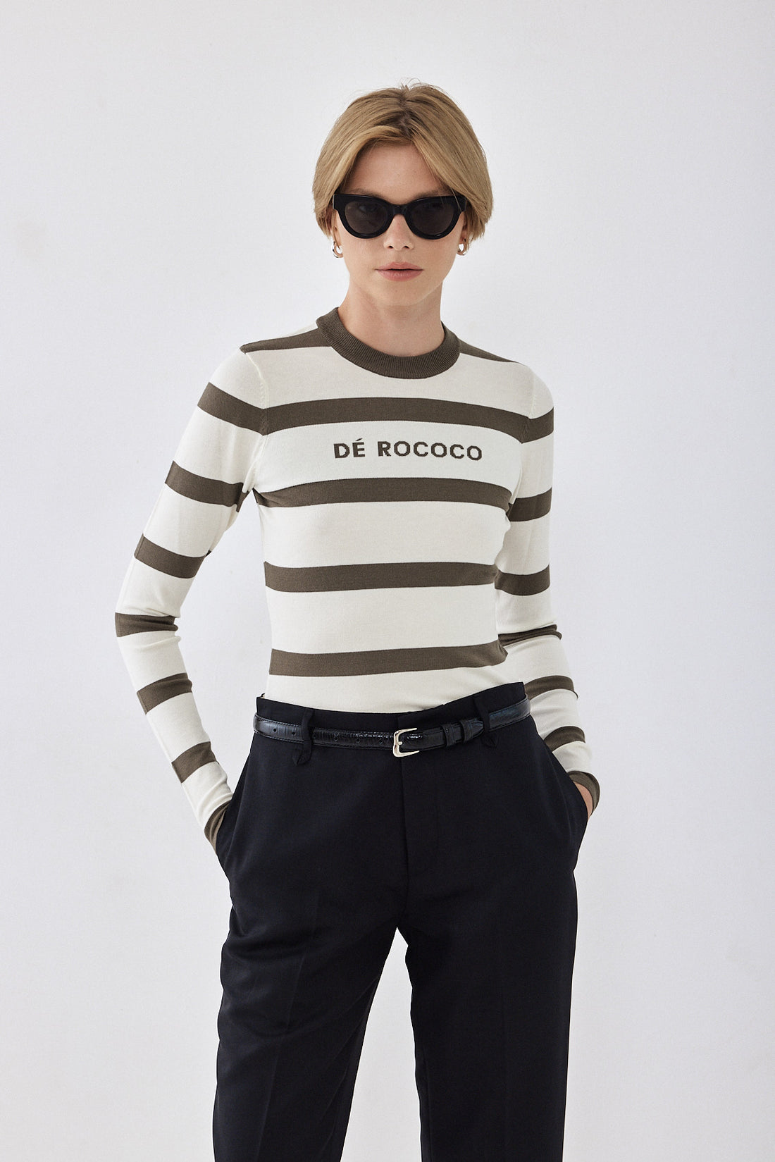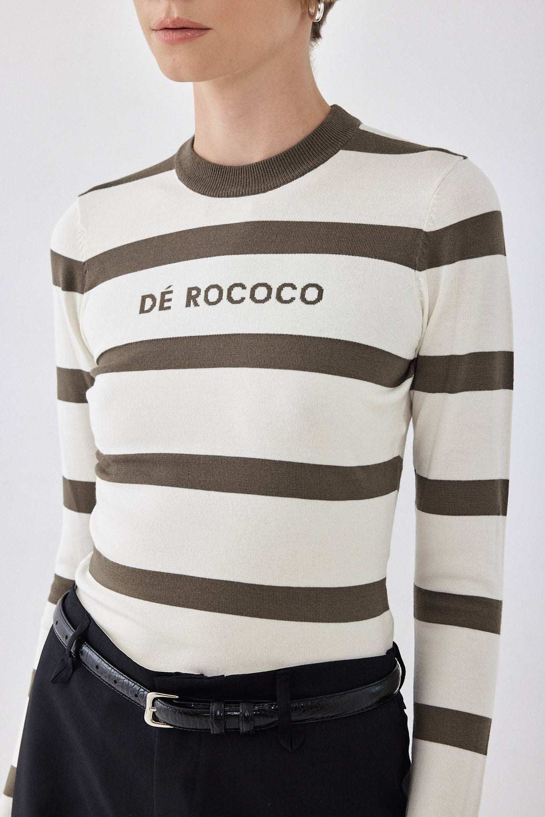 The ultimate knitted crewneck top. Featuring a crew neckline. Ribbed finish. Lightweight and breathable. Striped. Knitted logo on the front. Style it with your favorite pair of denim, our vegan leather trench coat and a chunky boot for a cool girl look.