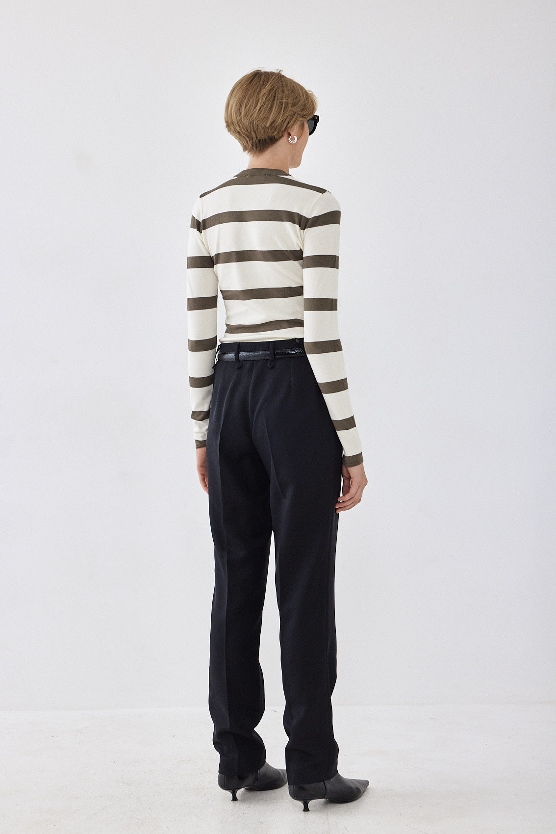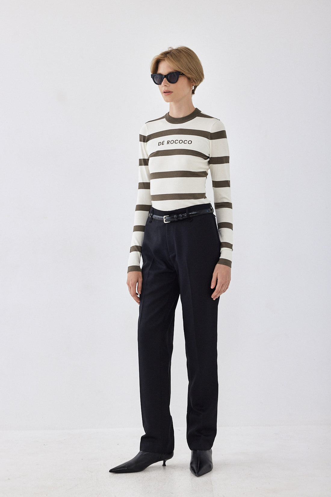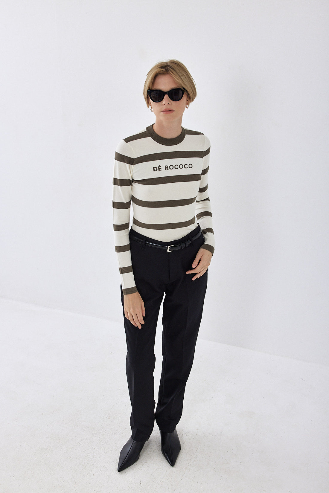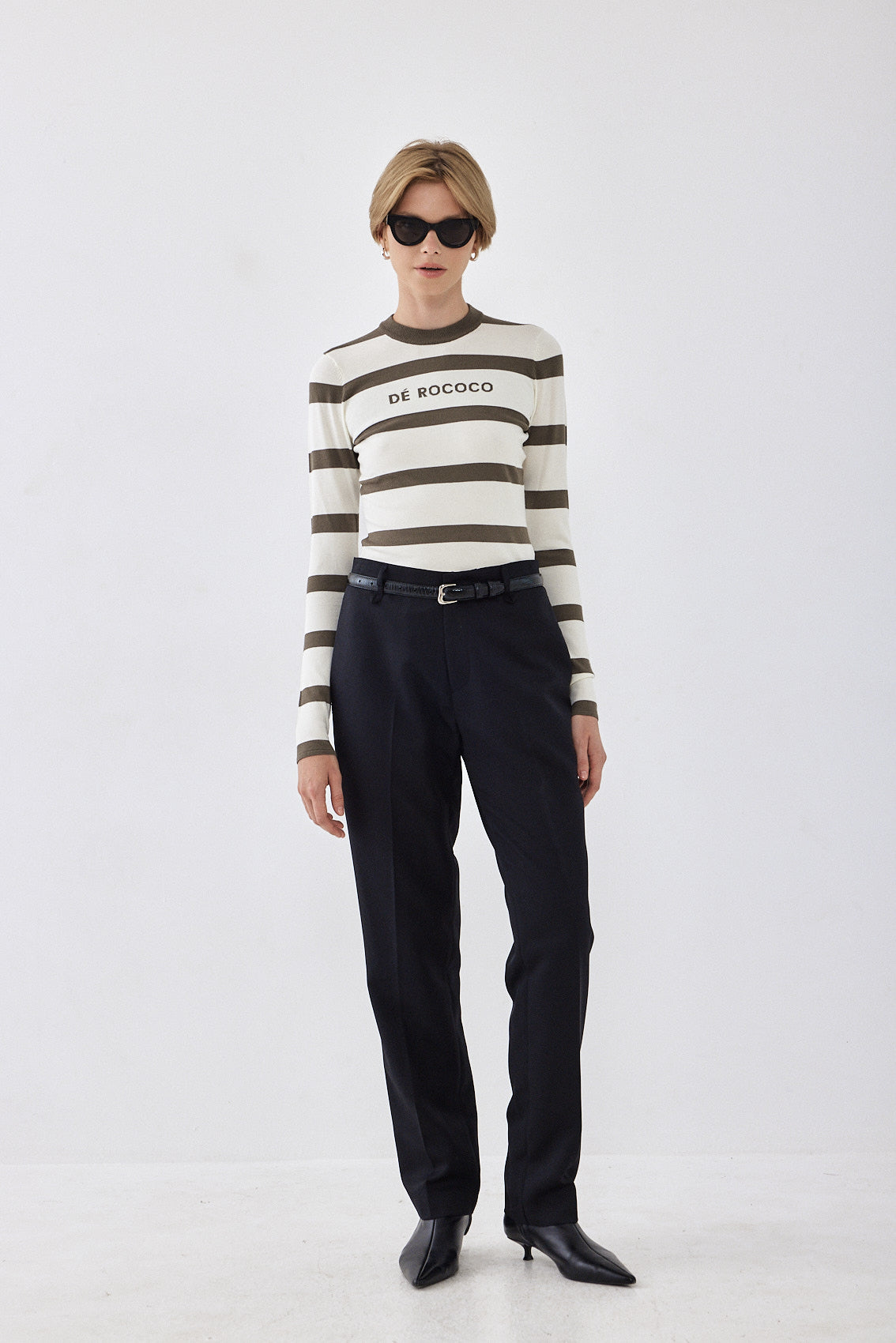 The ultimate knitted crewneck top. Featuring a crew neckline. Ribbed finish. Lightweight and breathable. Striped. Knitted logo on the front. Style it with your favorite pair of denim, our vegan leather trench coat and a chunky boot for a cool girl look.