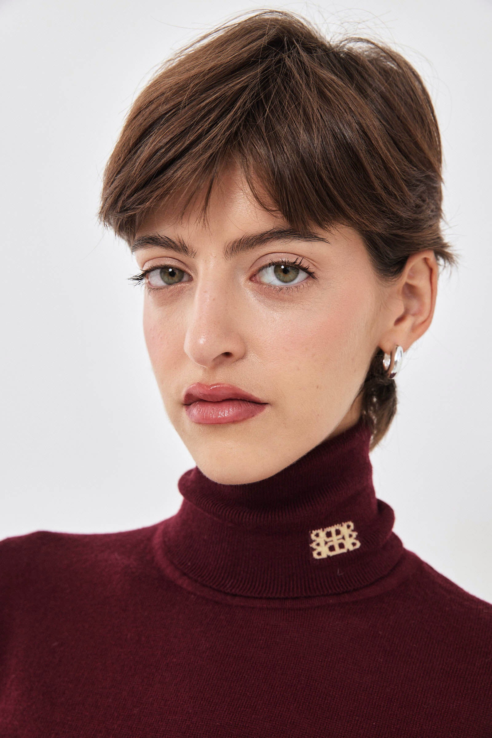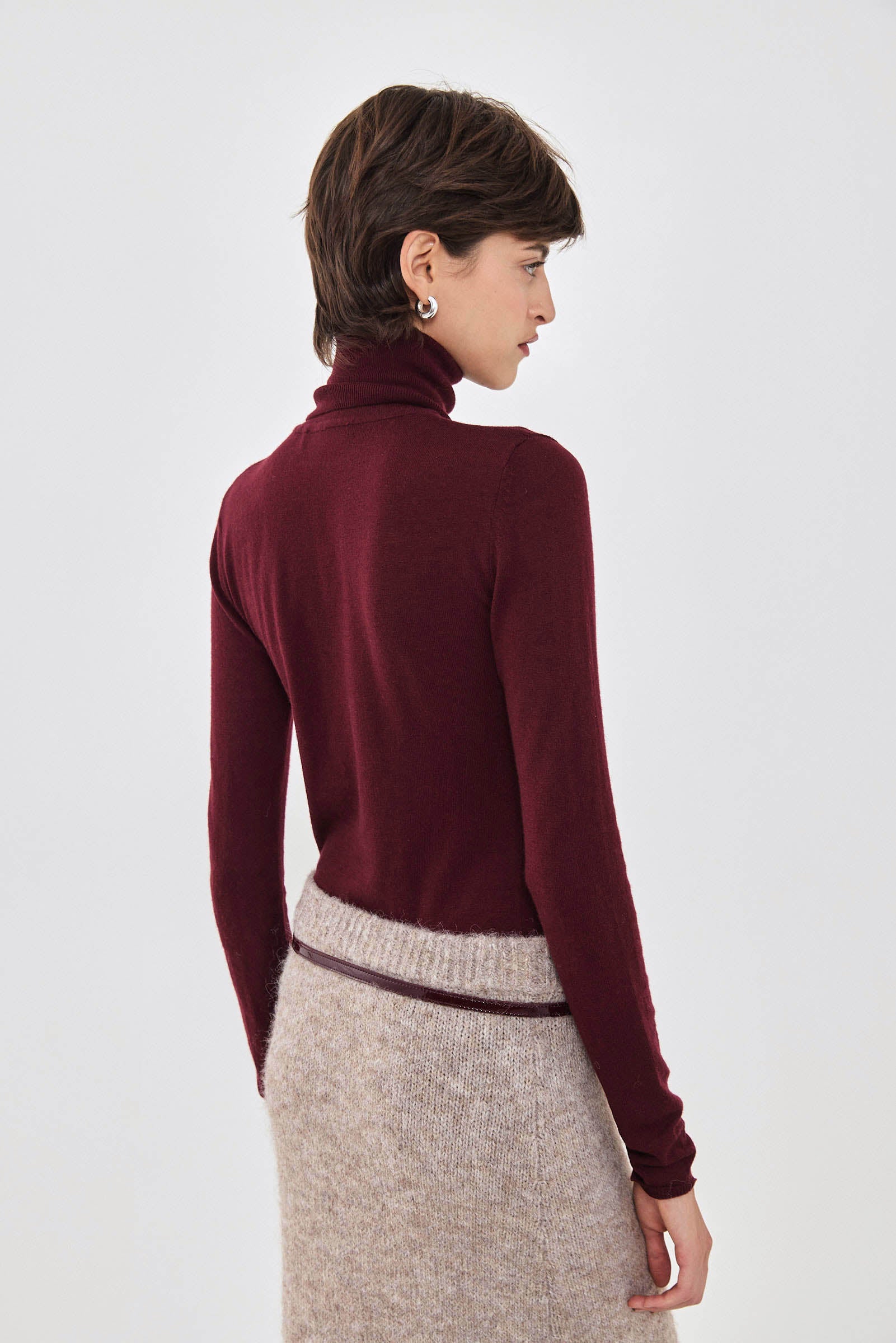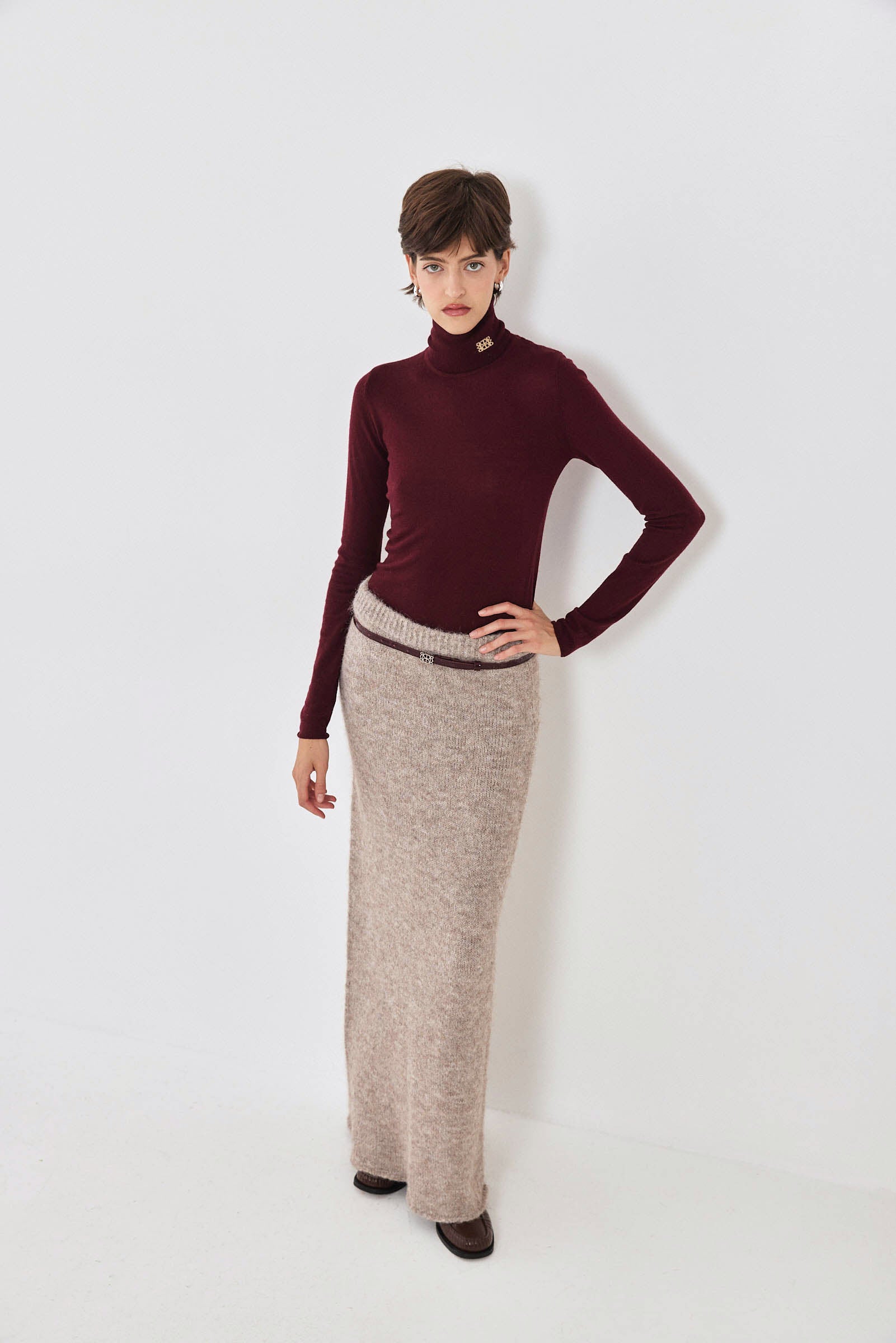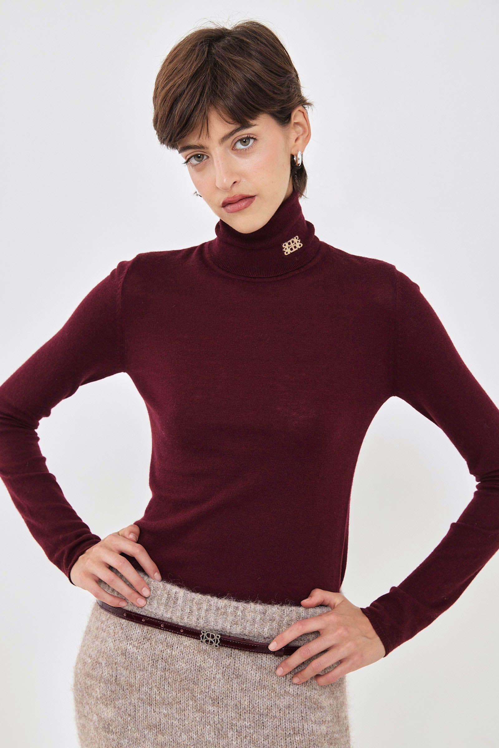 Our new lightweight turtleneck knit is the softest knit you'll ever own. Long sleeves. Delicate contrasting intarsia logo detailing on the collar side. Ribbed finish. Ultra soft knit material. Fitted silhouette. Style it with our high waisted cargo pants, our vegan leather bomber and a pair of our tortoise sunnies for a cool day to night look.