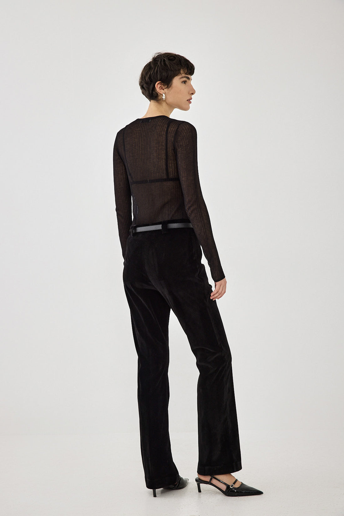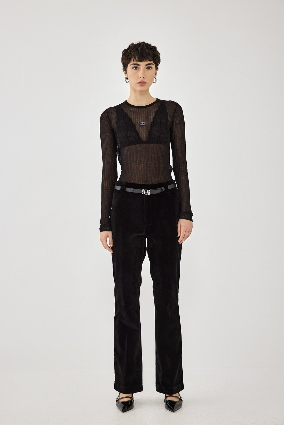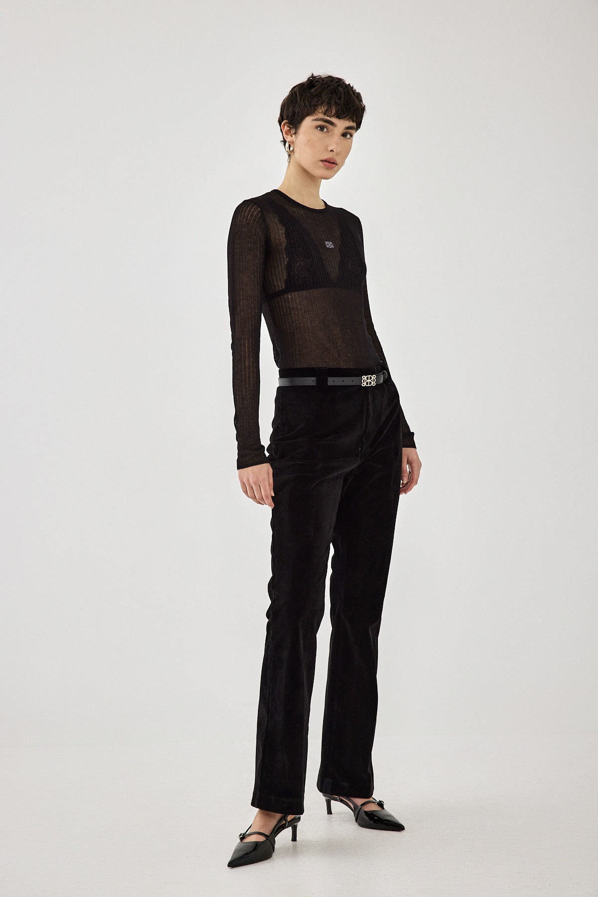 Lightweight knit sheer top. Delicate logo detailing on the front. Crewneck. Long sleeves. Ribbed detailing. The perfect going out top. Style it with your favorite bottoms, a lace bralette underneath and a kitten heel for a stunning going out look, an absolute showstopper.