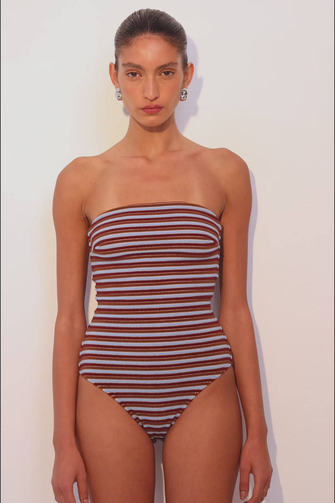 Lily, inspired by the timeless beauty of water flowers, blends effortless sophistication with a sculpting fit. Featuring a vintage-inspired striped pattern for a timeless, retro look. Made from luxurious towel Italian fabric that smooths and enhances your natural curves. Strapless silhouette with delicate dart details on the bust for a refined, contoured look. An internal silicone band along the top and side wiring for an extra grip and support. Classic coverage with a flattering mid-rise cut. Double-lined for comfort and confidence. Features a silver metallic logo detailing on the back. Style it with our new shirred top, our stunning shirred mini skirt and our matching scrunchie for a beautiful beachside look.