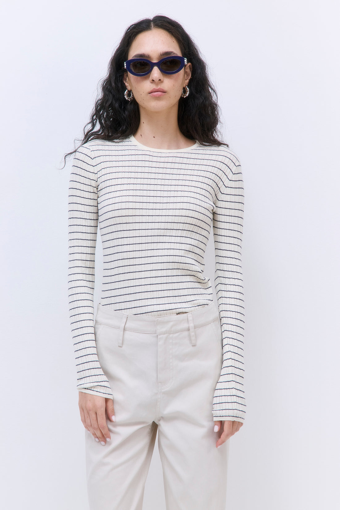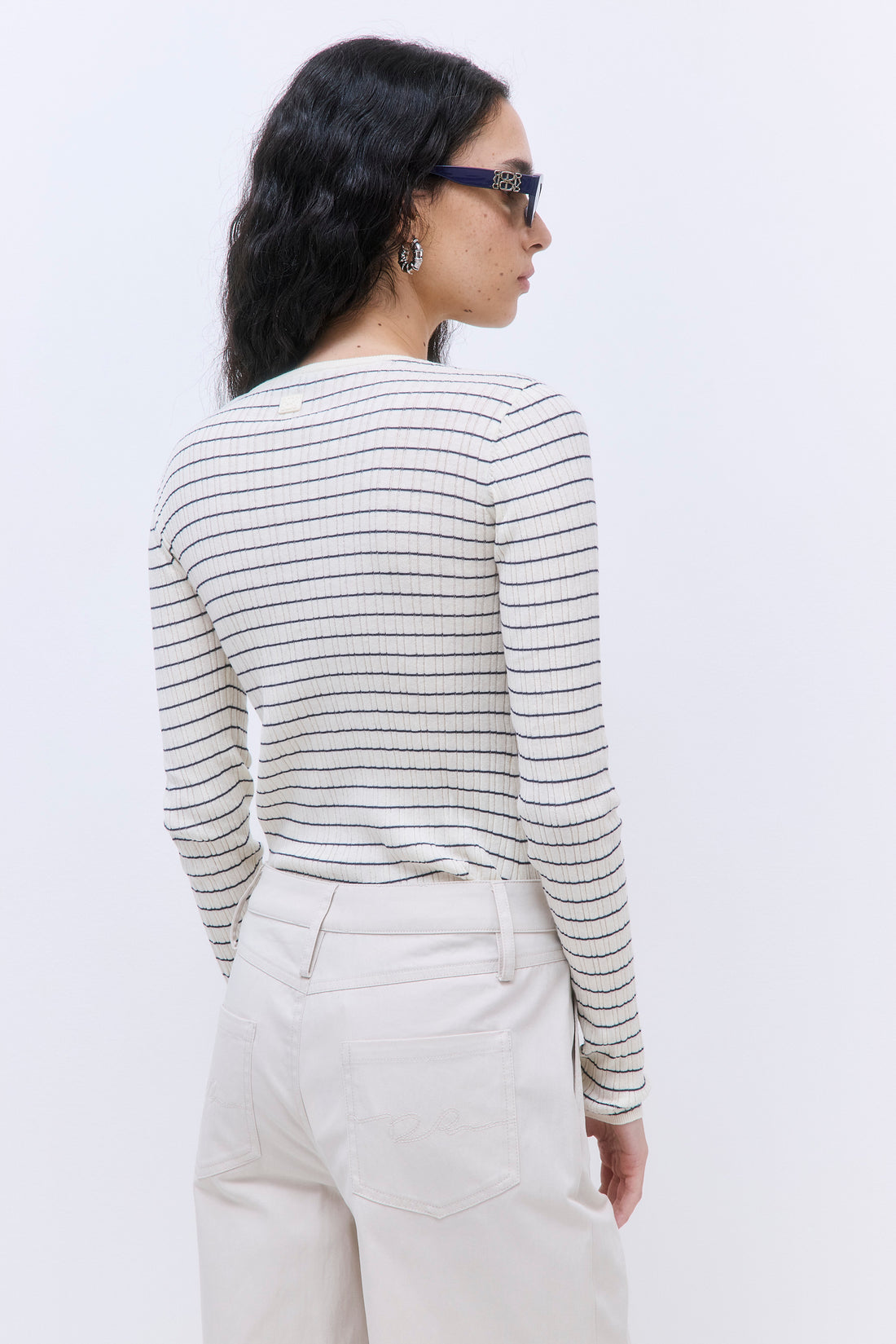 Our new ribbed long sleeved top is the perfect must have this season. Ultra-soft lightweight ribbed fabric. Contrasting ribbed finish. Features a crew neckline. Embossed silicone logo on the neckline's back. Fitted silhouette. Style it with our effortless Micro Mini Skirt and our Classic Chino Cap for the ultimate summer-to-fall look.
