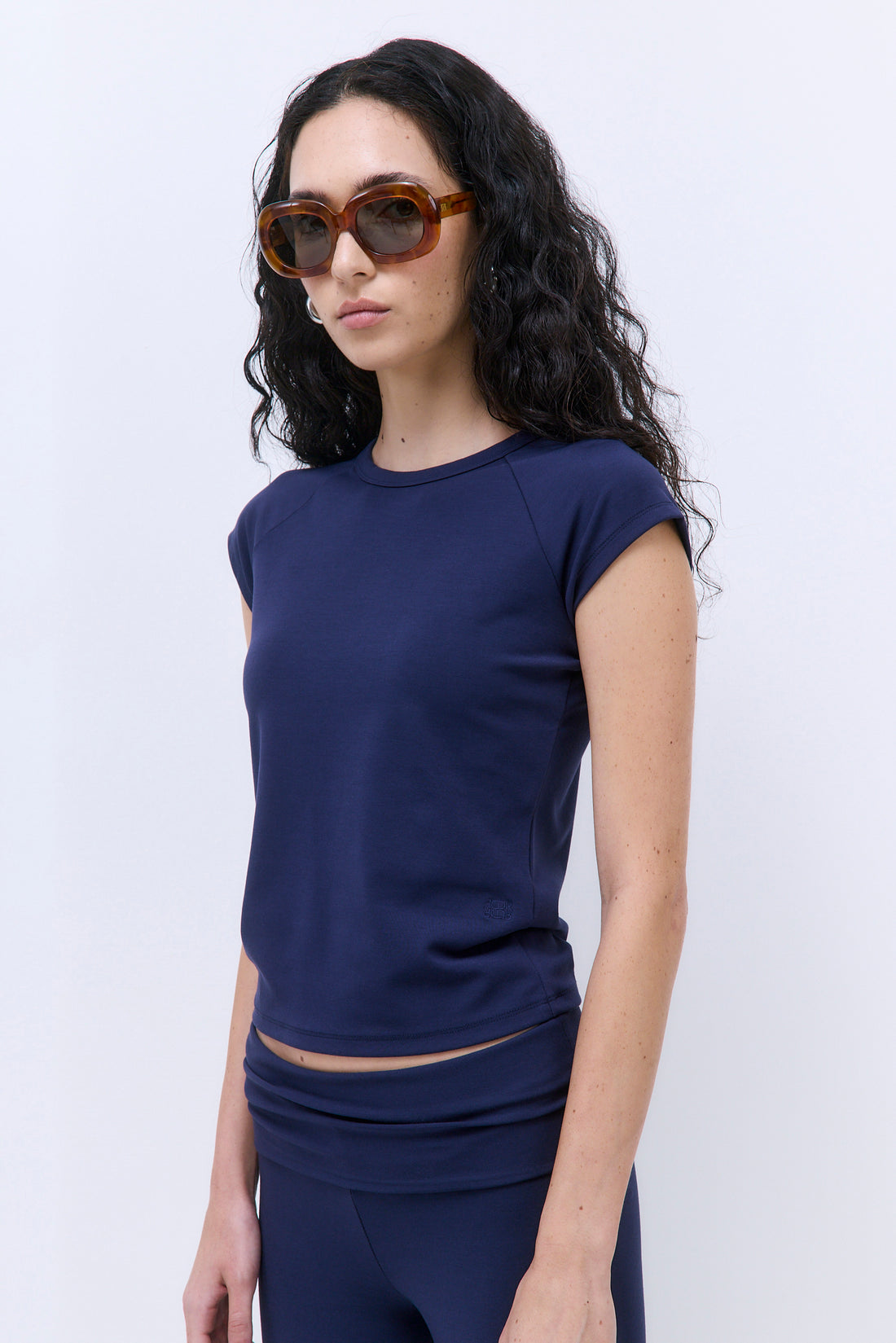 Our Lounge wear T-Shirt if the softest layer you'll slip into. Crafted from buttery, body-hugging fabric. Slim fit. Crew neckline. Raglan cap sleeves. Tonal logo embroidered on the front side. Style it with our matching Lounge Flared Pants and Double Breasted Cropped Trench Coat for ultimate comfort and an effortless vibe.