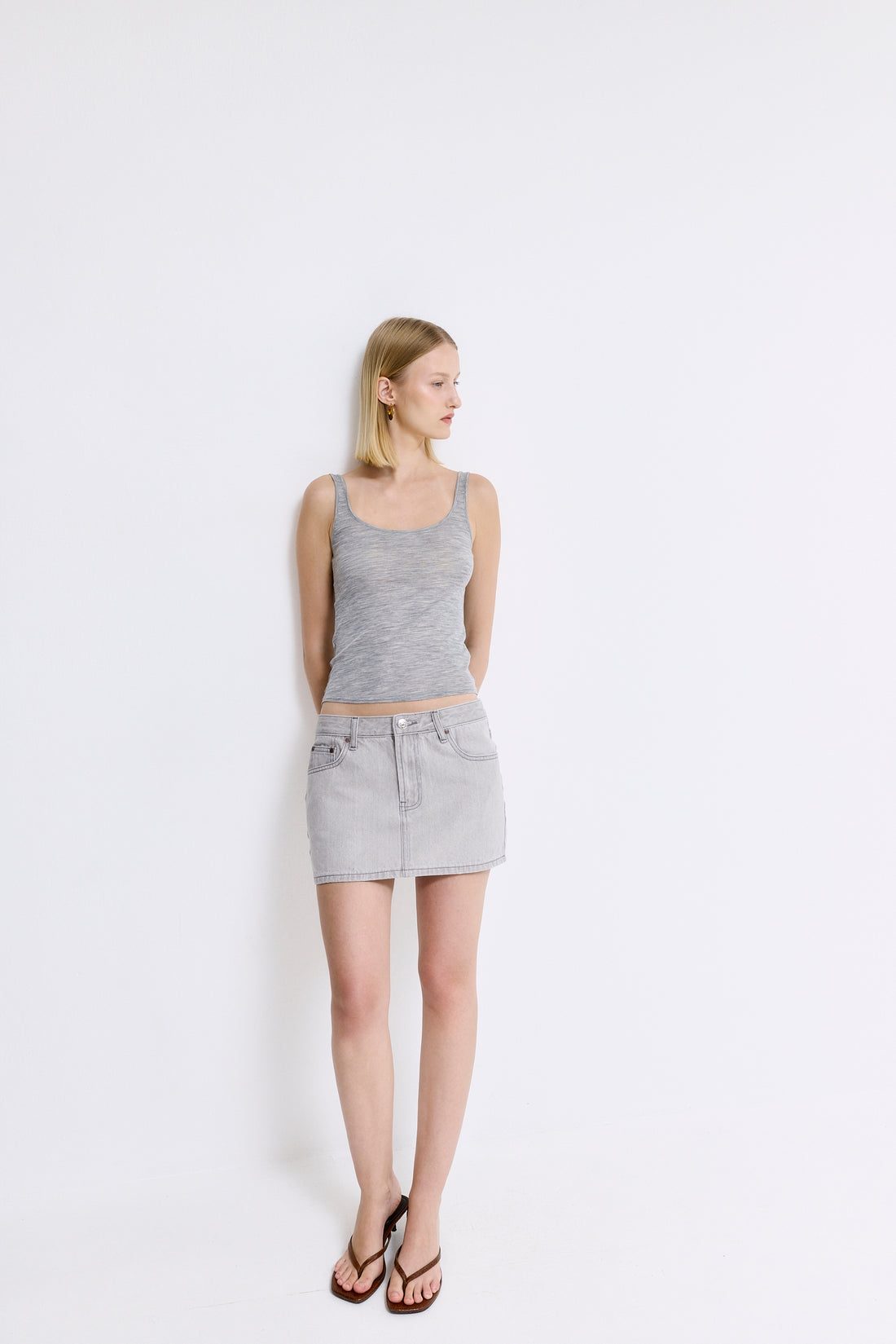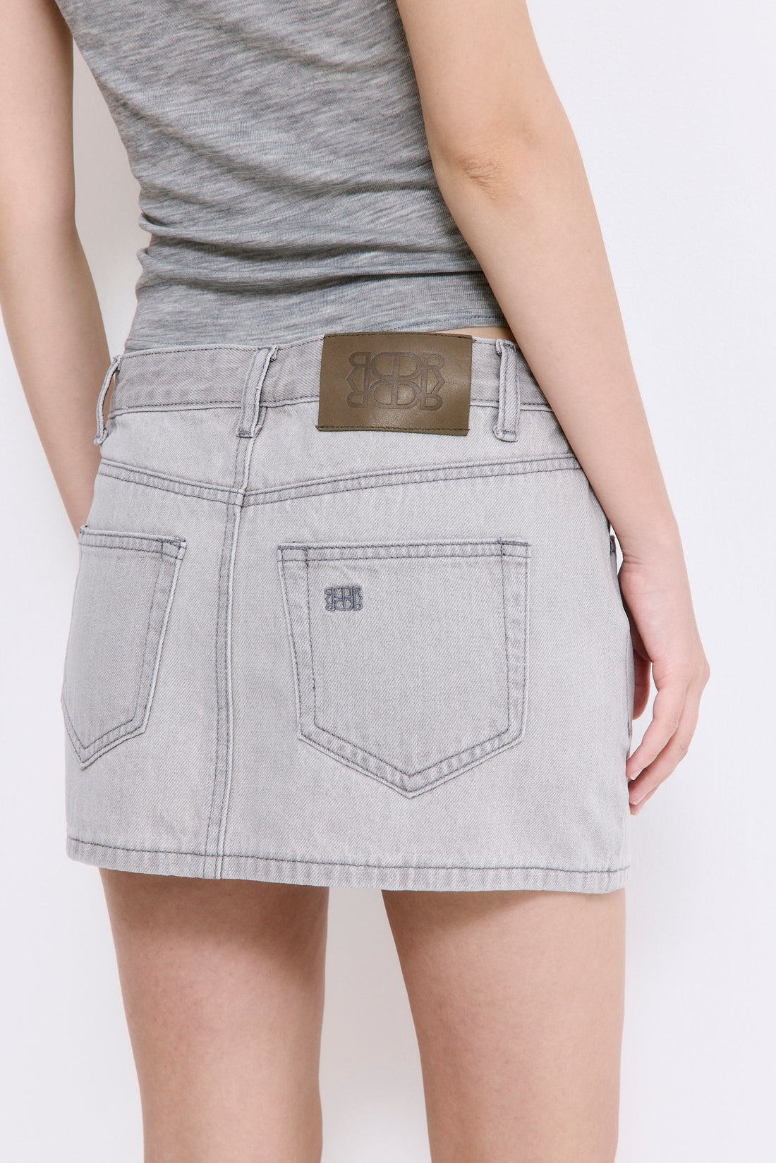 The perfect low-rise denim mini skirt. Features belt loops and a frontal zipper closure. Clean finish. Featuring two front pockets and two back pockets. Luxurious leather logo patch on the back. Contrasted logo embroidered detailed on the back pocket. Style it with our new logo sheered top, our croco belt and our classy Yvon shpulder bag for the perfect look.