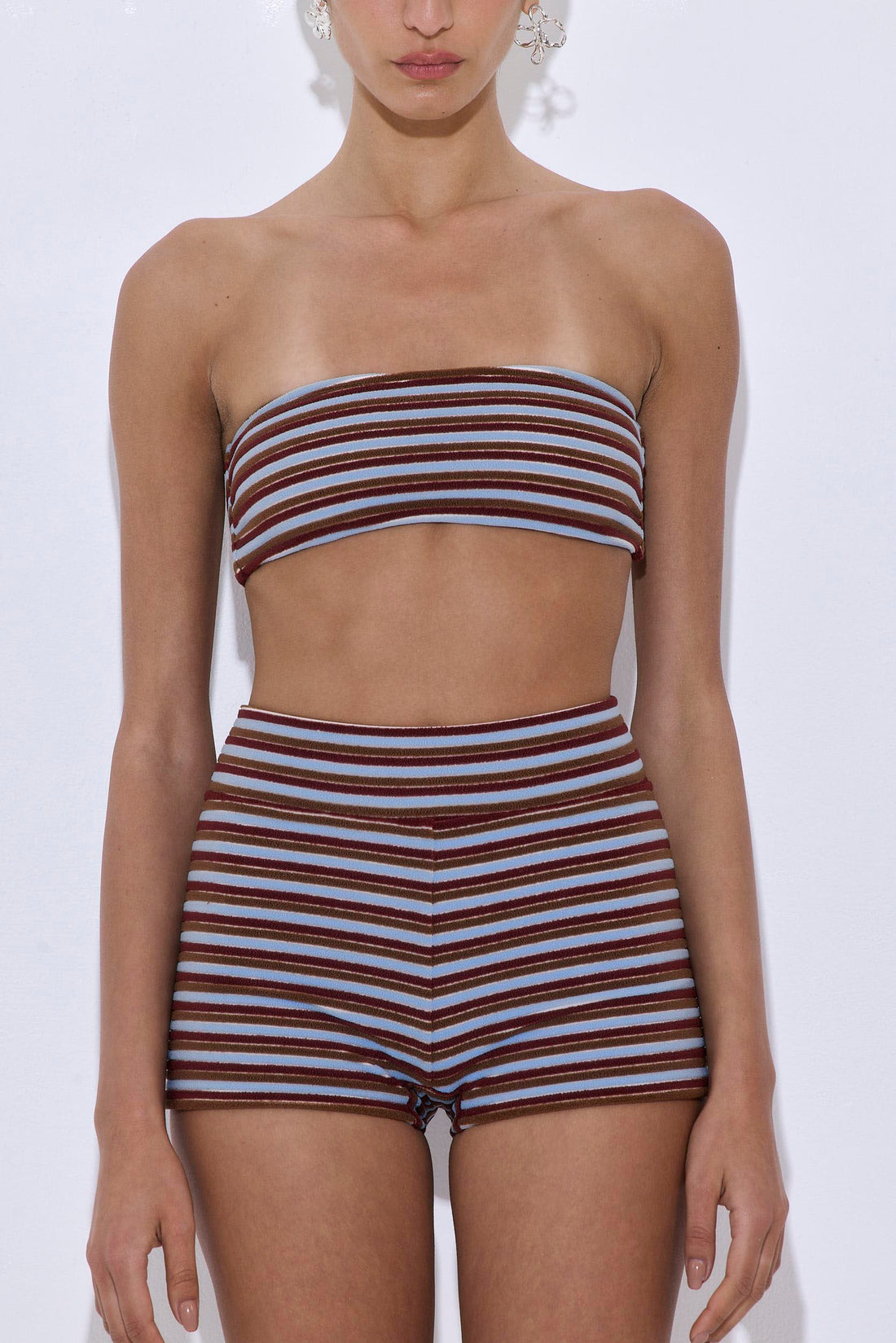 Mendeis, named after a mystical water nymph who guarded hidden springs, channels bold femininity with a playful twist. High-waisted in soft luxurious towel fabric. Stretchy, textured material for a snug and comfy fit. Featuring a vintage-inspired striped pattern for a timeless, retro look. Elastic waistband for secure hold. Clean finish. Cheeky cut. Lined. Can be used both in and out water. Water-friendly and versatile for everyday wear. Subtle metallic logo detail on the front side. Style it with our Petra top, our beautiful sarong and our new mini crochet bag.