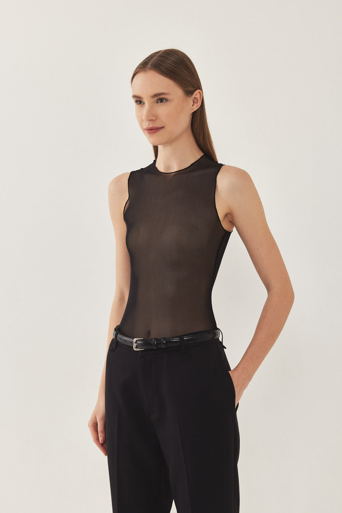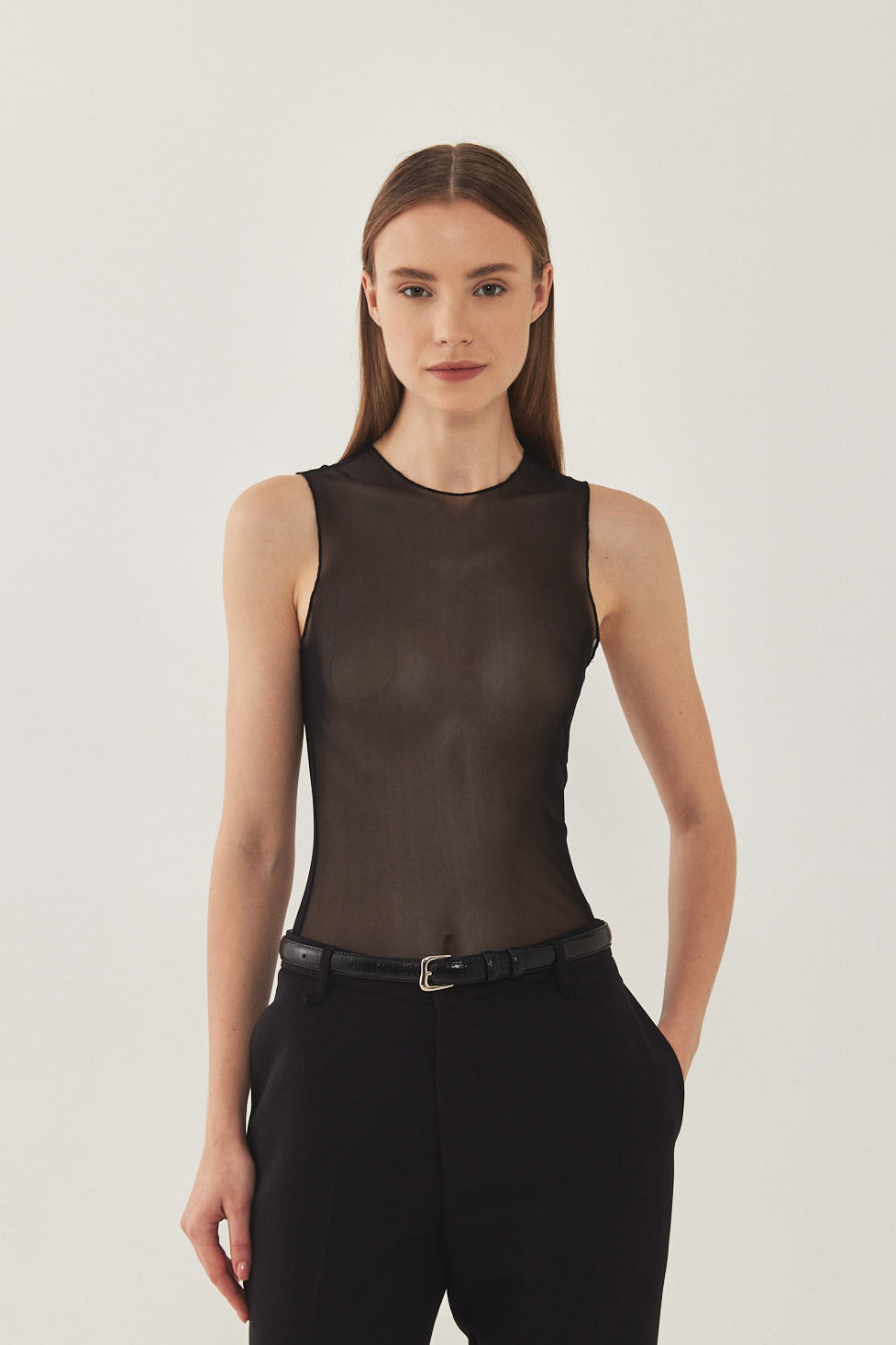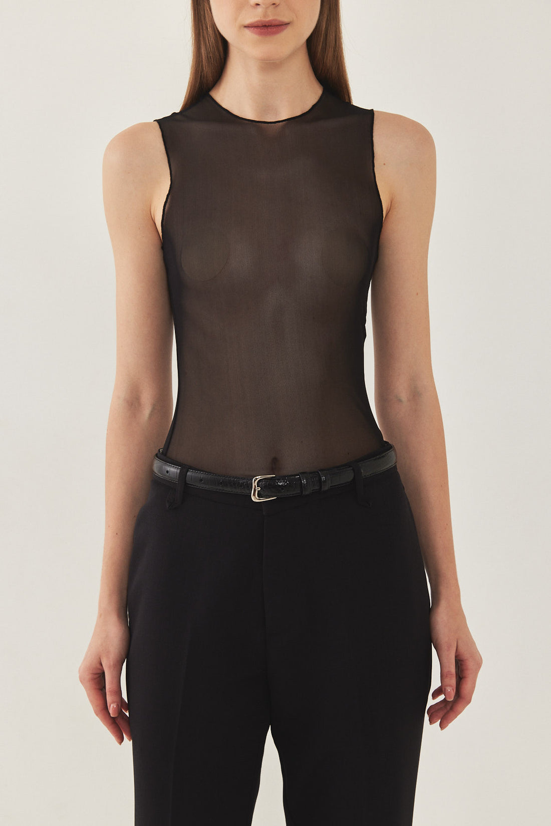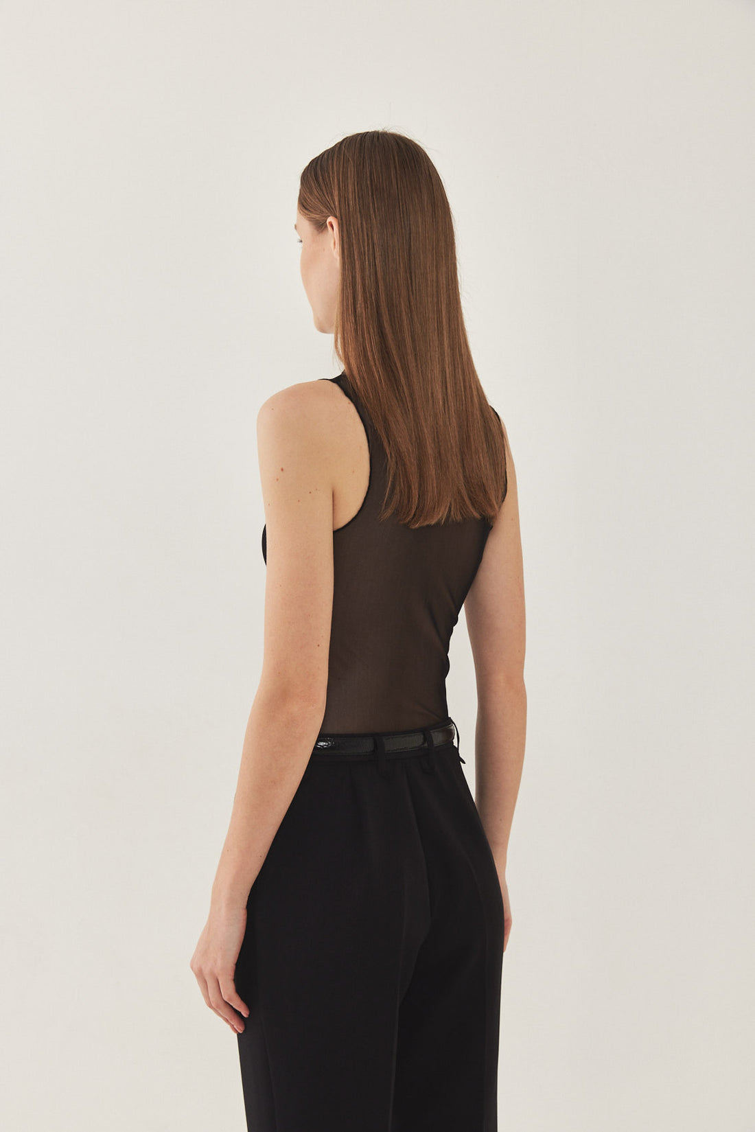 A lightweight printed DR logo mesh muscle T. Features a crew neckline and a close fit. See-through mesh fabric with a delicate baby-lock finish. Style it with a pair of daddy pants and our belt for a stylish evening look.