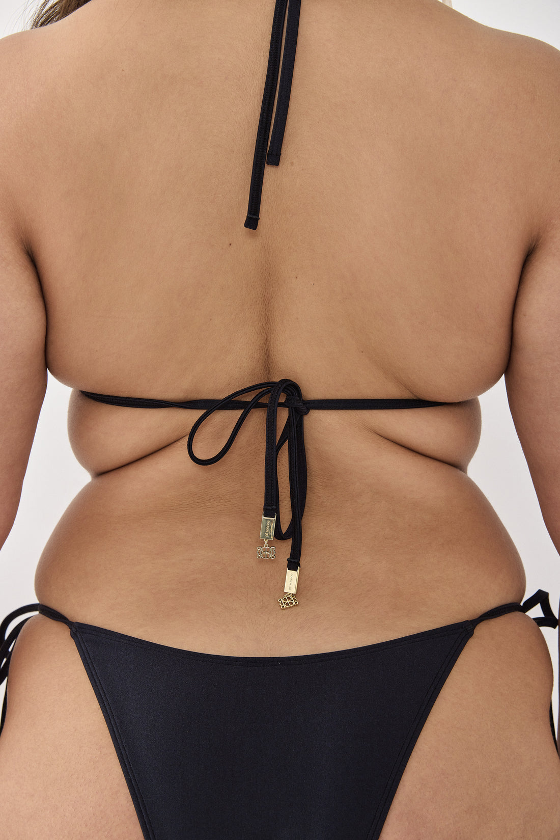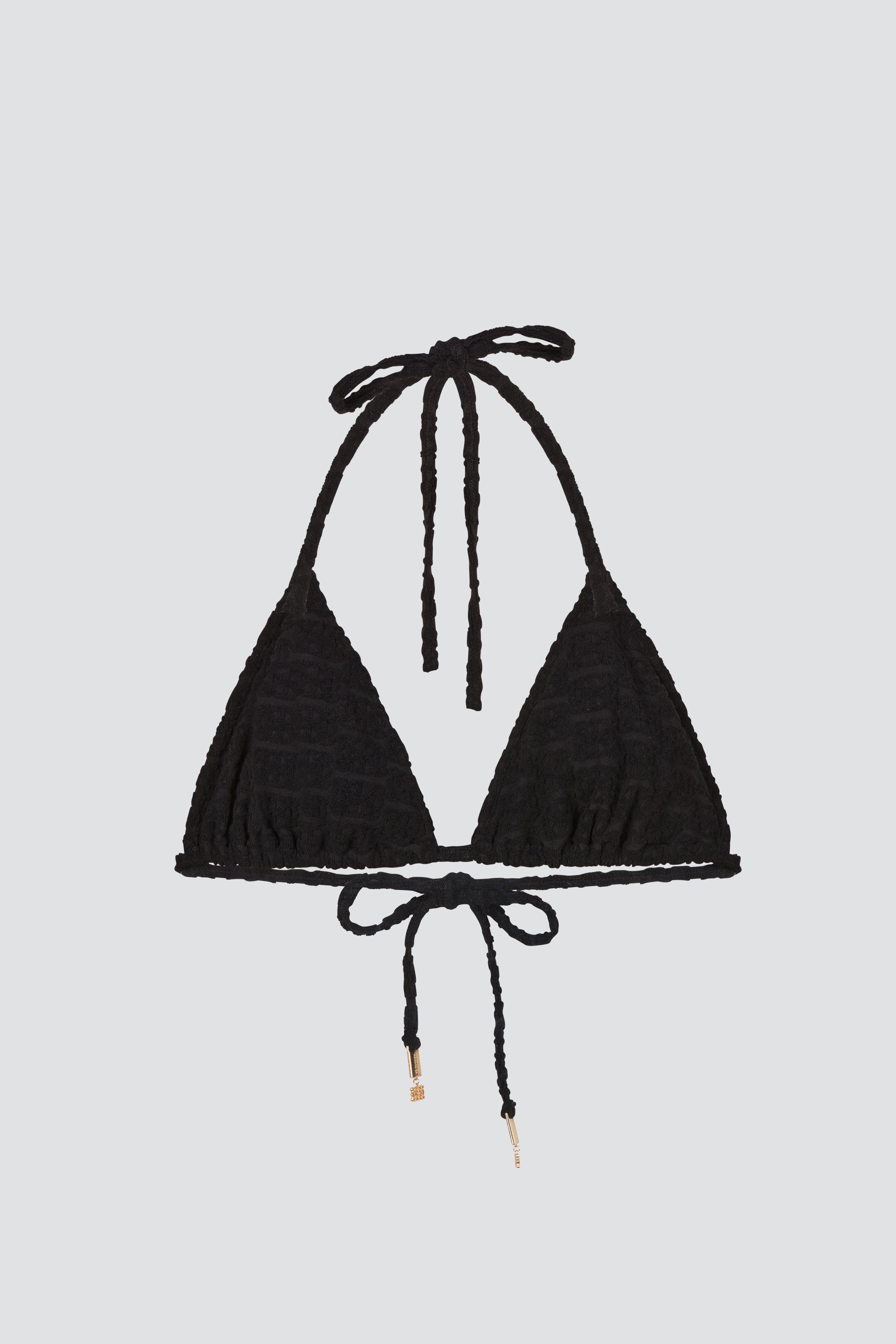 Mi manchi means I miss you in Italian. Made from luxurious soft Italian fabric that is ultra flattering and body hugging. Towel fabric tonal logo detailing. Classic and minimal triangle bikini top. The ultimate top for tanning. Features golden logo pendants on the ends of the bottom straps. Lined. The triangles have slight gathering detailing. Lose straps, making the top highly versatile. Can be tied in an endless amount of ways. Style it with your favorite bikini bottom, our crochet maxi skirt and your favorite slides for the most stylish poolside look.